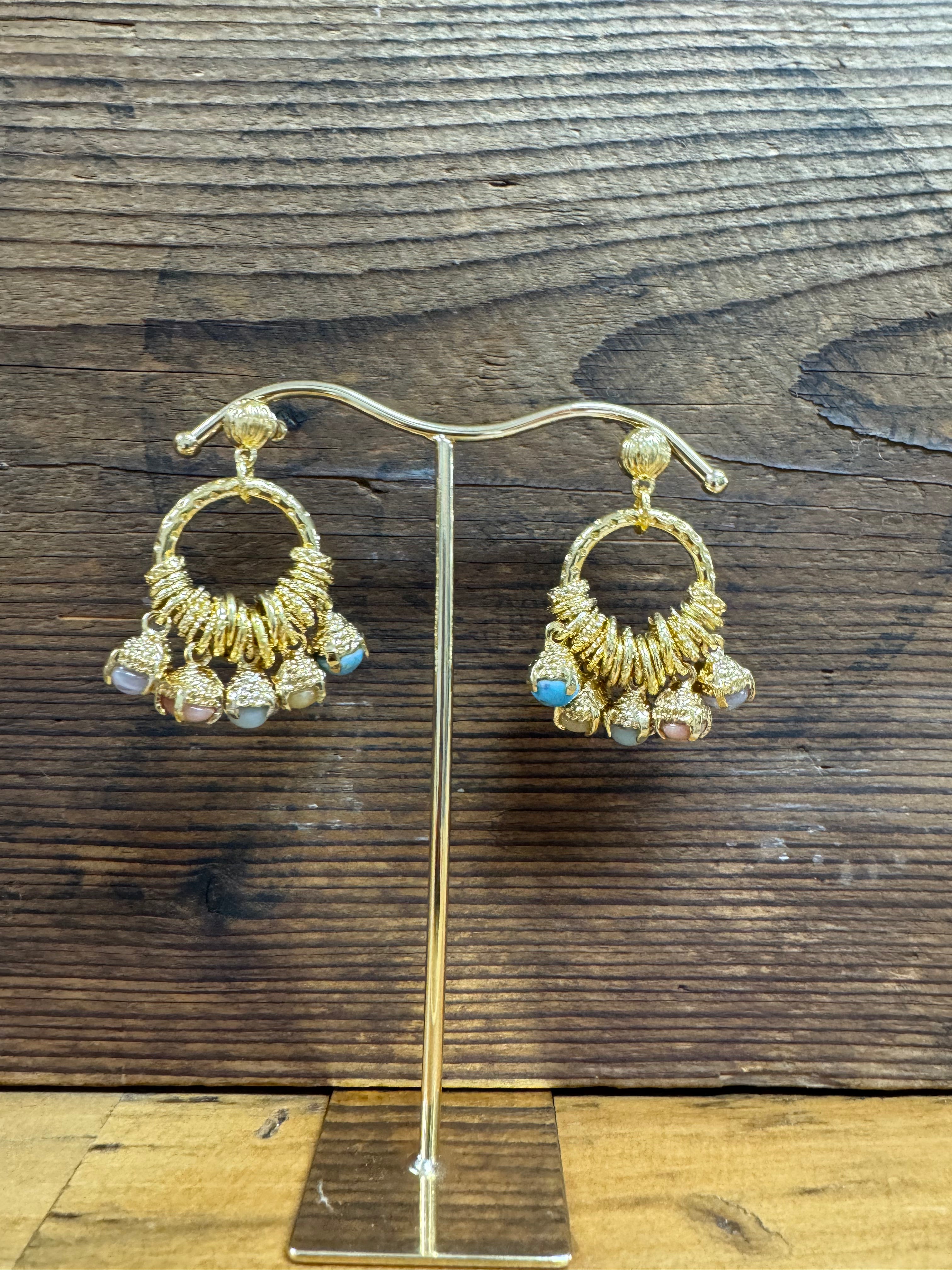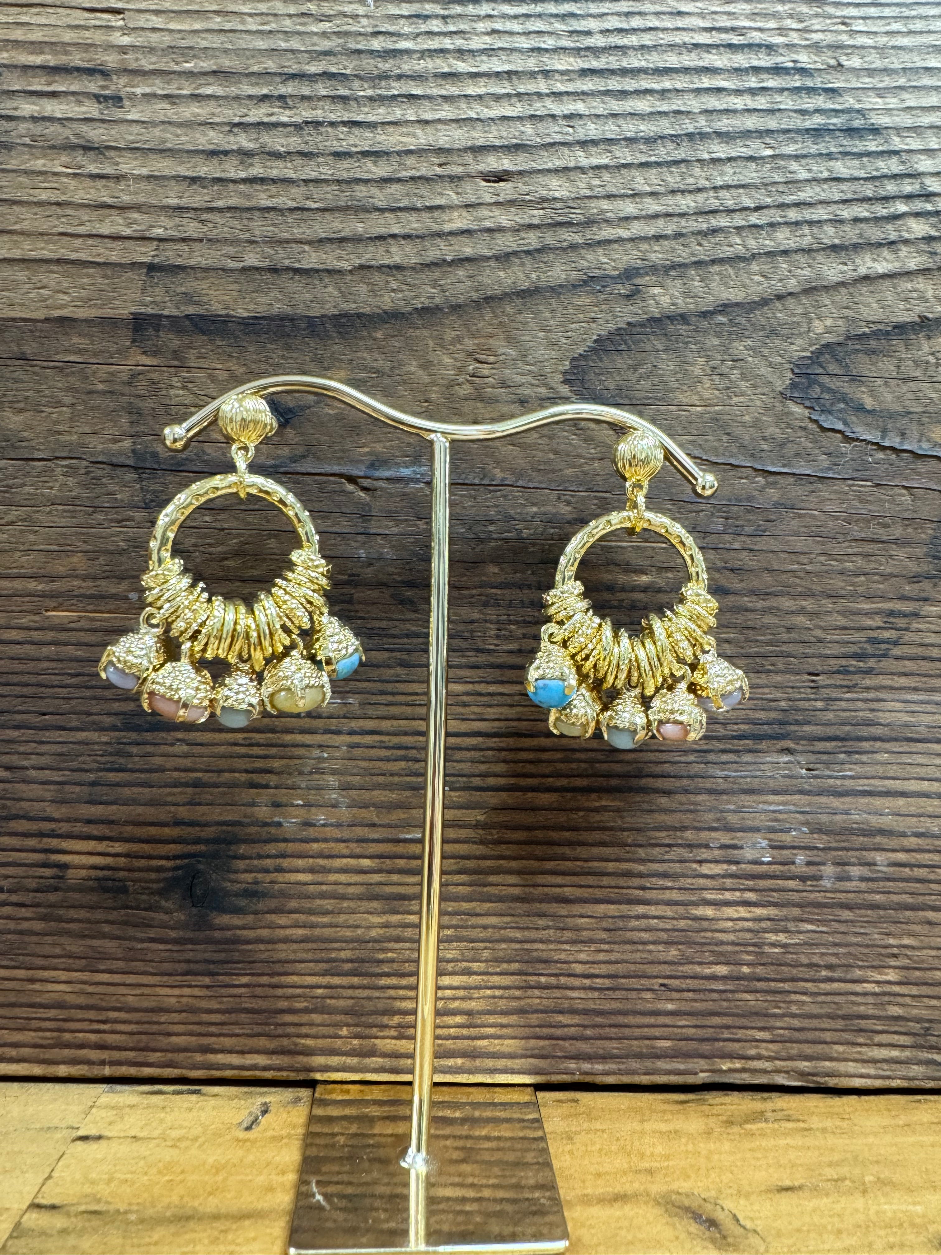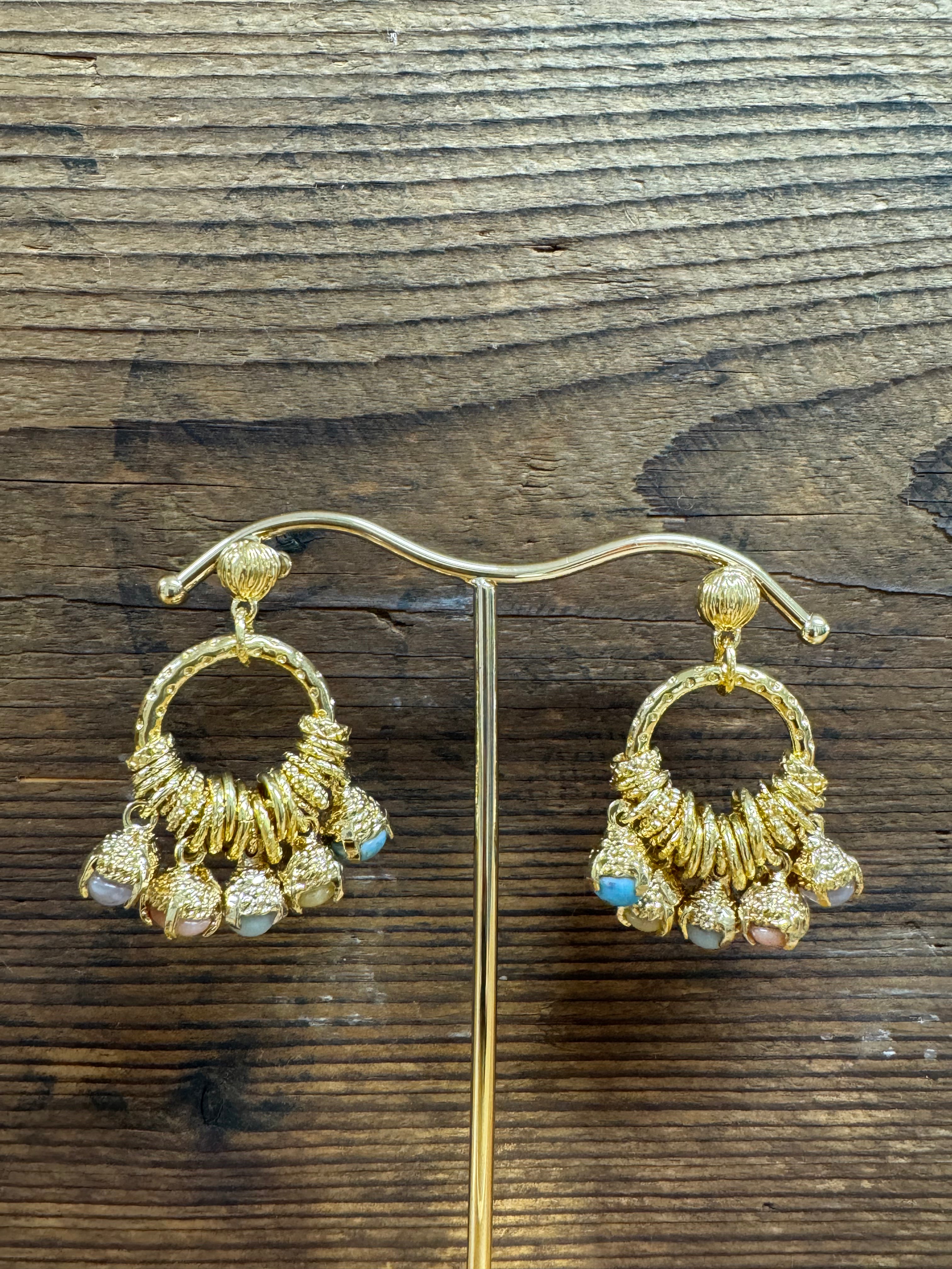 Gold plated earrings, set with five colored glass stones and hammered hoops.