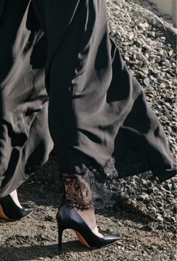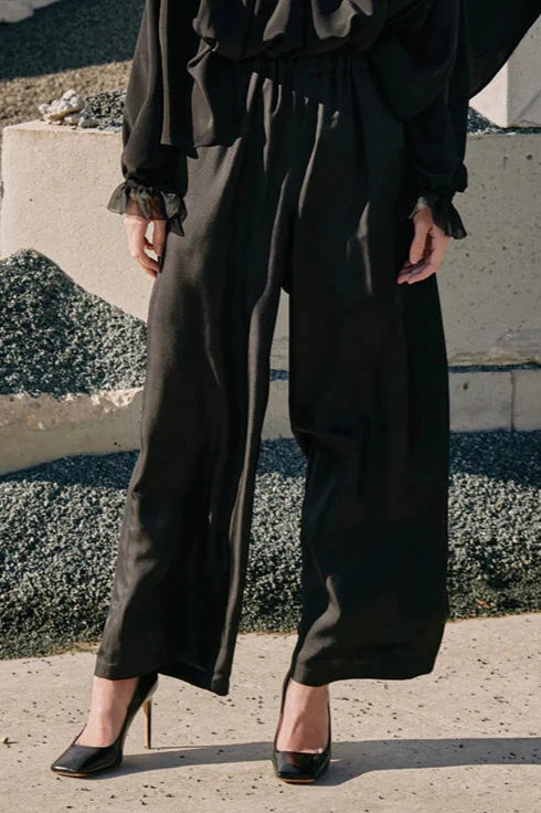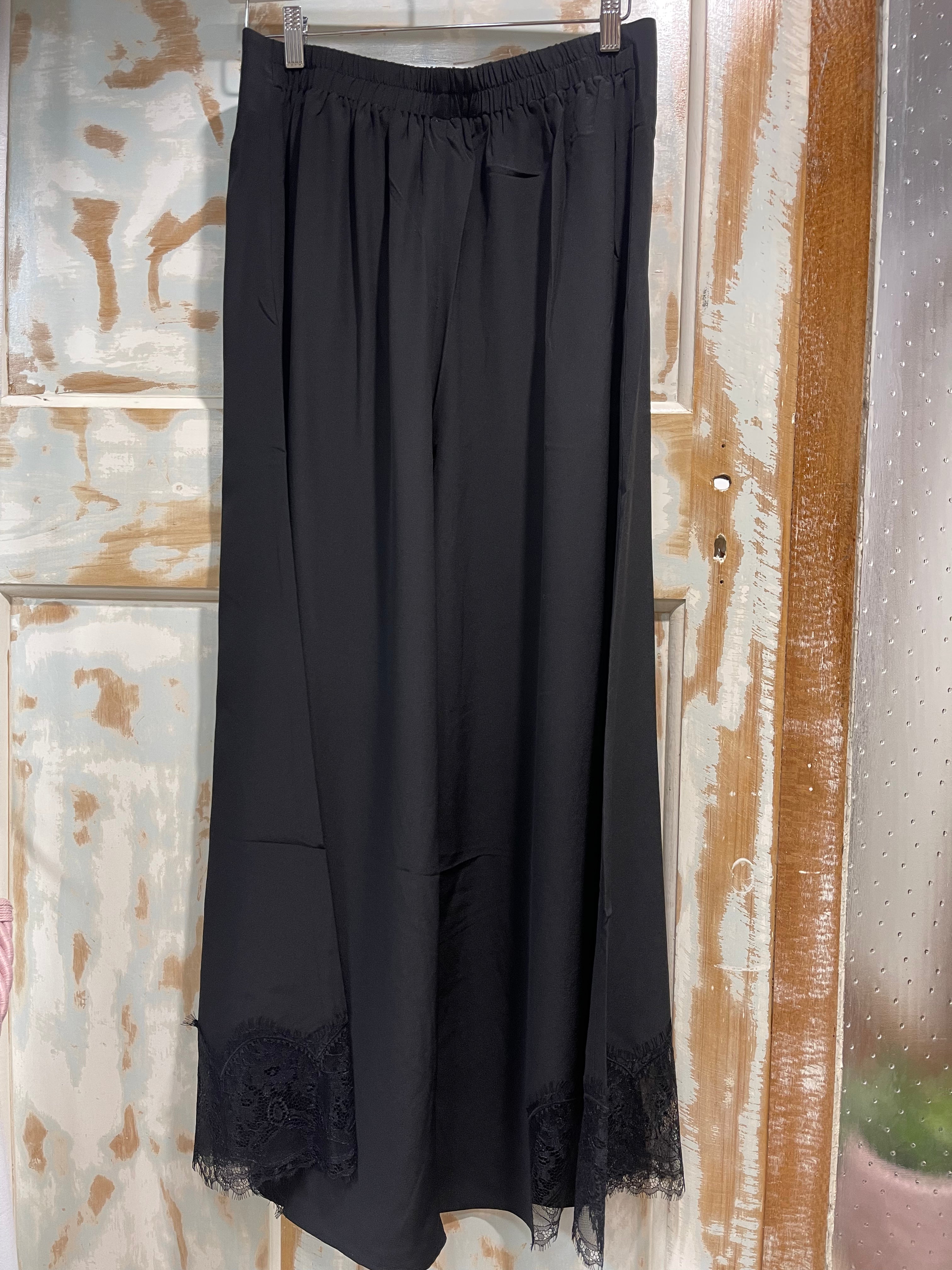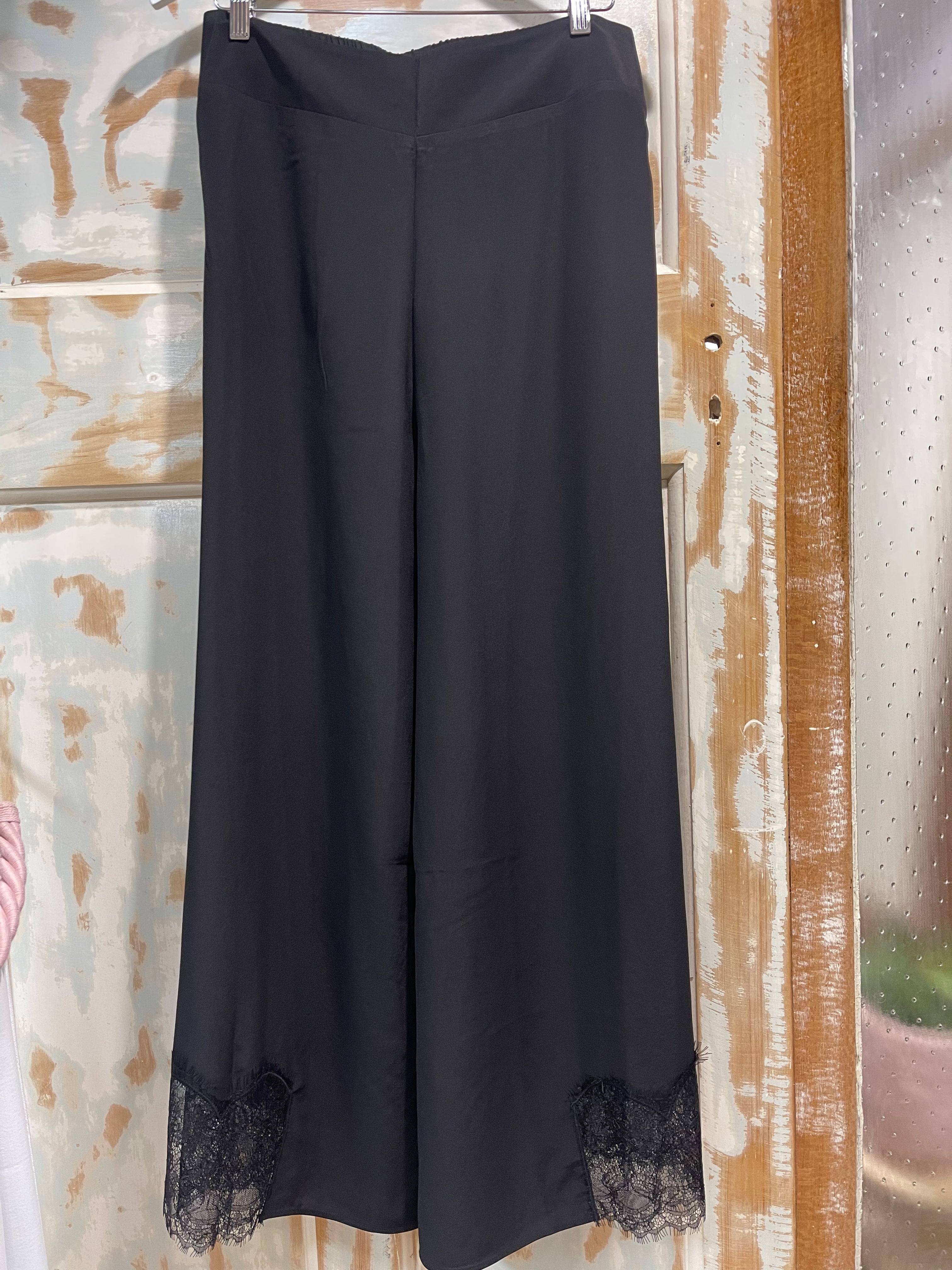 Elevate your style with these luxurious DOTARA black silk pants. Featuring delicate lace trim, they are perfect for any event. Feel glamorous and confident with these flowy, elegant pants. Embrace the sophistication and versatility of the DOTARA pants for any occasion.