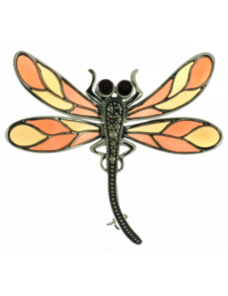Sterling silver dragonfly brooch. Set with marcasite. Two tone orange enamel wings. Red enamel in the eyes. Size 35mm x 45mm