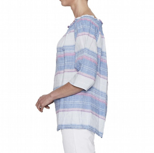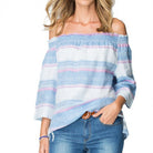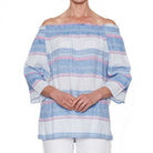 The Multi Stripe Linen Top by Hammock & Vine is a quality linen top featuring a shirred neckline so as to be worn either off the shoulder or on.