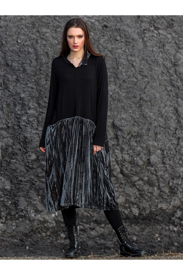 Beautiful long-sleeved dress, black and grey. The upper part is slightly elasticated with very original collar (short in black in one side, shirt collar in grey velvet in the other), bottom in grey structured velvet with matching bias at the waist.