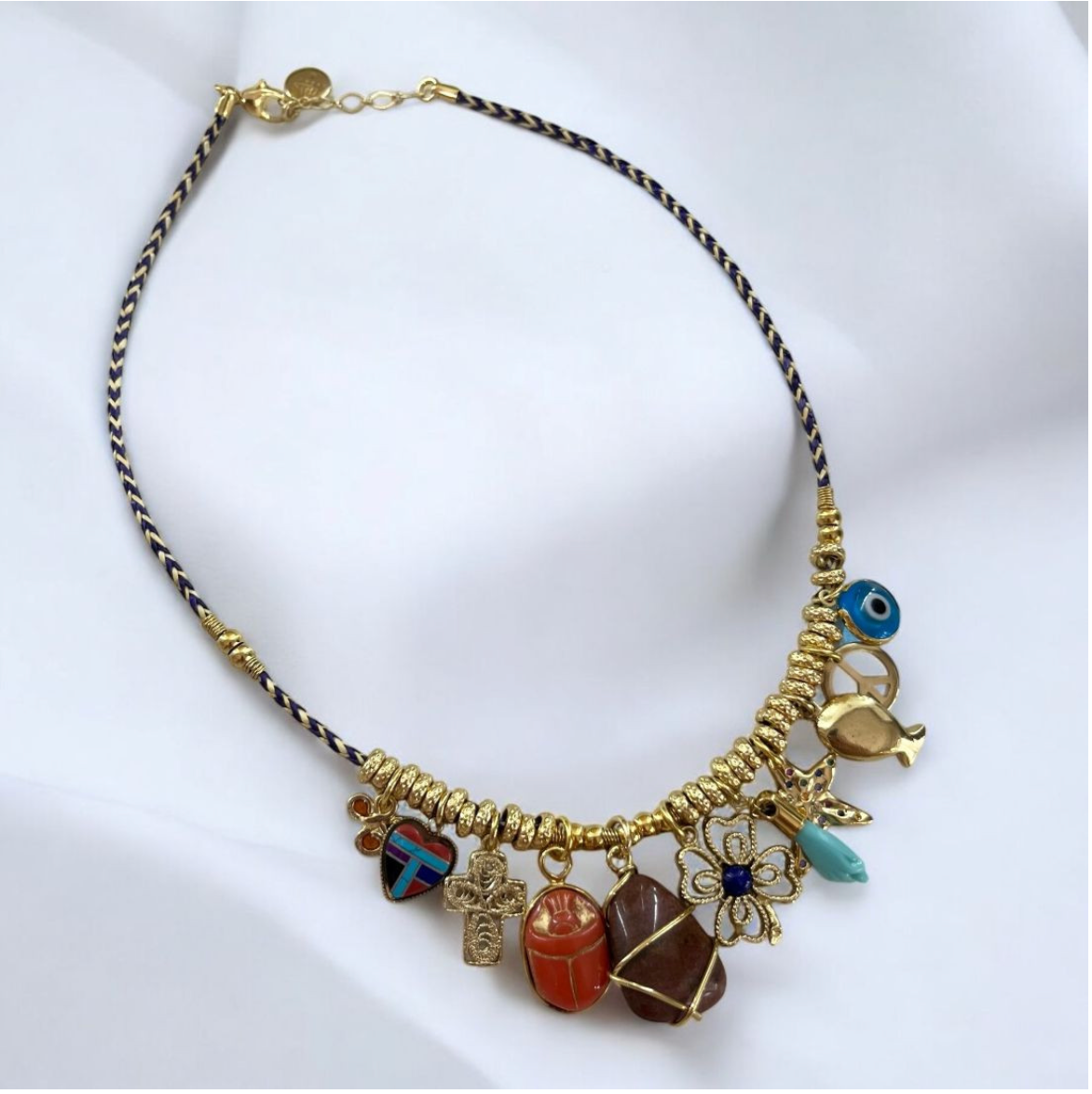 Gold-plated chocker necklace composed with a braided colored raffia and gold plated threads, rings and charms.