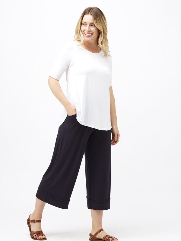 Tani Elbow Swing Tee Black #S 79 765 is designed with a longer sleeve than the Tani Swing Tee #S 79375 that covers all your arm from the elbow to the shoulder. The “swing fit” a range intended to embrace your curves, is a perfect choice as it softens your tummy and sides drawing attention up to your bust and smiling face. The generous swing cut sits off the hip area over pants waistband but can also be worn tucked in.