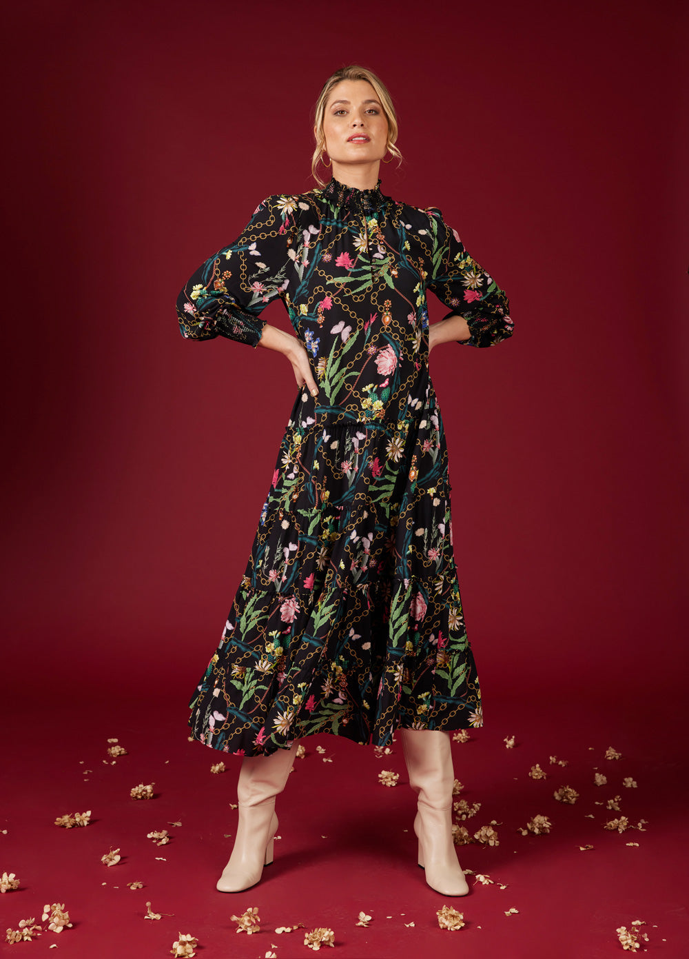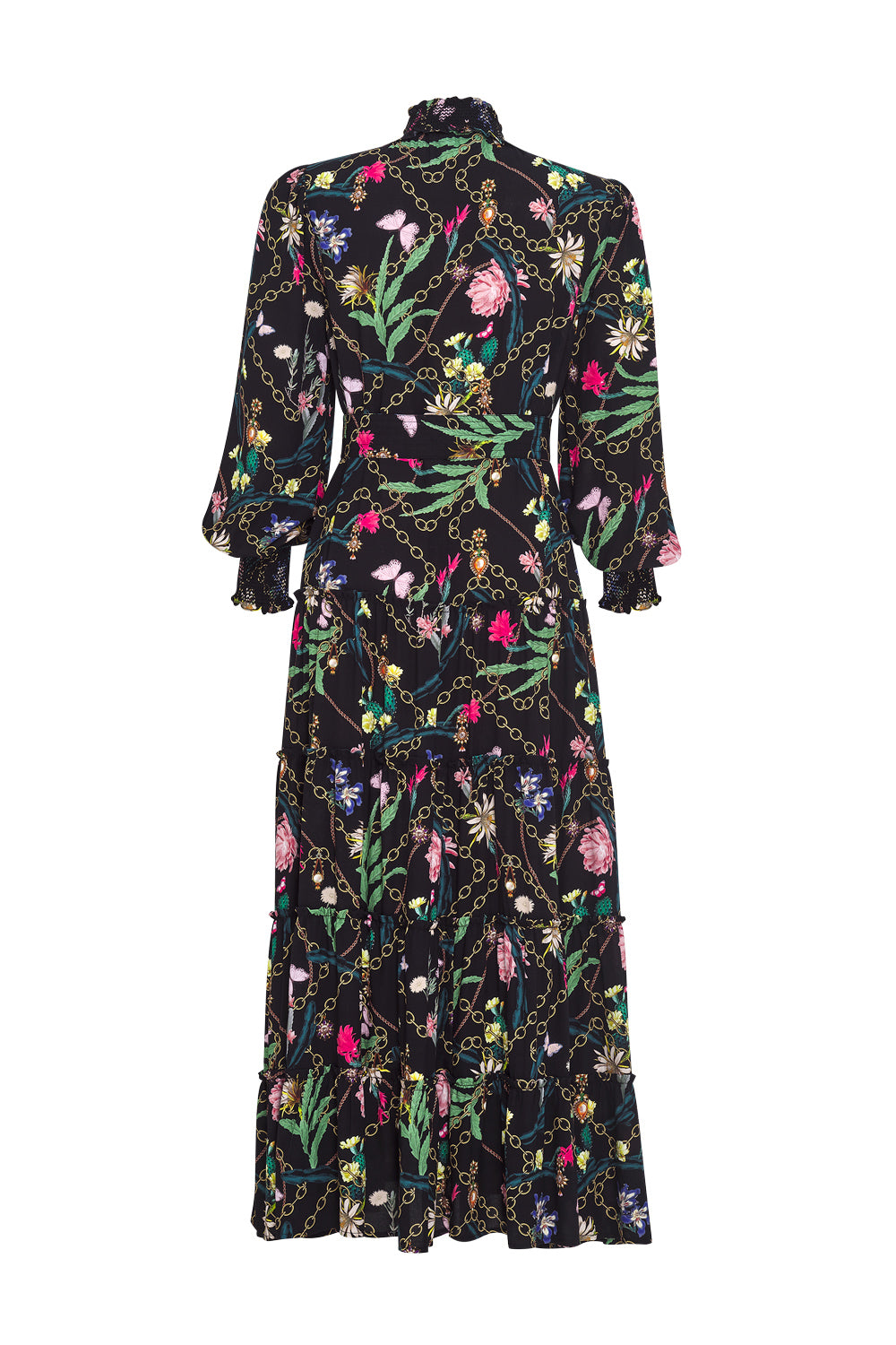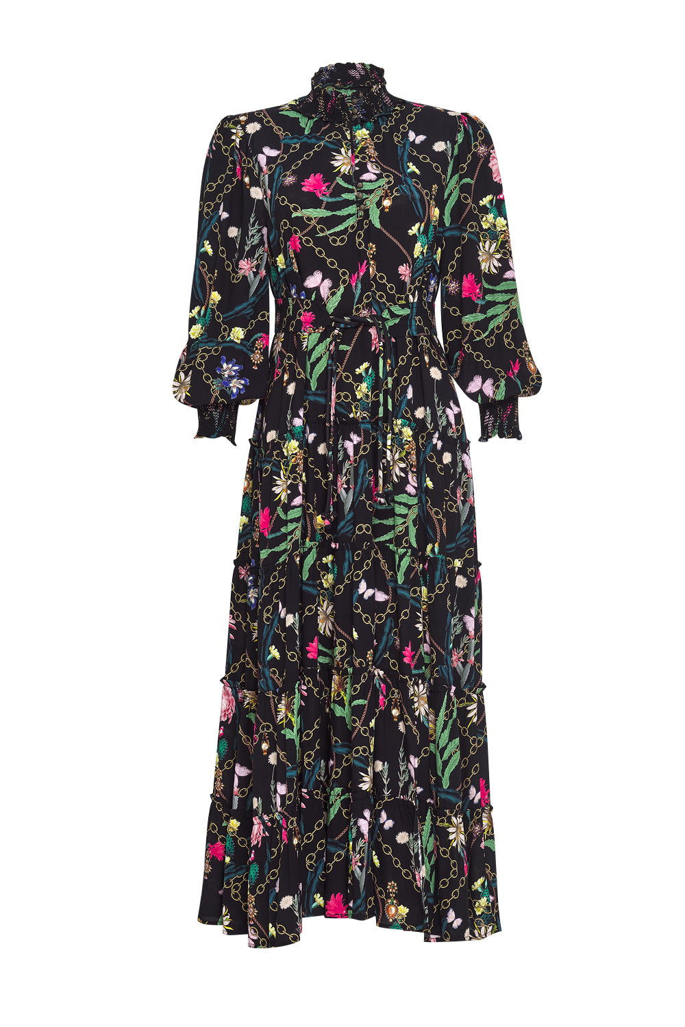 Tiered midi dress with a smocked stand-up collar with antique brass buttons that can be worn open or done up creating a high neckline, featuring exposed ruffle tier seams with a front split. Includes matching printed fabric belt with tie ends.