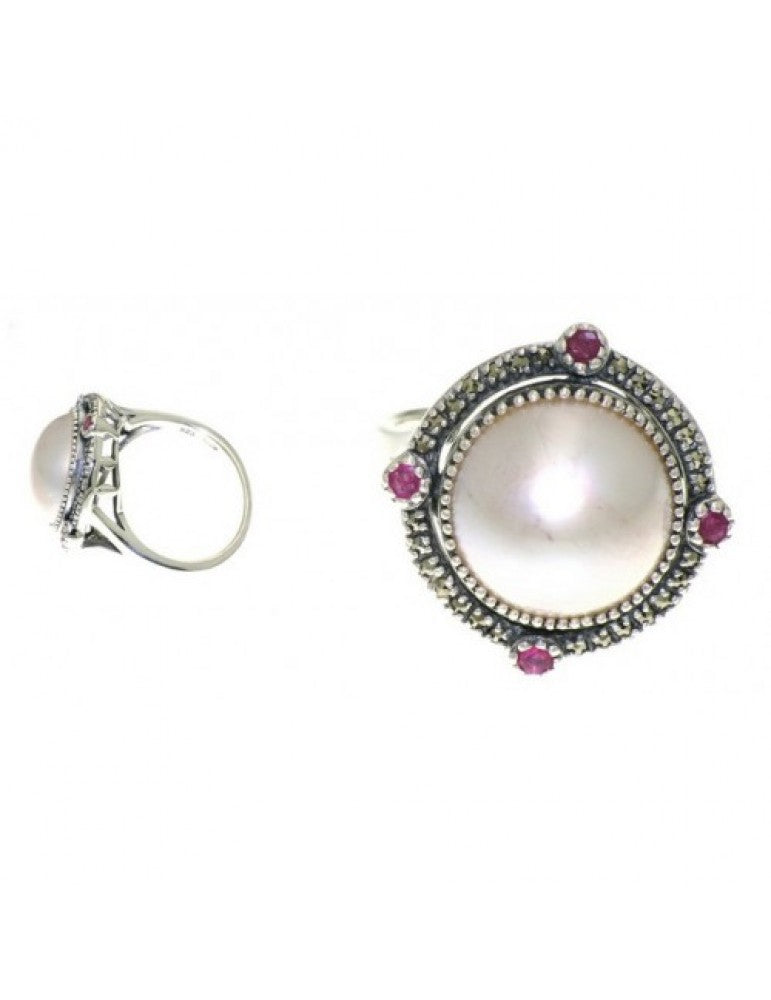Features 12mm round freshwater mabe pearl, 2mm rubies set around mabe.