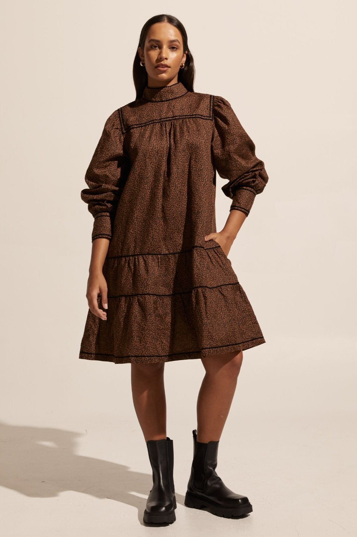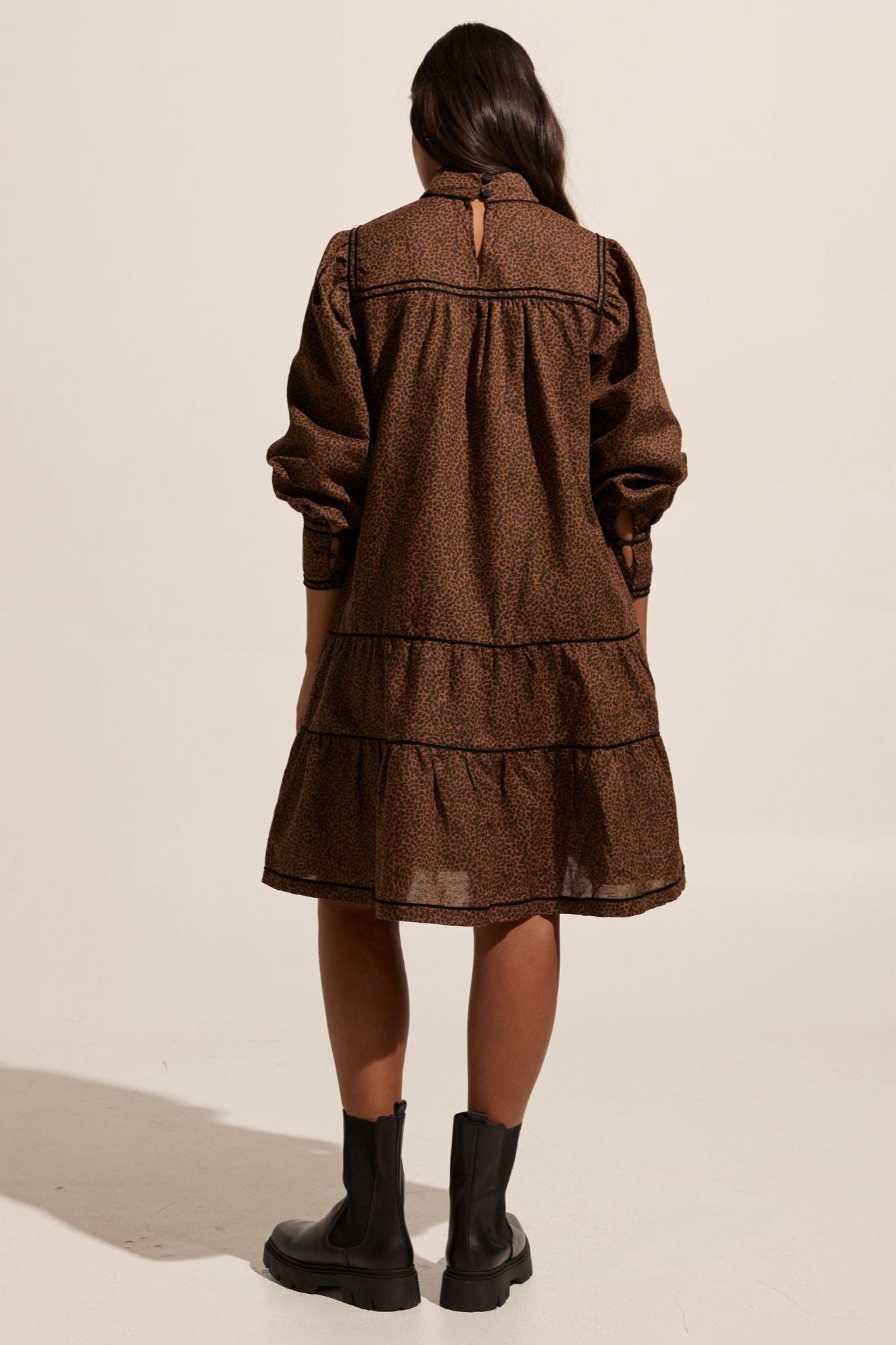 Inspired by winter wandering, the Prowess Dress by Zoe Kratzmann is a modern take on the classic smock dress. Crafted in a luxurious linen blend this piece has a polished and elevated air. Playful tiers are finished with fine velvet trim and a high neckline lends a dramatic edge. Wear yours with a chunky ankle boot for on-point autumn style.