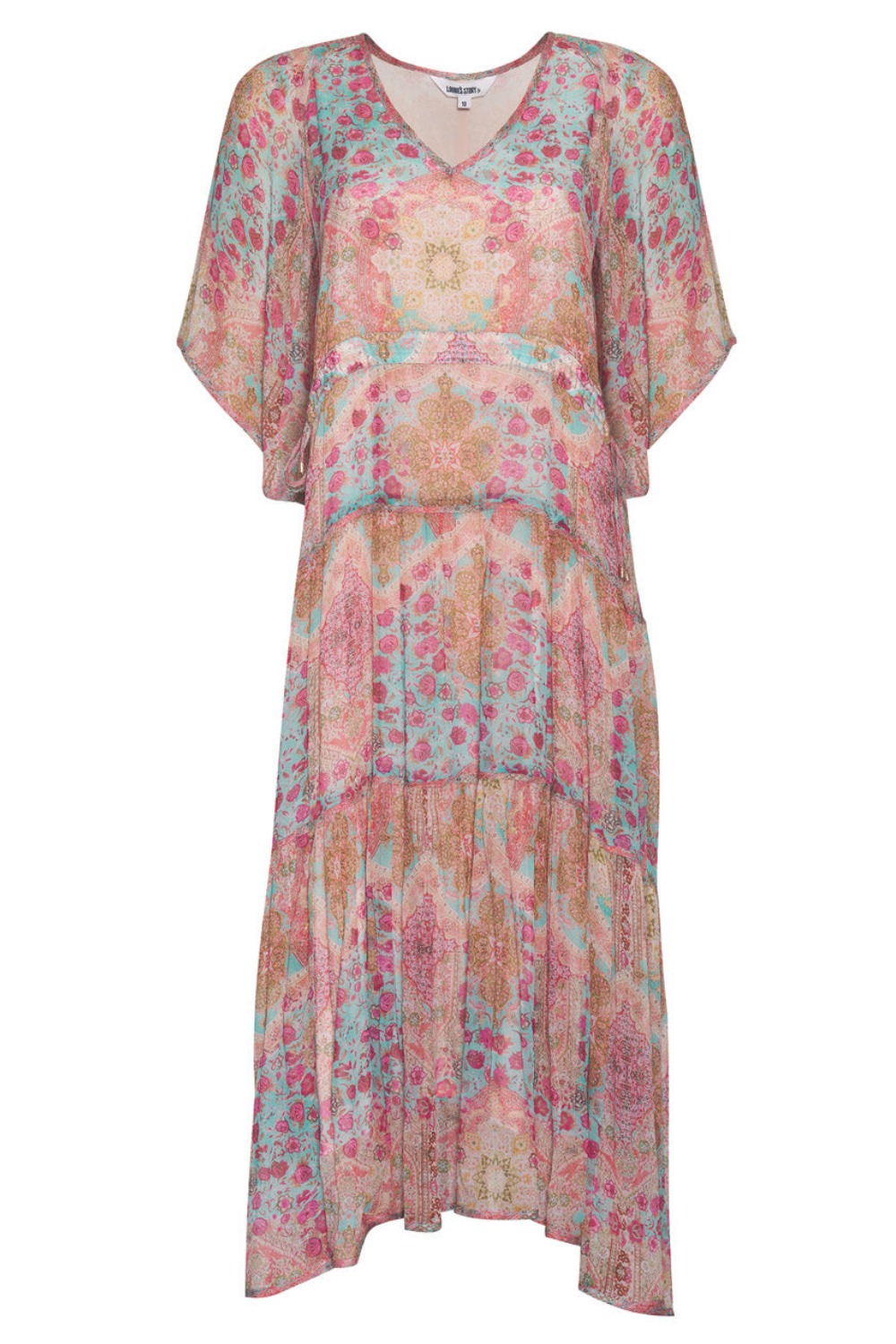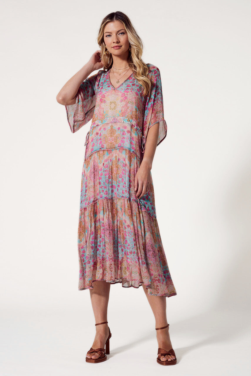 Tiered midi dress with a V-neckline, floaty sleeves and dual drawstring detail at front waist with self fabric ties. Featuring