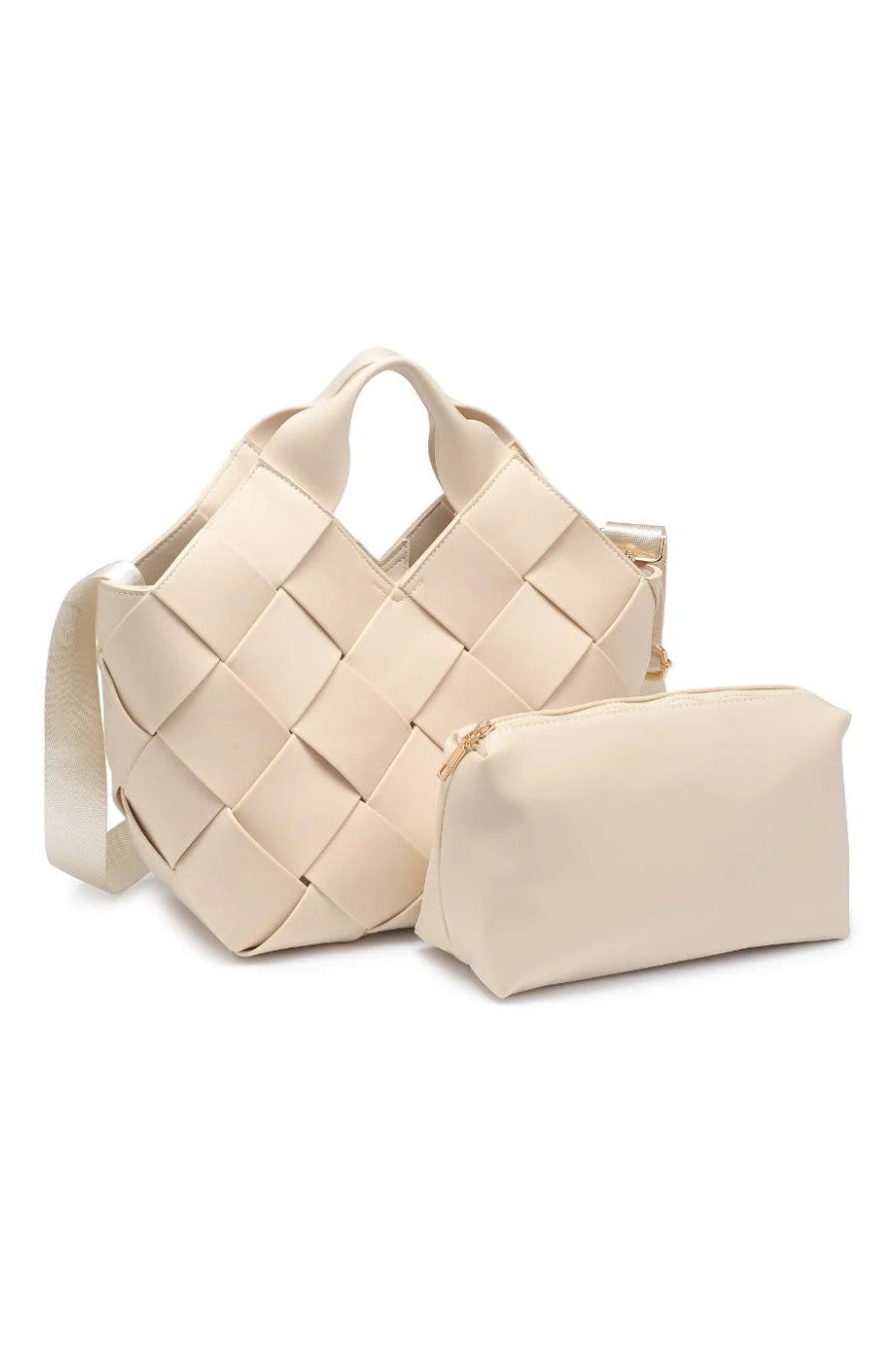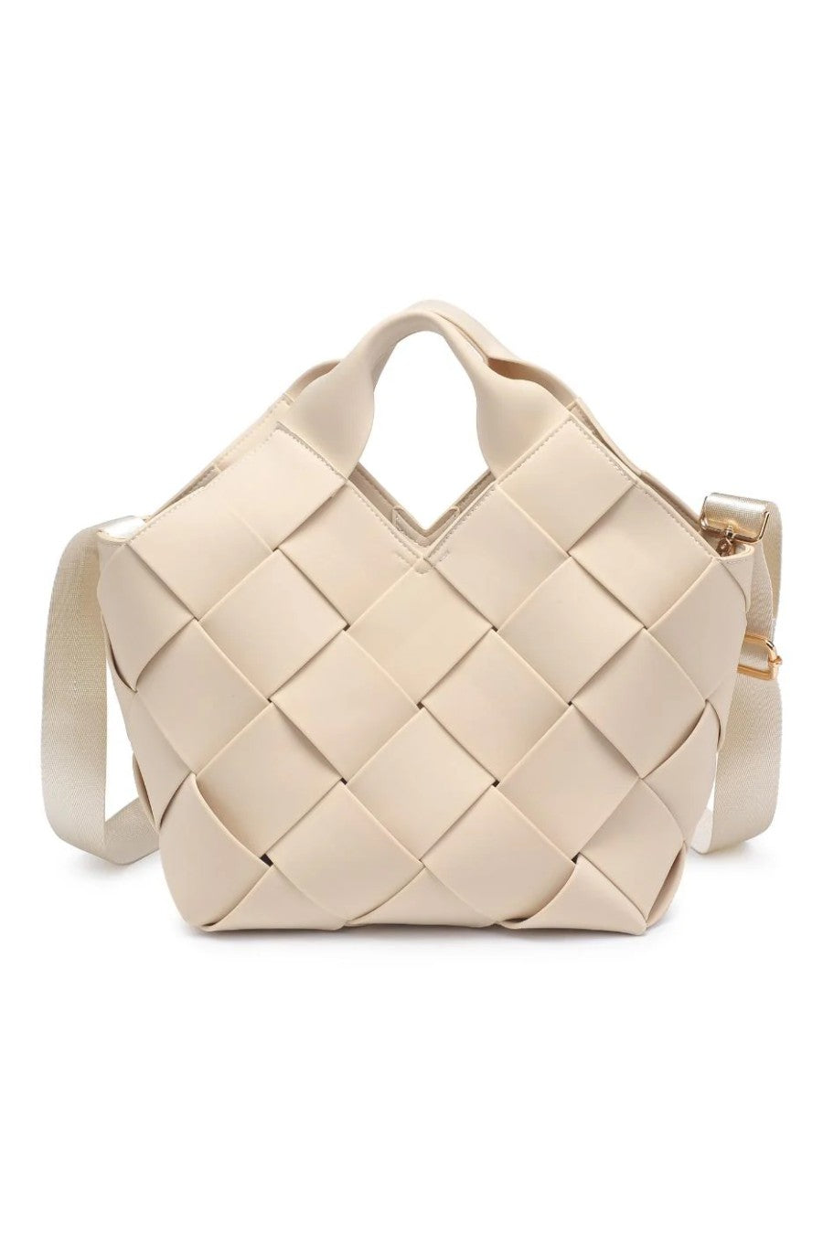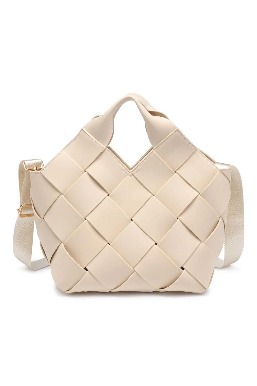 - Exterior Details: Woven Design, Gold Hardware, Adjustable/Detachable Shoulder Strap