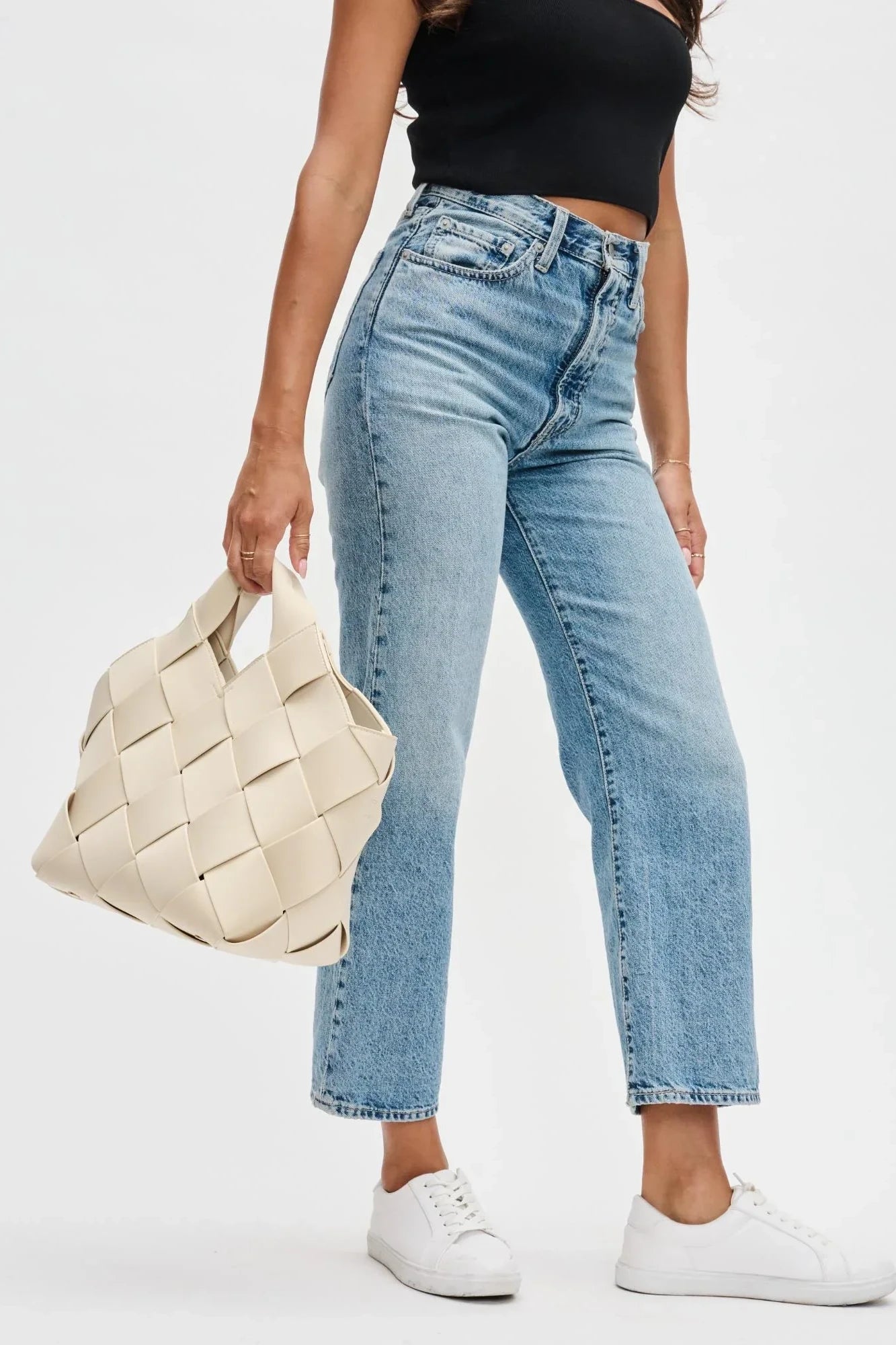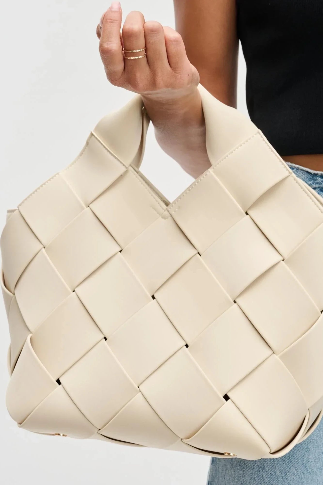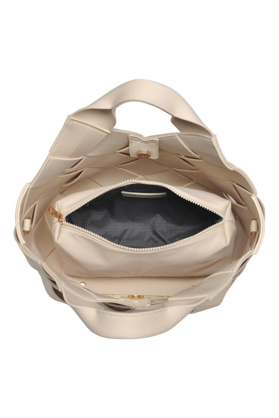- Exterior Details: Woven Design, Gold Hardware, Adjustable/Detachable Shoulder Strap