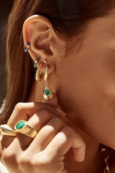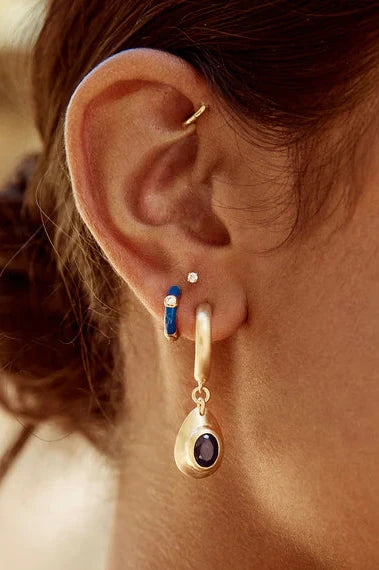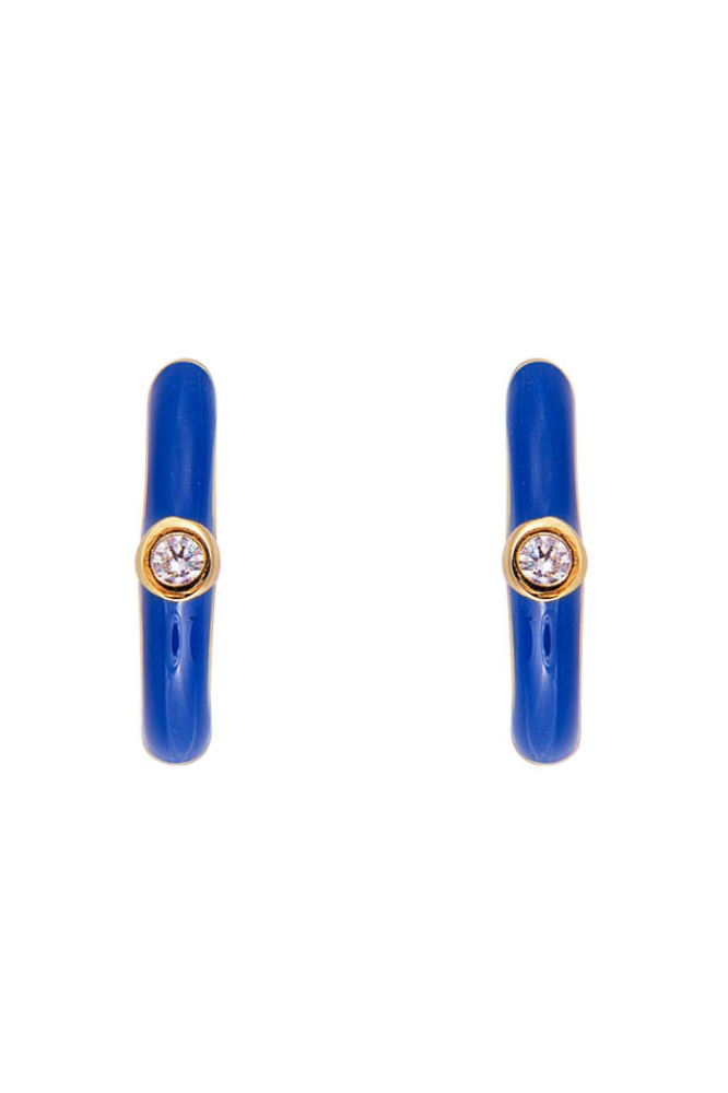 Huggie earrings have certainly skyrocketed in popularity in recent times and these huggies surrounded in dark blue enamel and showcasing a single clear crystal will certainly add a pop of colour to your outfit. Wearable for everyday, these huggies can be matched and mismatched with any of our other styles. Style them with your favourite hoops or let them shine on their own.