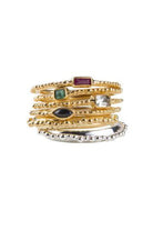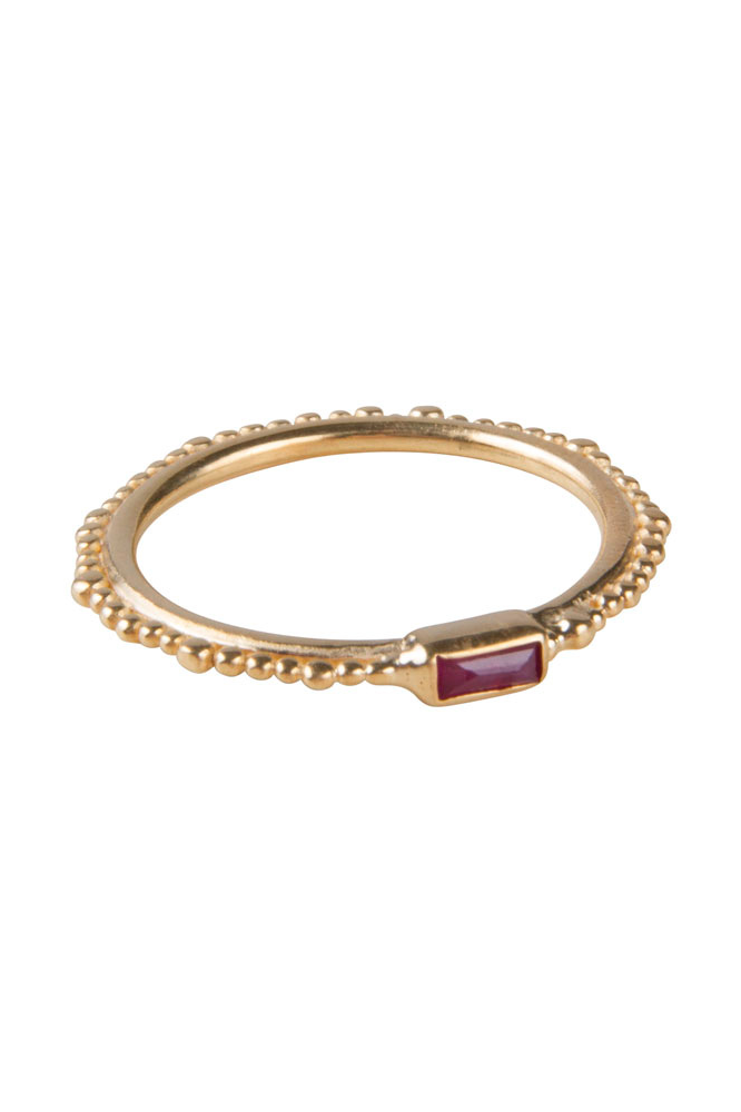 This stacker band features an elegant ruby set in sterling silver 24k Italian gold plate with uneven granules around the band.