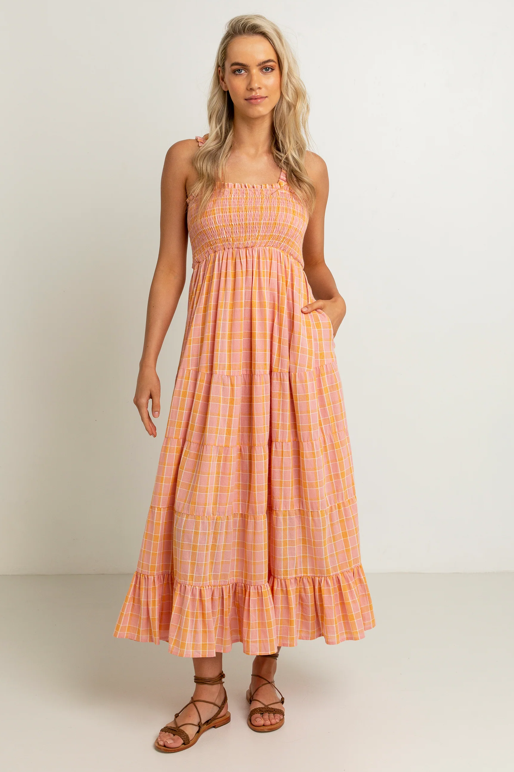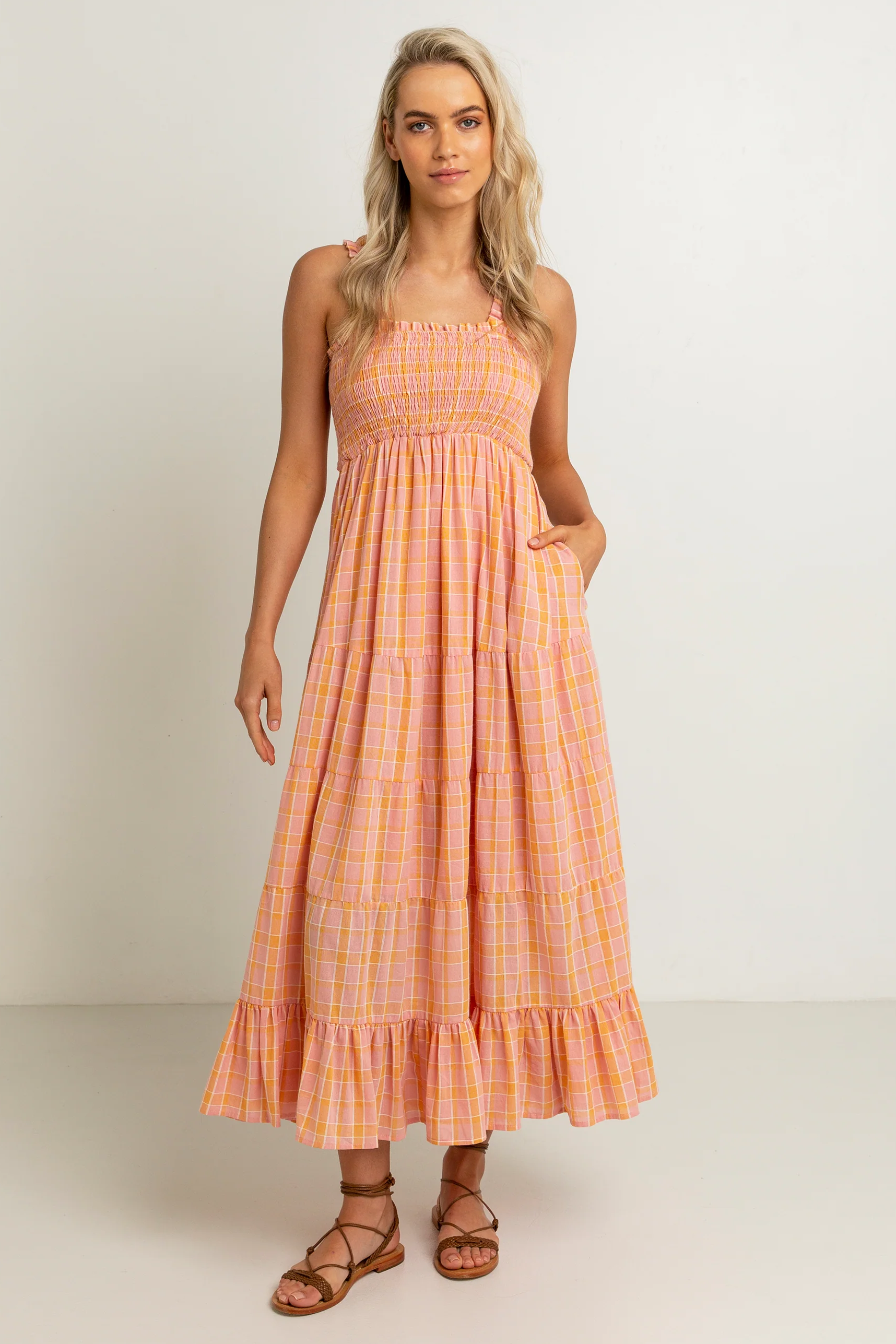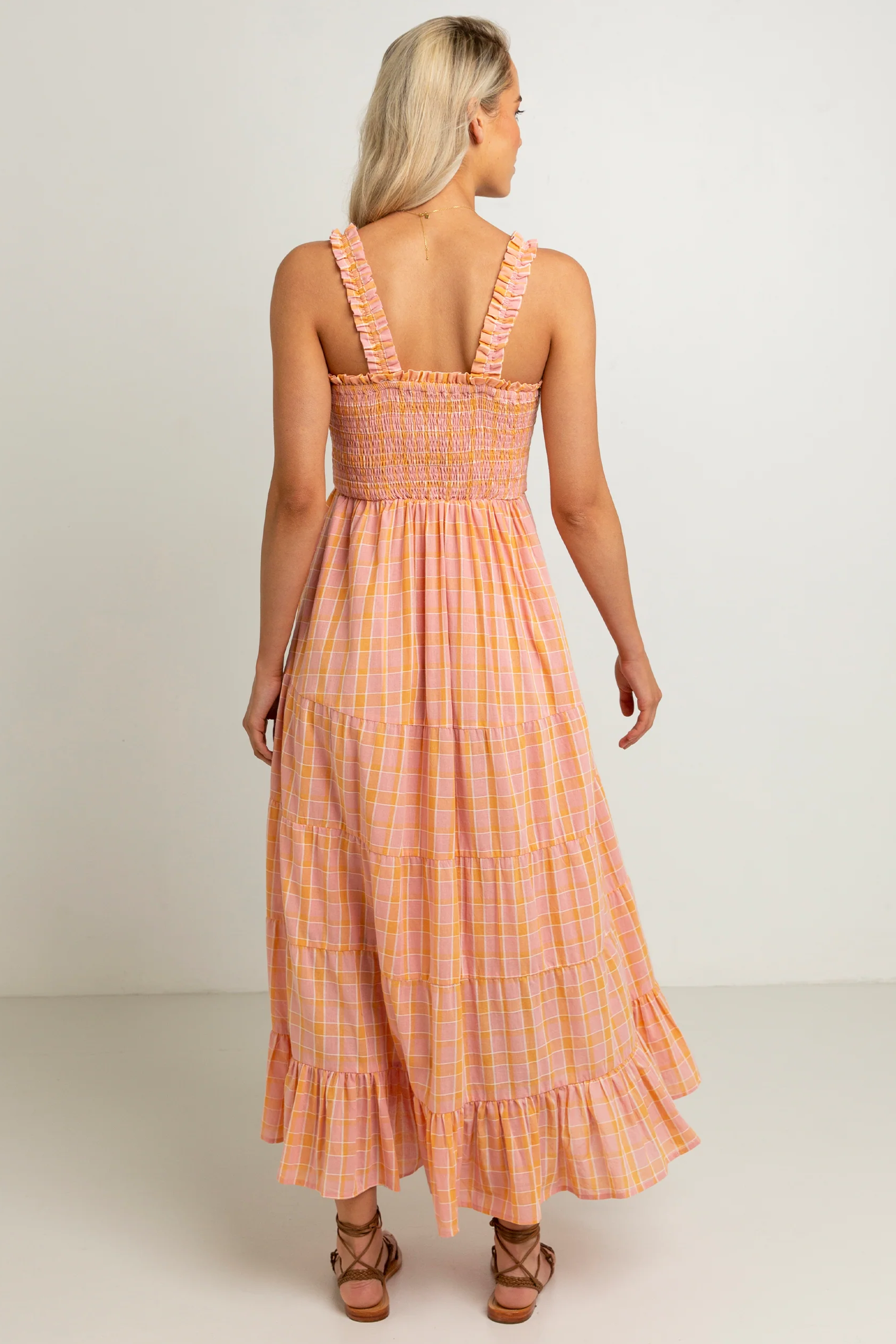 The Rue Maxi Dress is the ultimate Summer dress, with a fully shirred bodice and elasticated straps for comfort and exceptional fit, a full tiered skirt and all the colours of the sunset.