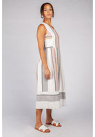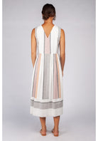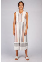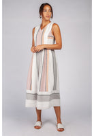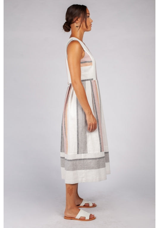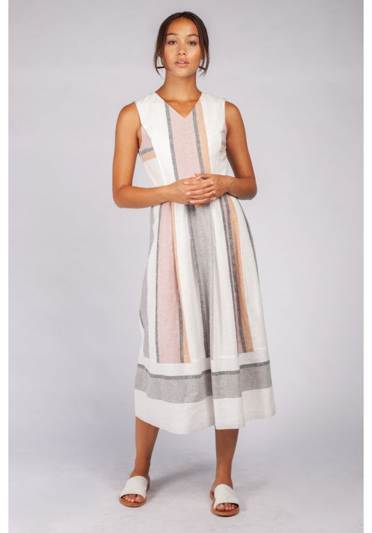 A beach where the sand is made of tiny shells, with coral tones and tales of light... The Sand Series is a quiet take on Summer, with a soft elegance and timeless femininity. Featuring a classic high waist, skirt pleats and a V-neck at front and back, this dress is an easy cut for all body types. Clever use of stripes create a slimming effect, while the dusty pink and peach shades bring light and colour to the complexion. The Summer dress for all occasions.