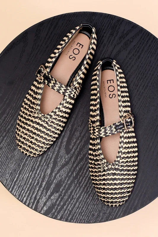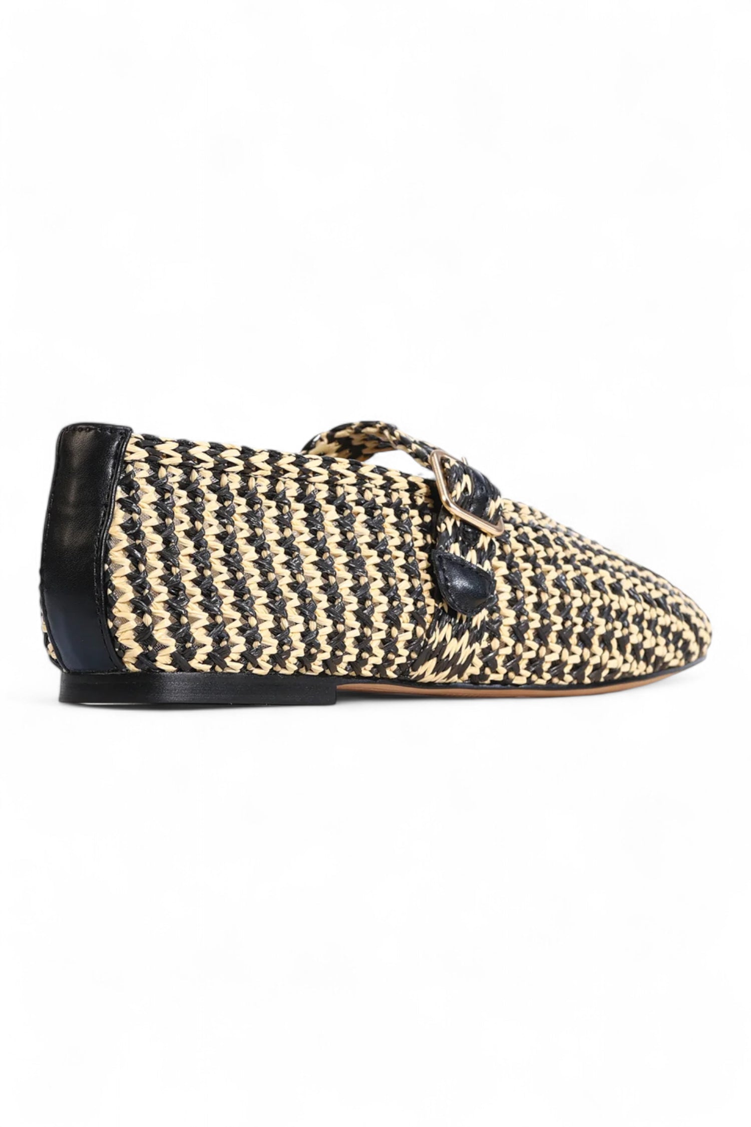 - Mary jane strap with fitting elastic behind buckle & Two-tone woven material upper