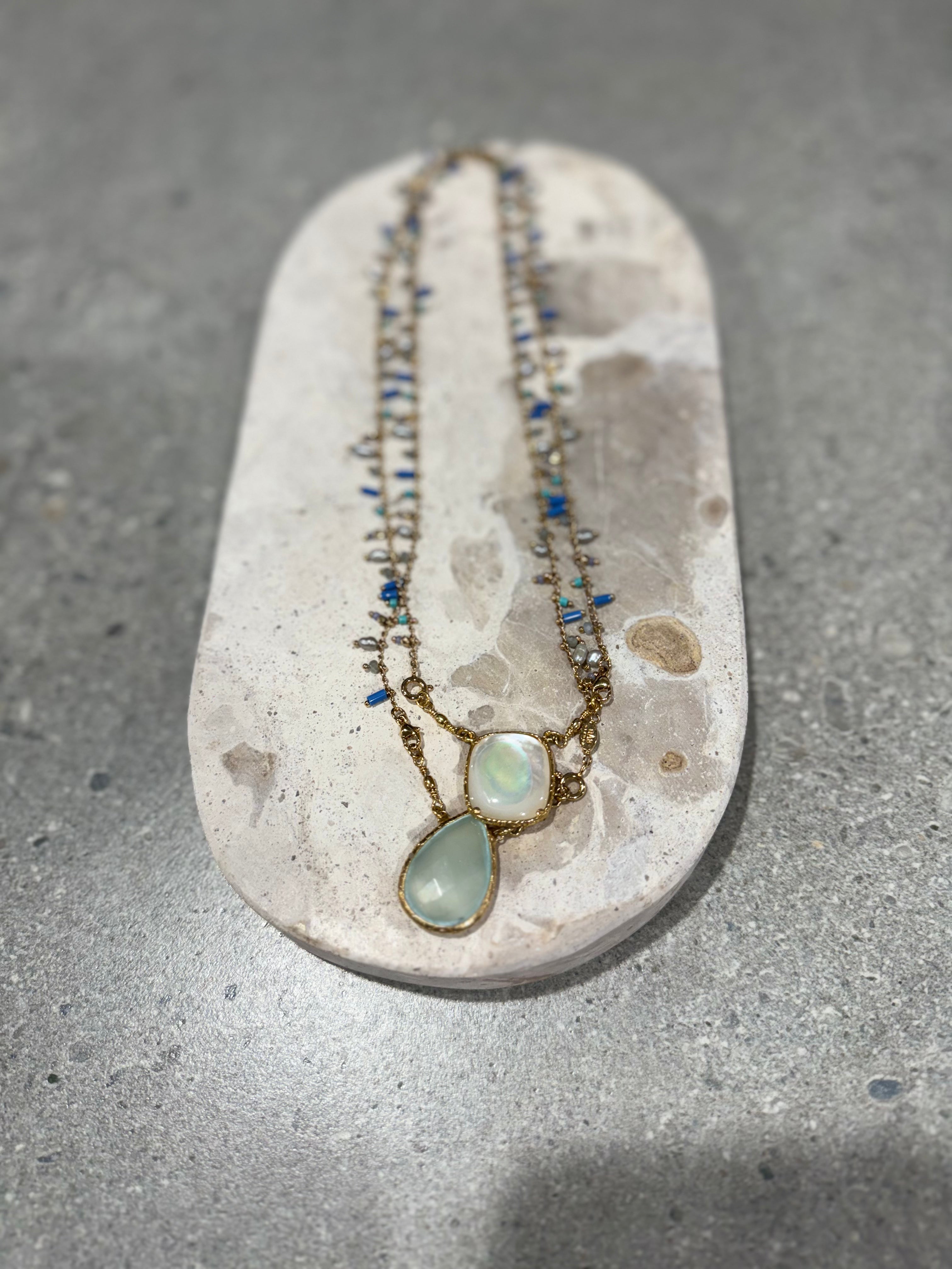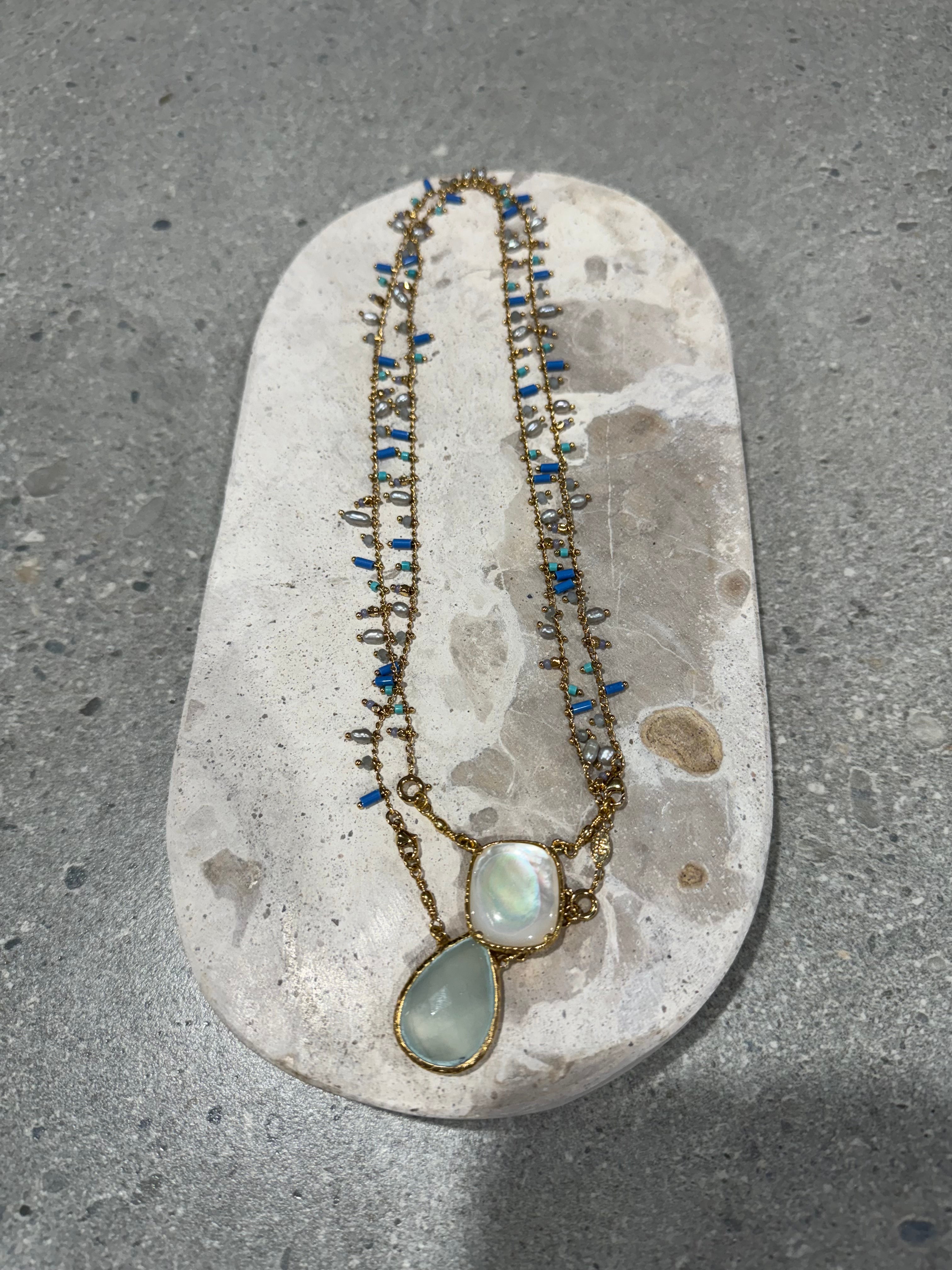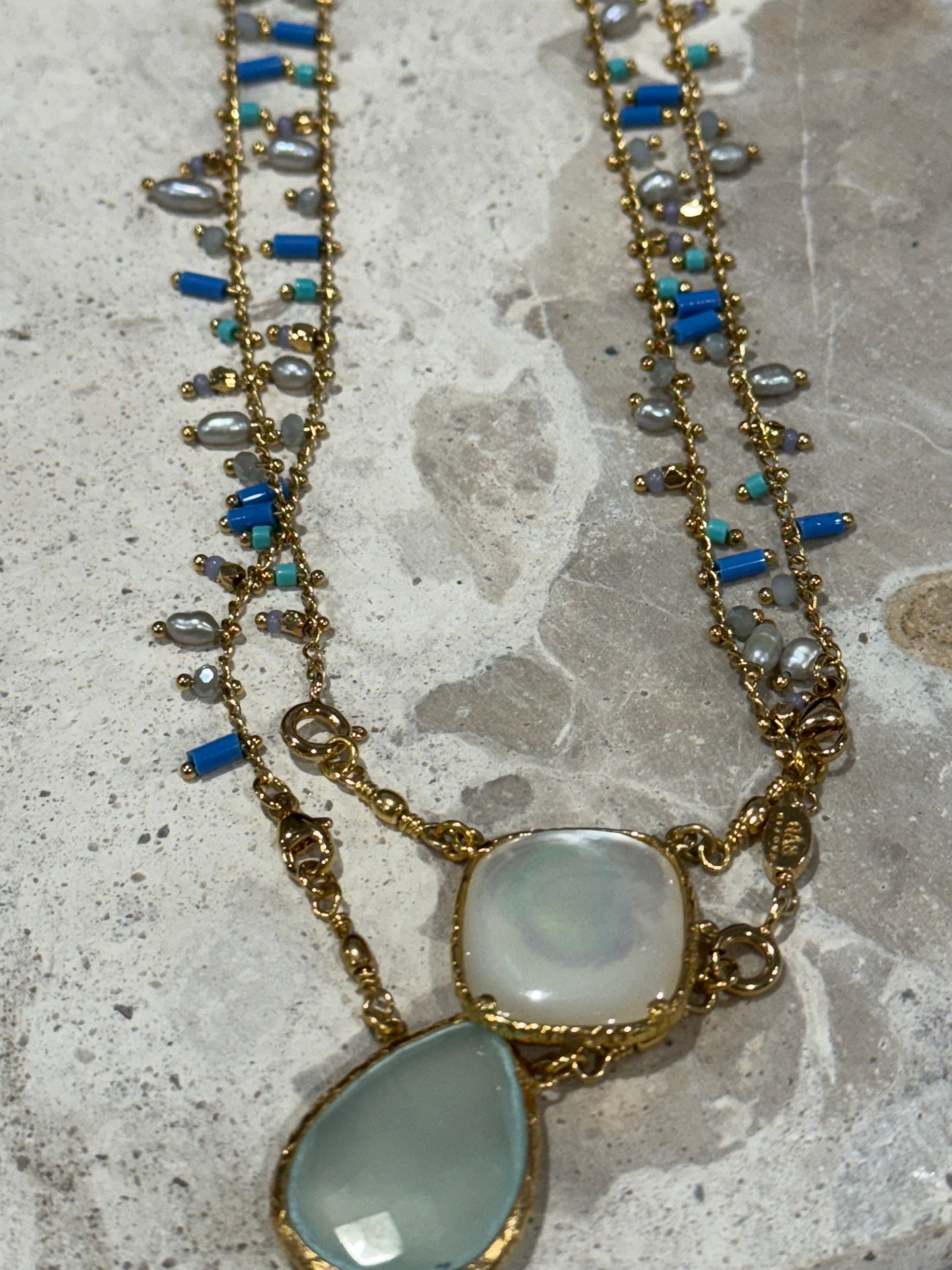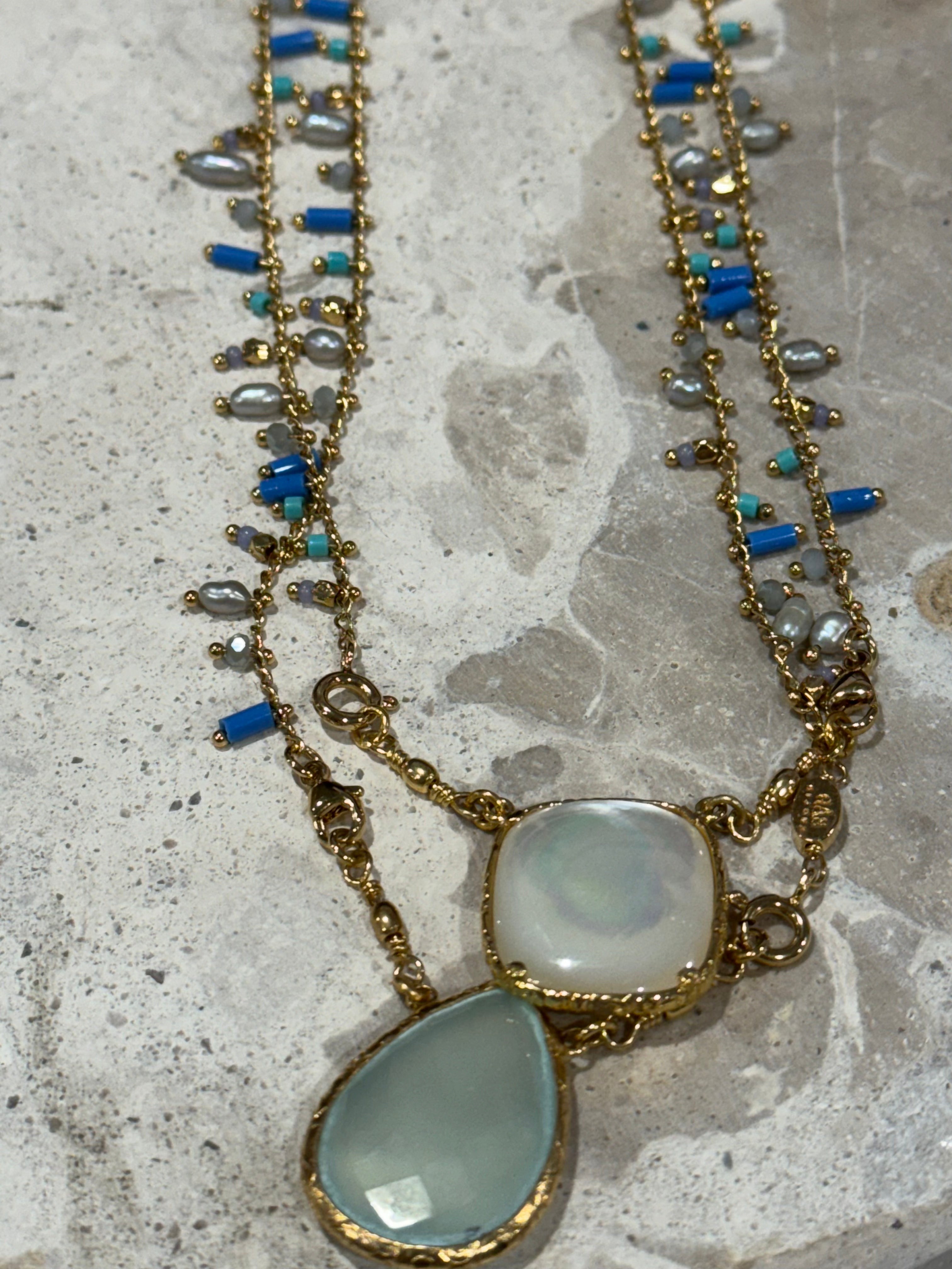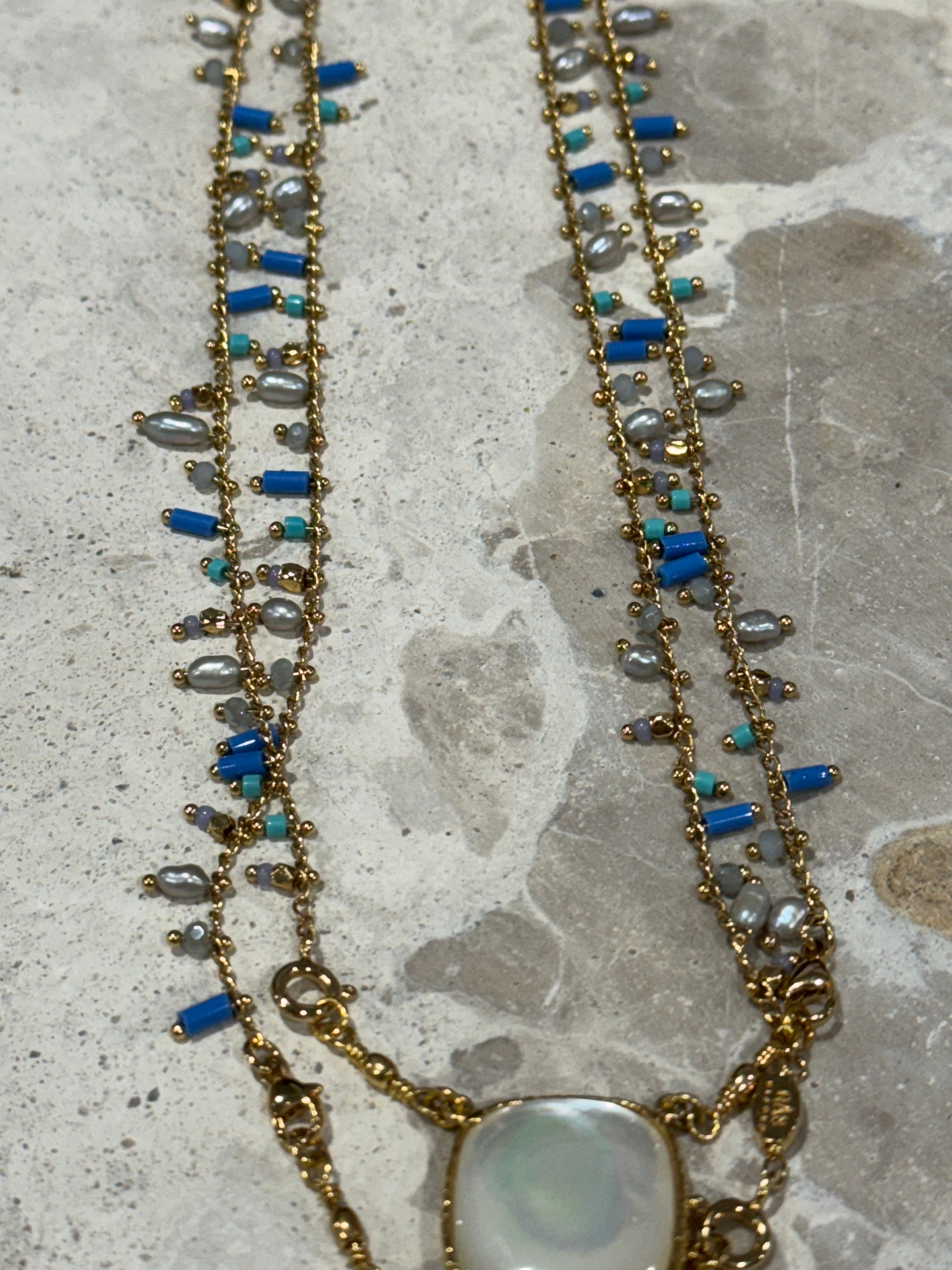 Gilded metal necklace composed of one White Mother-of-pearl gemstones and a light blue serti stone set on a golden chain adorned with glass beads.