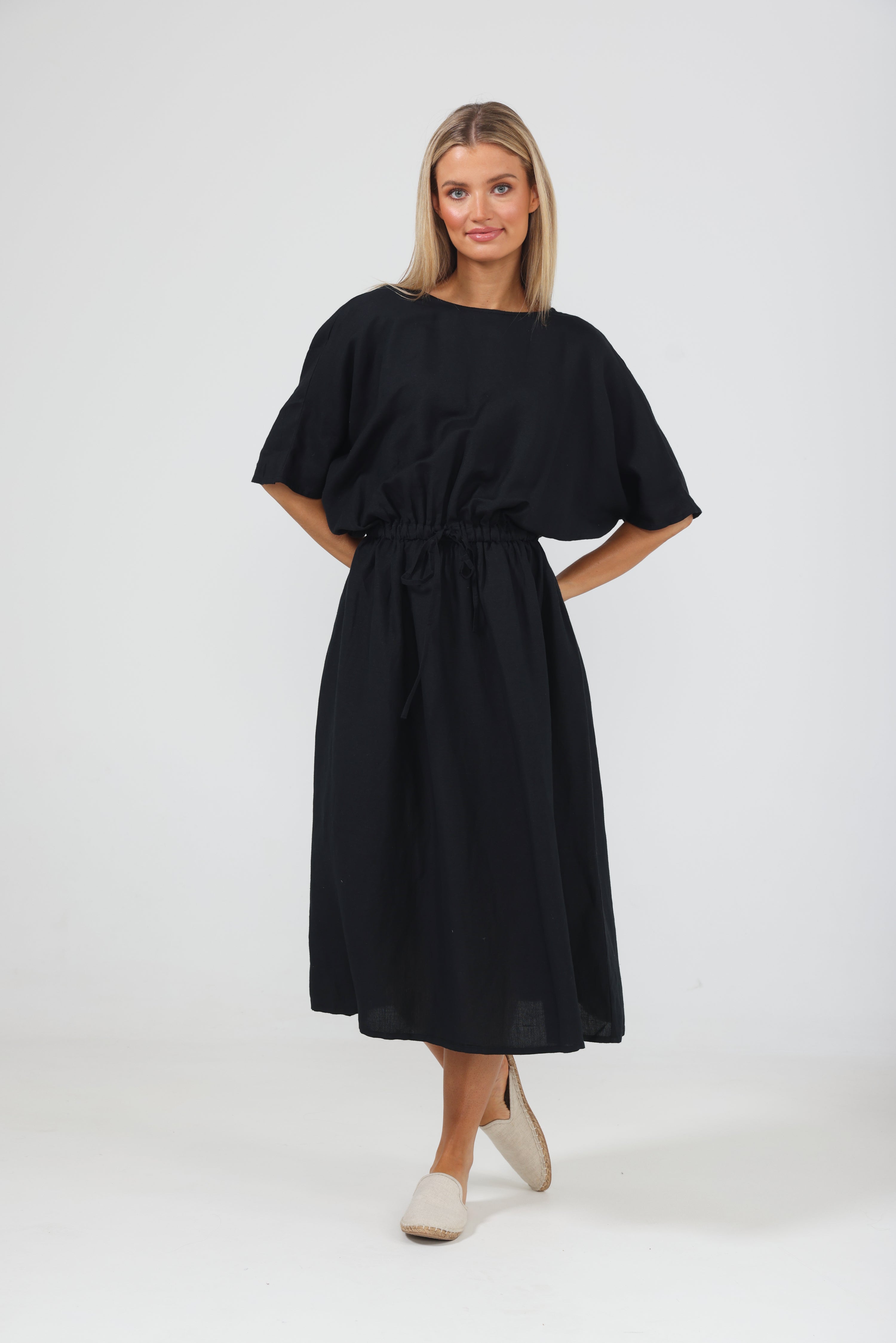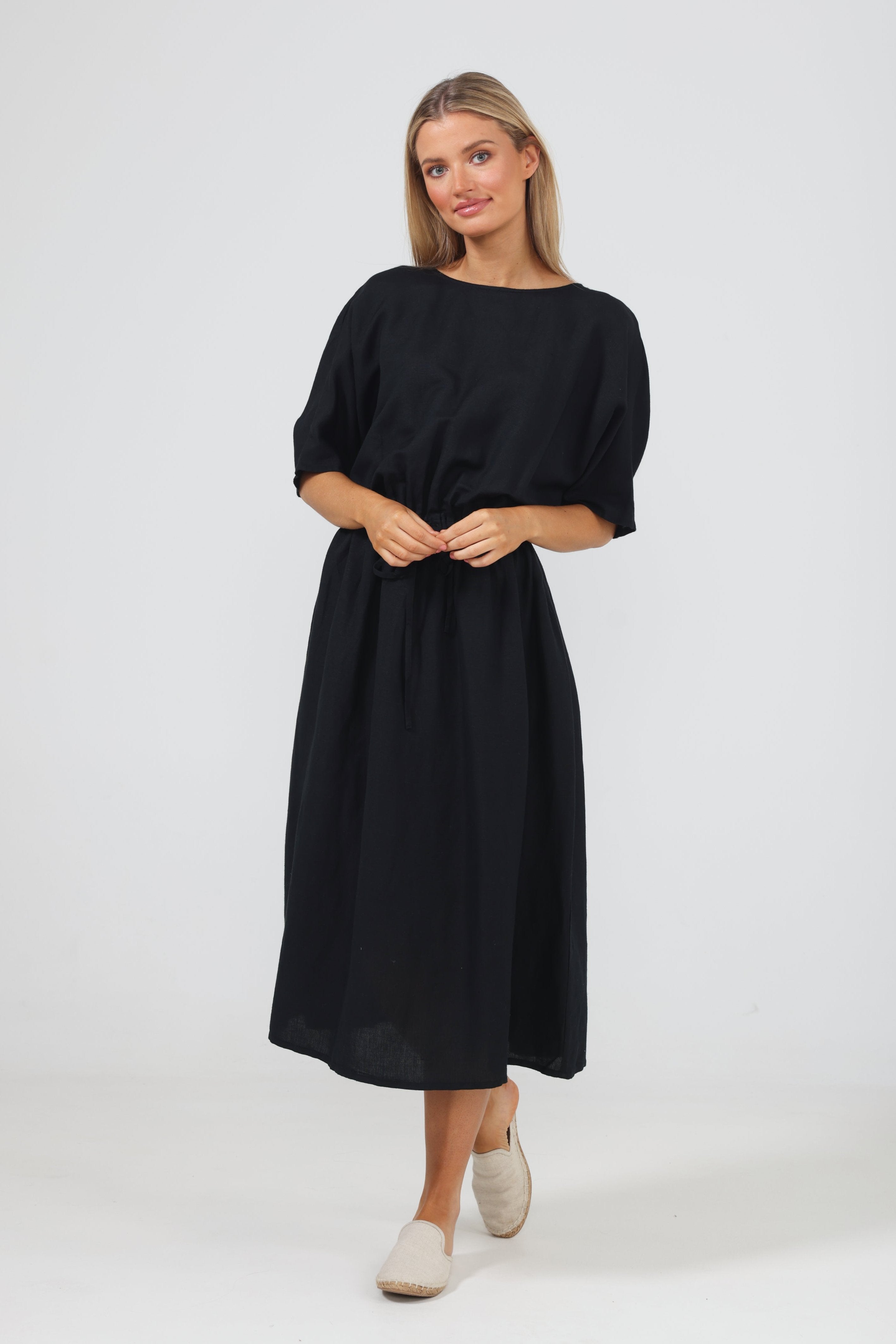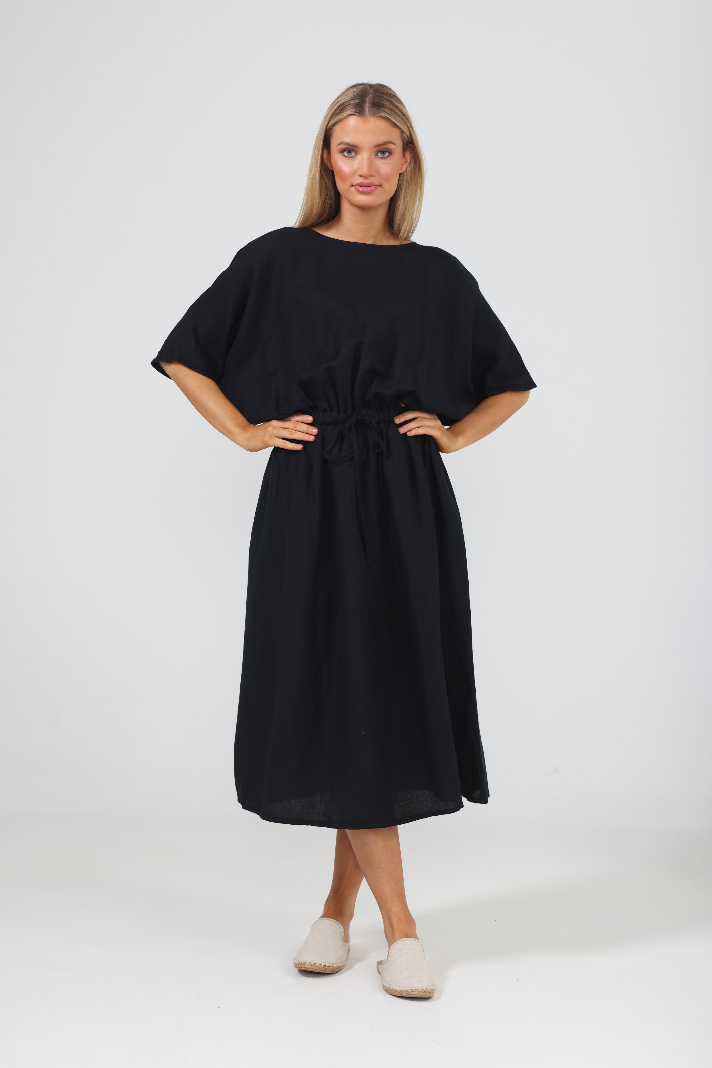 A spring/summer staple, the Sicily Dress combines style with ease in the typical Shanty fashion. Made from a luxe linen blend, this relaxed dress features a short batwing sleeve and draws in at the waist before kicking out into a full midi-length skirt. Pair it with a sneaker or sandal for daytime chic. • Round neckline