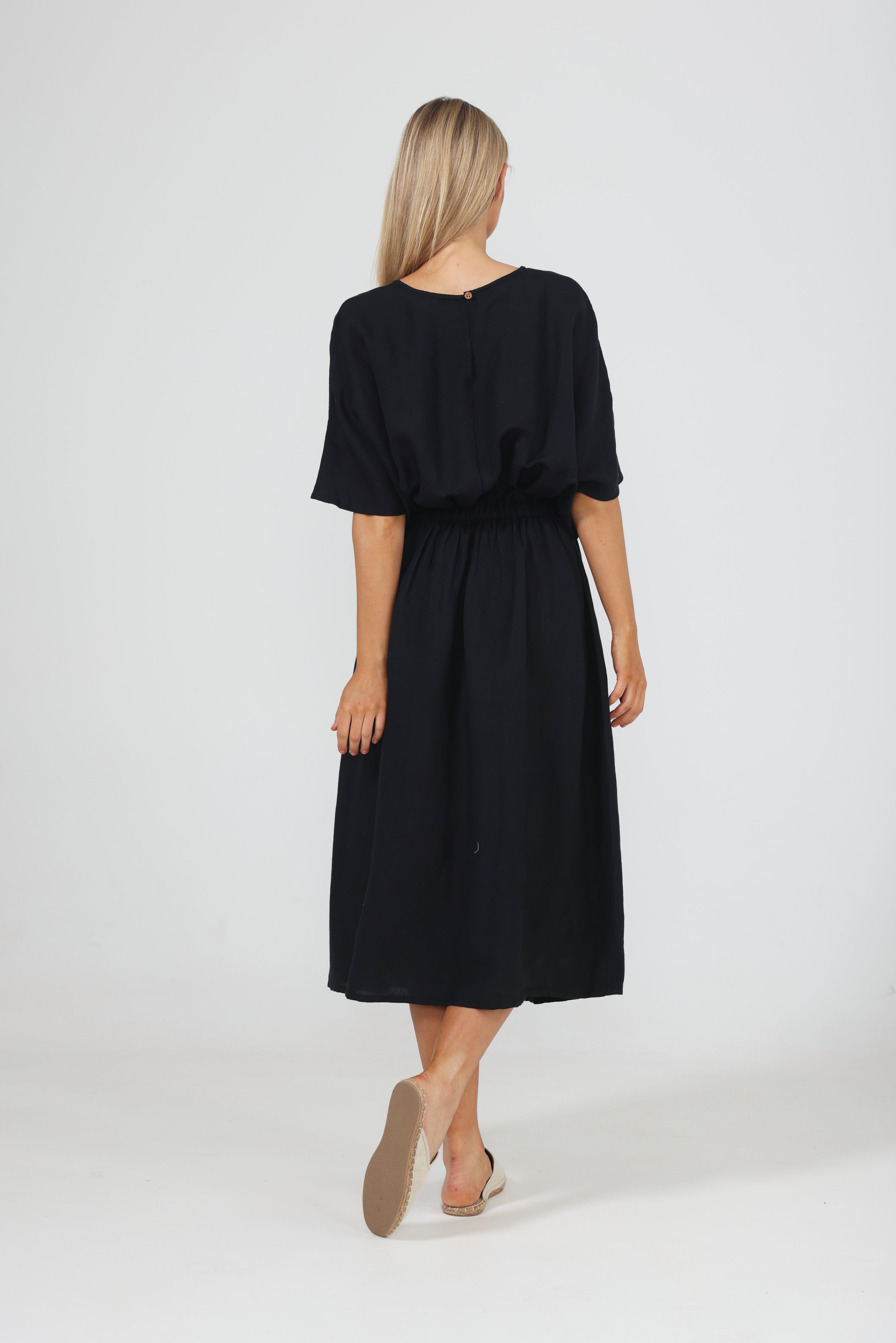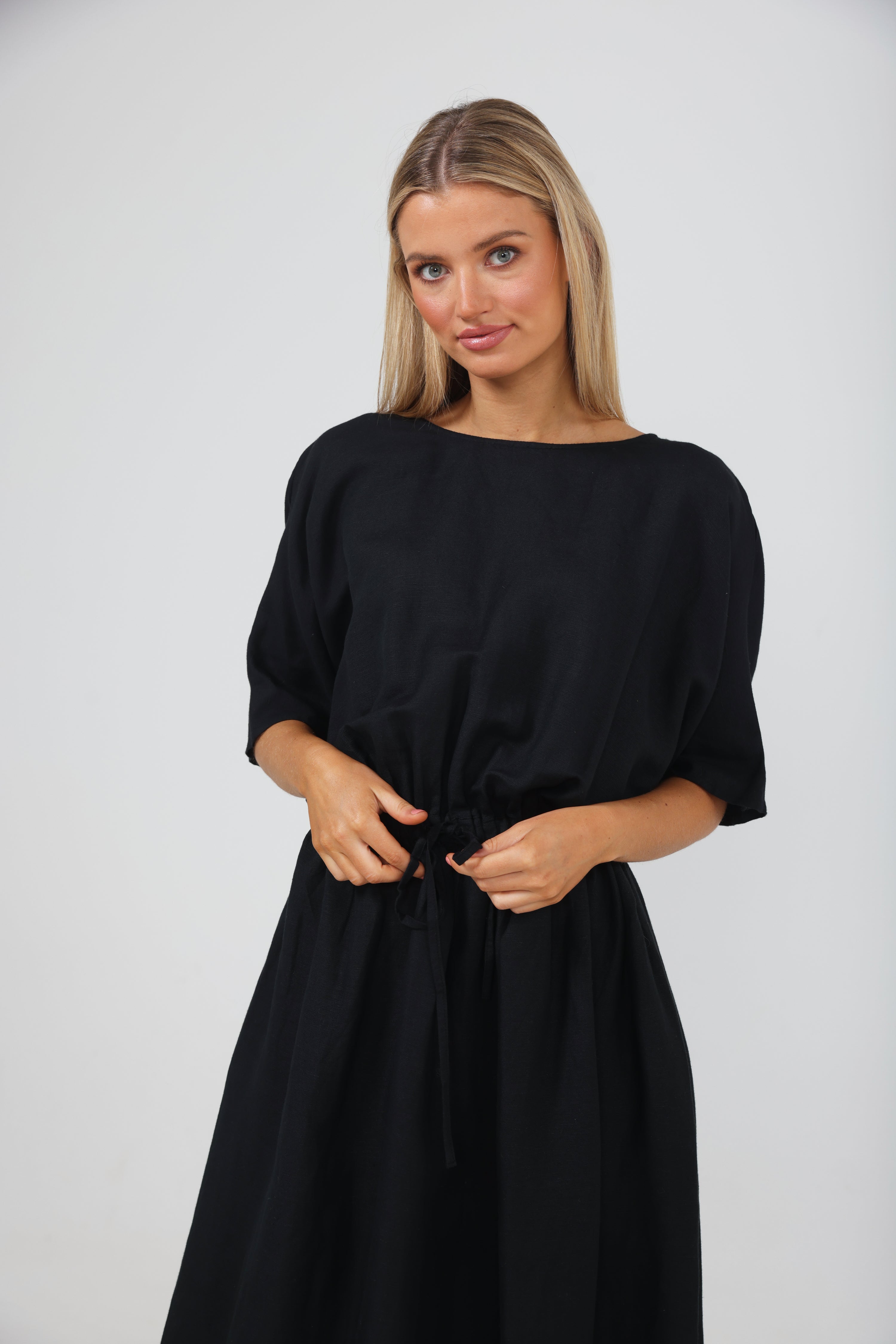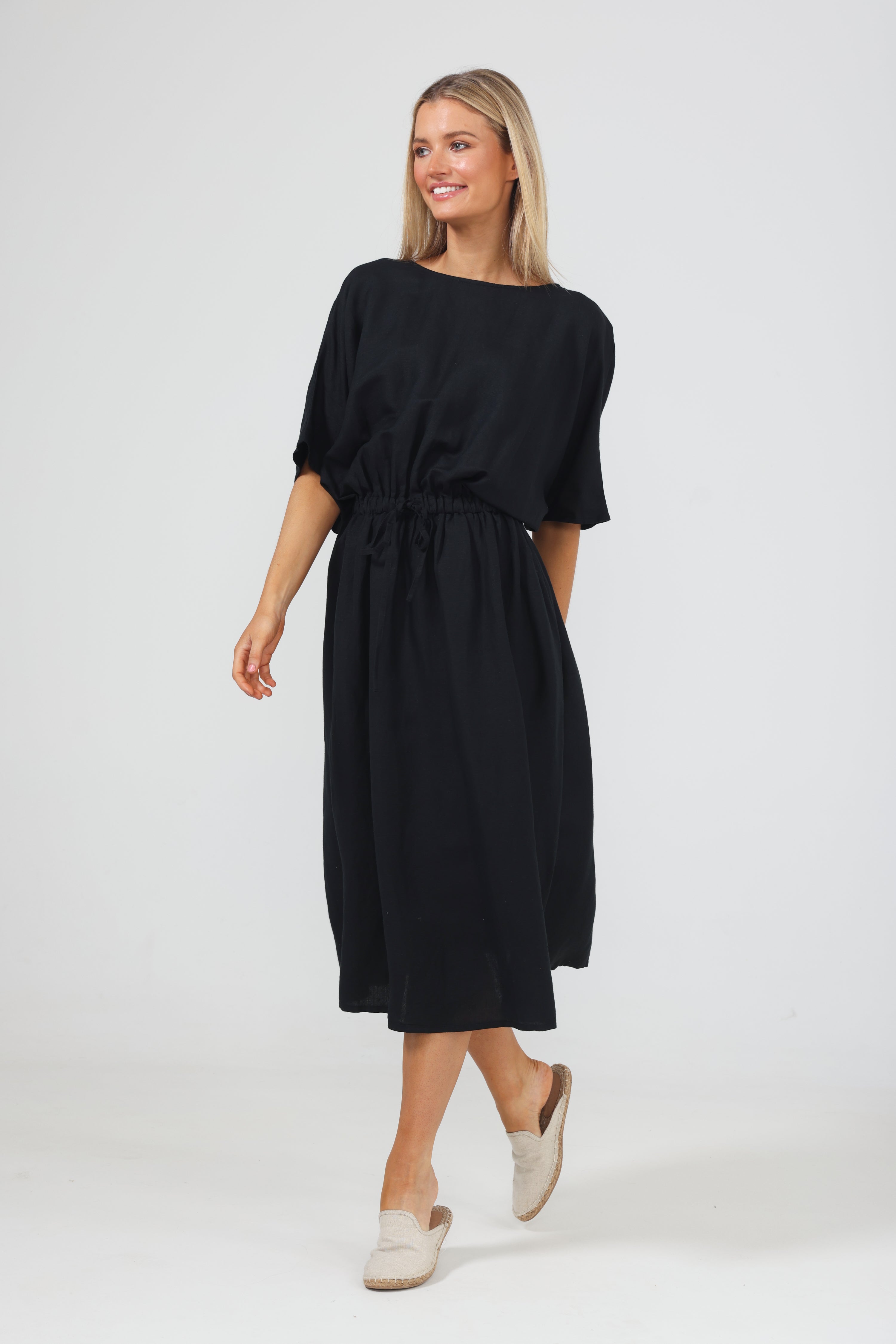 A spring/summer staple, the Sicily Dress combines style with ease in the typical Shanty fashion. Made from a luxe linen blend, this relaxed dress features a short batwing sleeve and draws in at the waist before kicking out into a full midi-length skirt. Pair it with a sneaker or sandal for daytime chic. • Round neckline