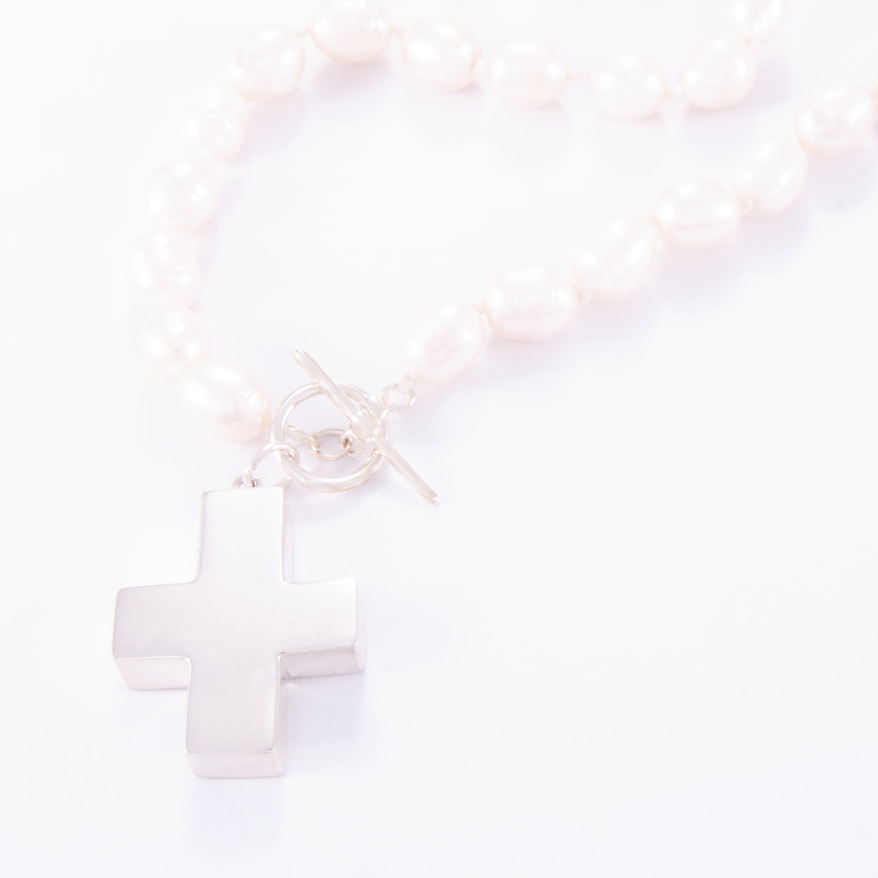 Our Freshwater Pearl Fob Cross Necklace. Shown here, with a large hand-made 925 sterling silver cross. In short, this amazing substantial piece is full of elegance and style and is sure to make a statement. It’s the perfect self-indulgent addition to your own jewellery collection. Or as the ideal gift for someone very, very special.