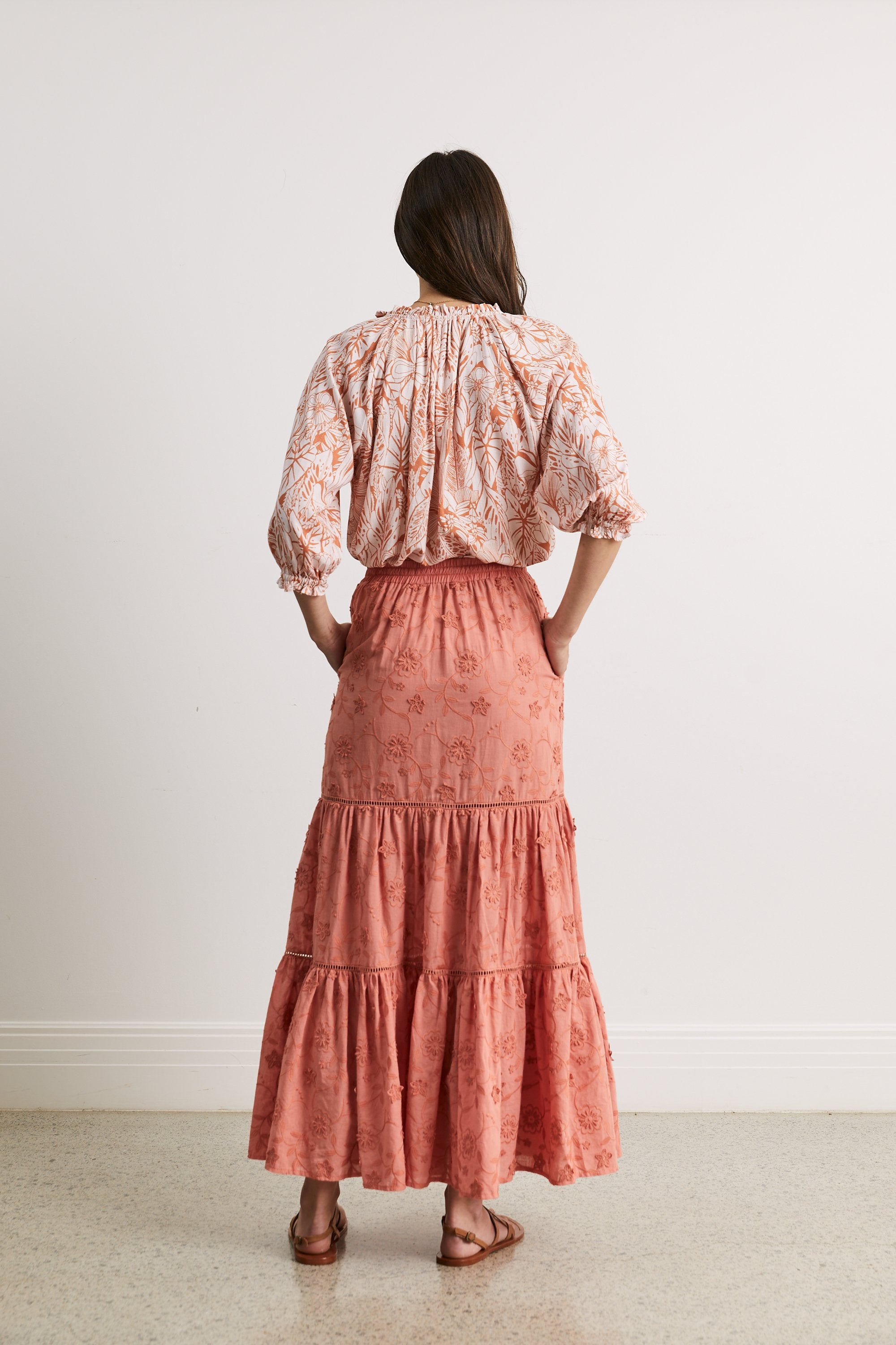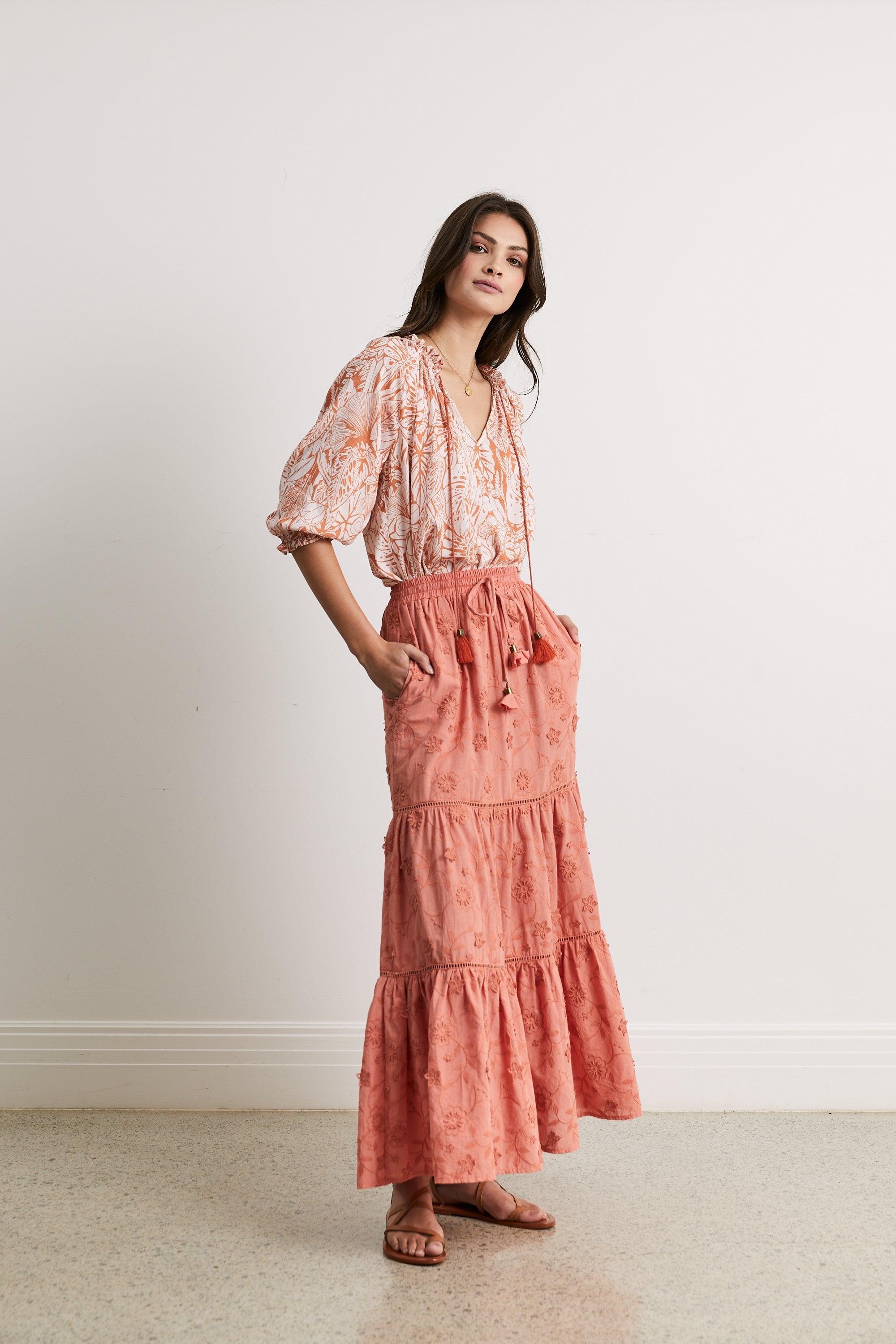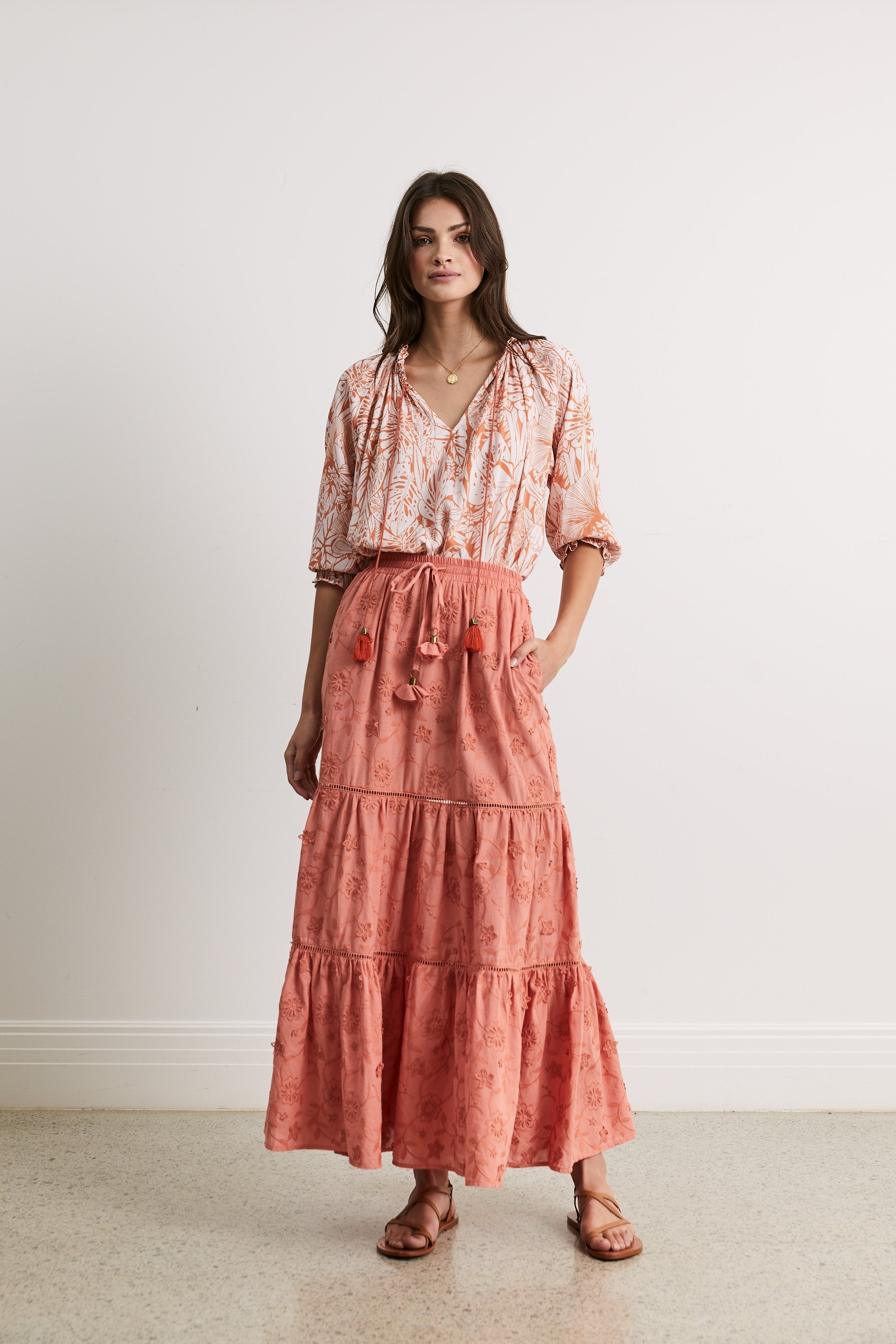 The Tabitha Tired Maxi Skirt is crafted in our biodegradable floral applique broderie anglaise.