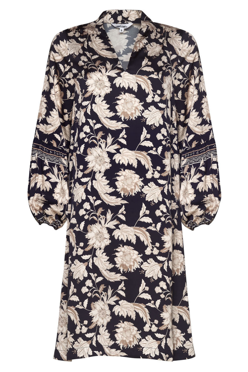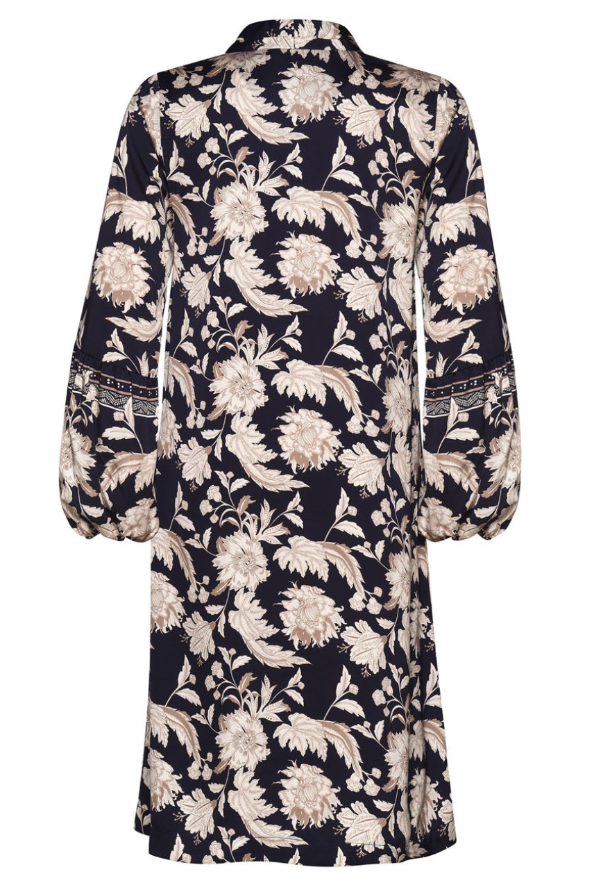 Knee length dress with a deep V-neckline and an upstanding back collar. Featuring sewn-in tucks along the shoulder and extra volume in the lower sleeve, with elasticated cuffs.