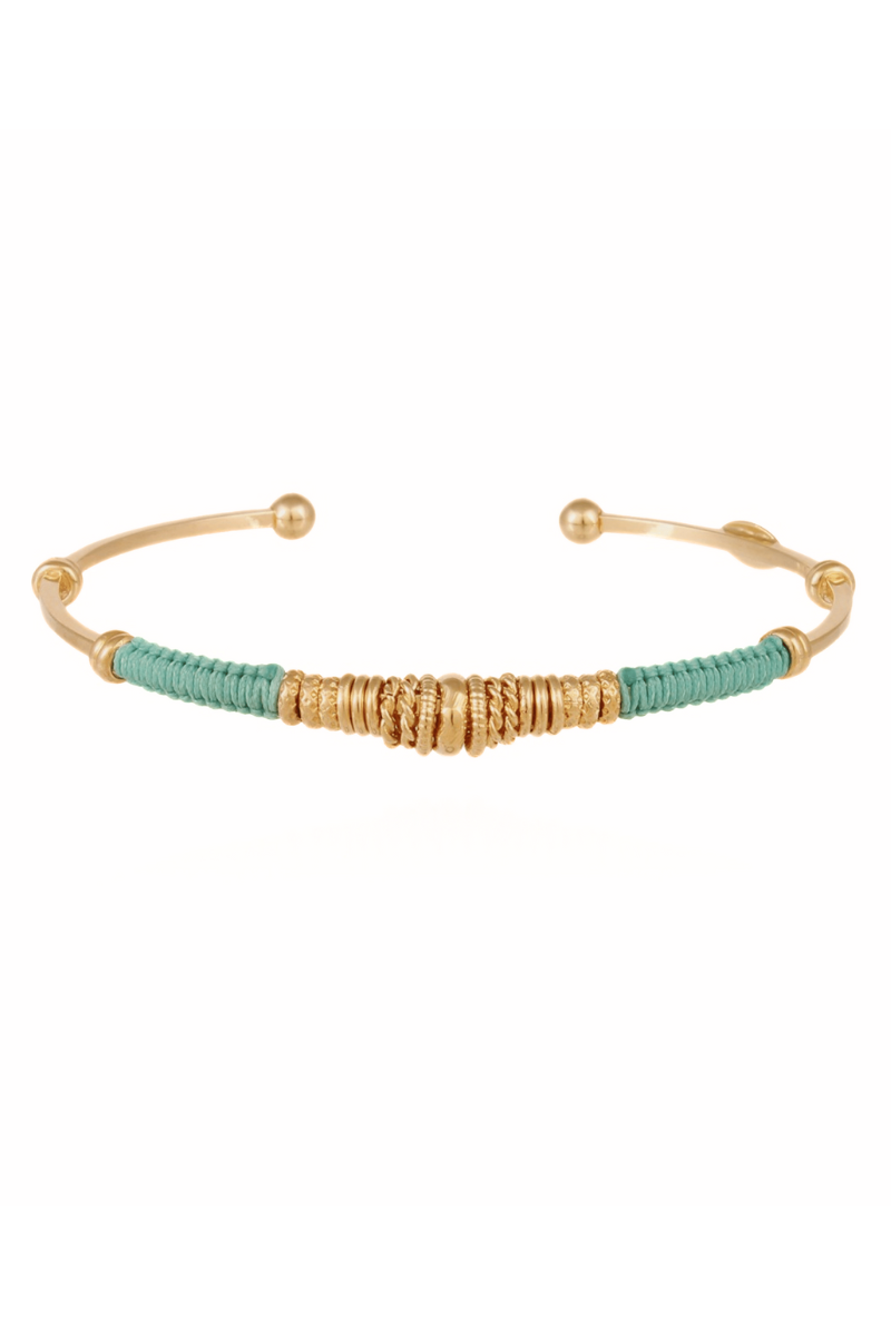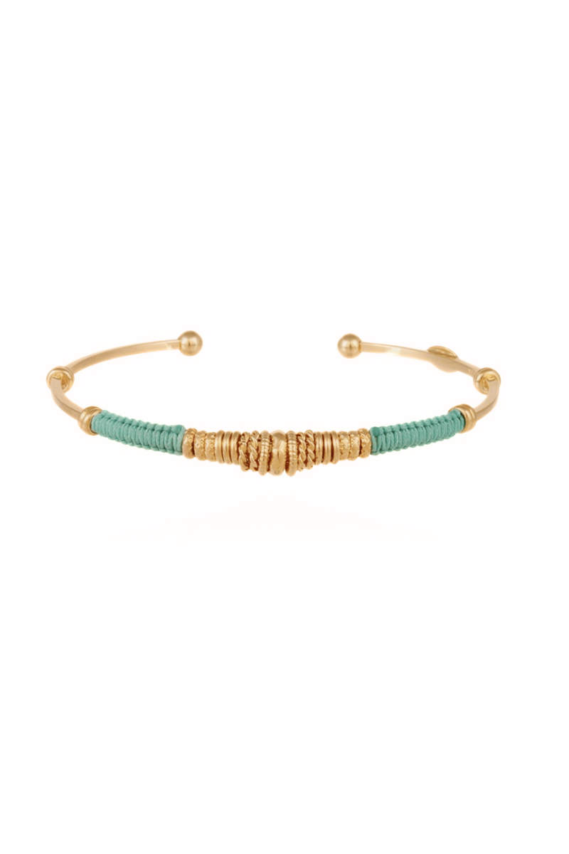 Gold plated bangle/cuff, wrapped in part by coloured threads and golden rings. For a lucky charm, we recommend wearing it with other bracelets to create the perfect combination.