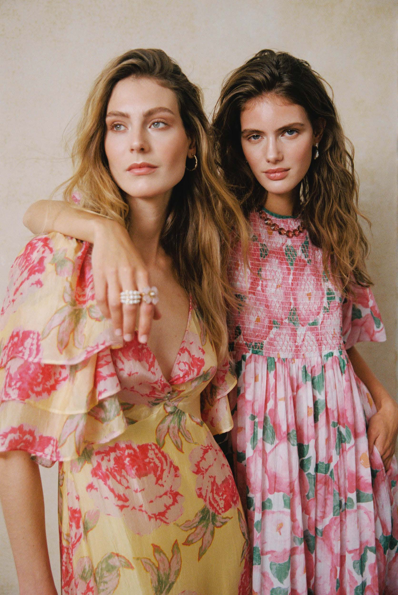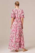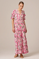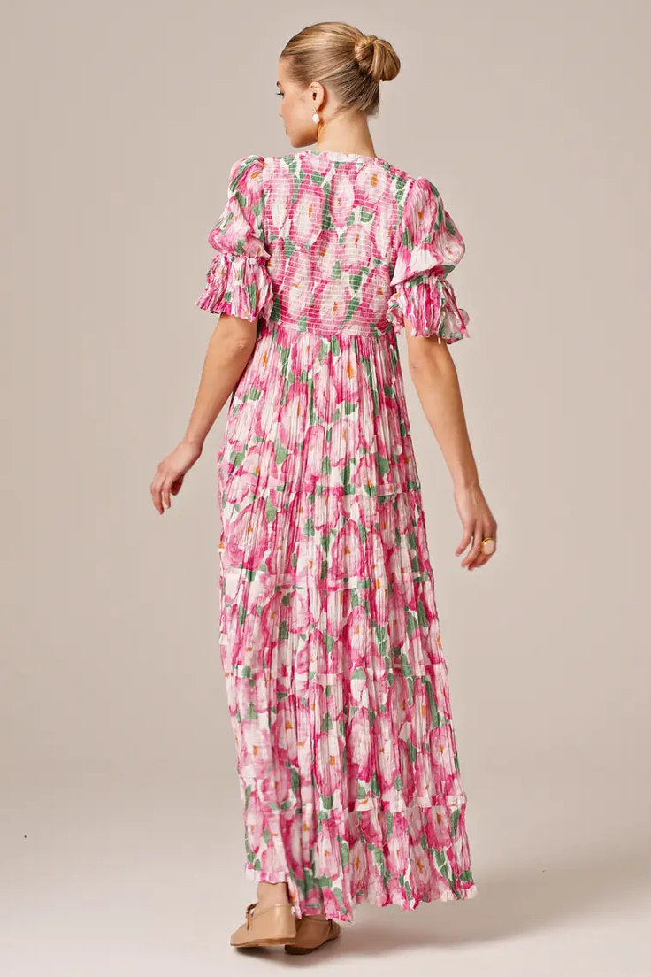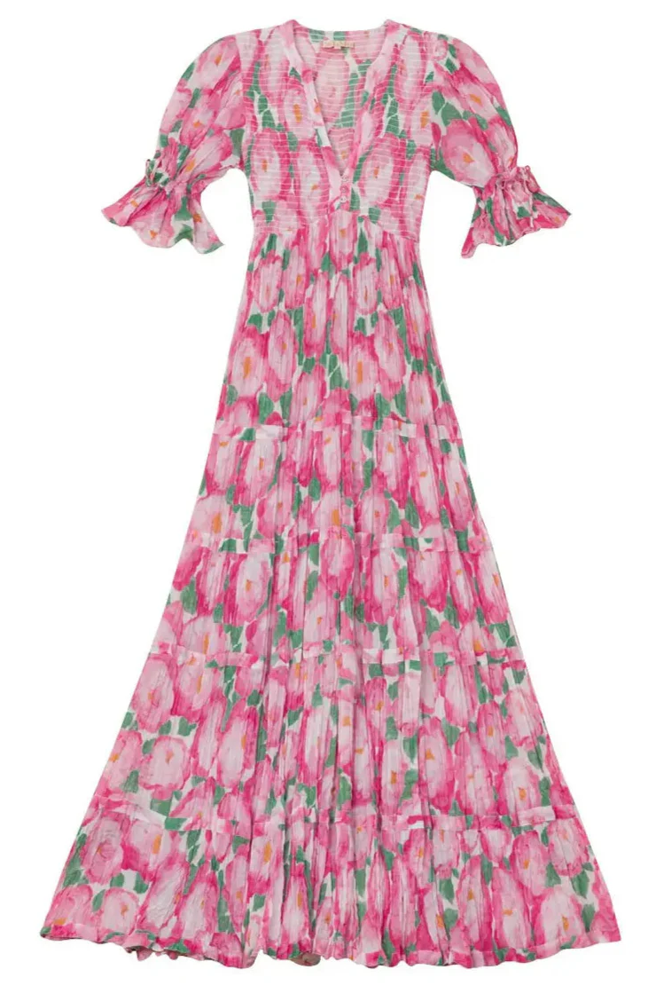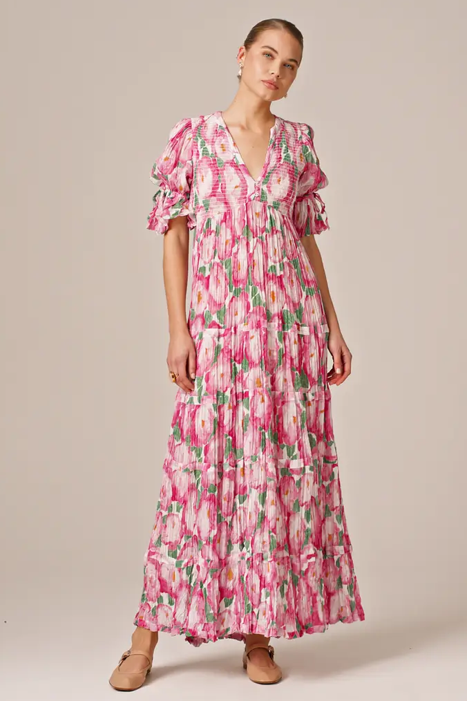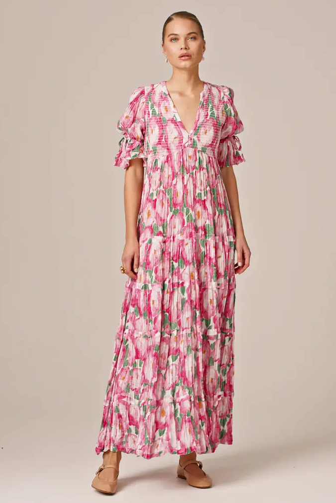 The Bohemian Maxi Dress is cut on our very soft and light GOTS certified cotton quality. It has a maxi length, flattering v neckline, and short, puffed sleeves with drawstrings and flounce details. The top is made of smocking and the twisted, tiered skirt has lots of volume, giving the dress a pretty flowy silhouette.