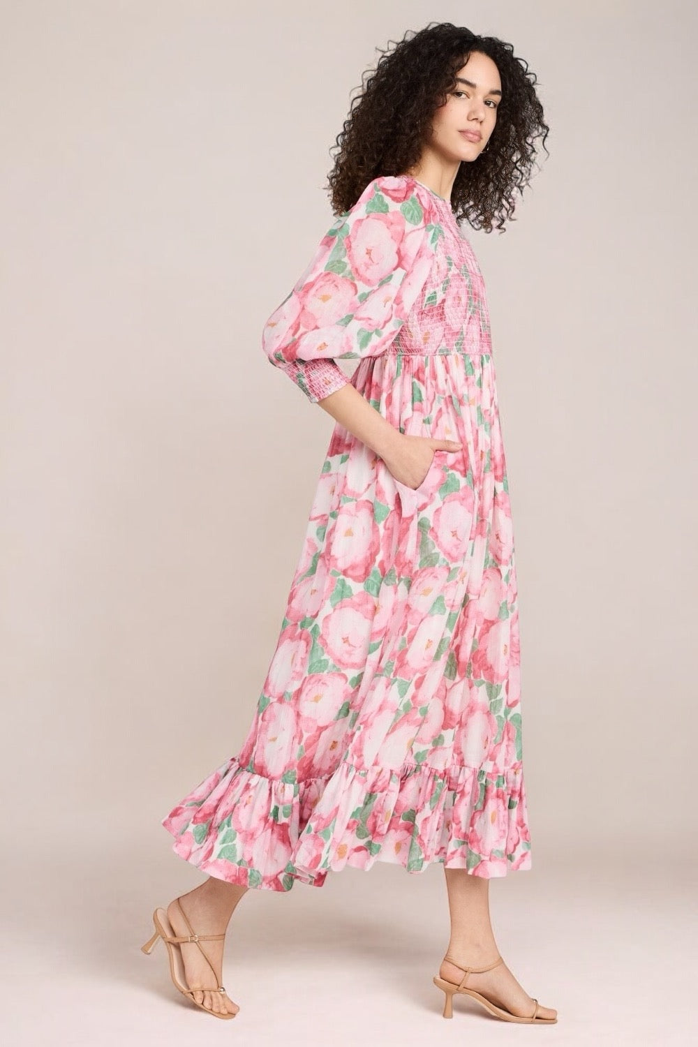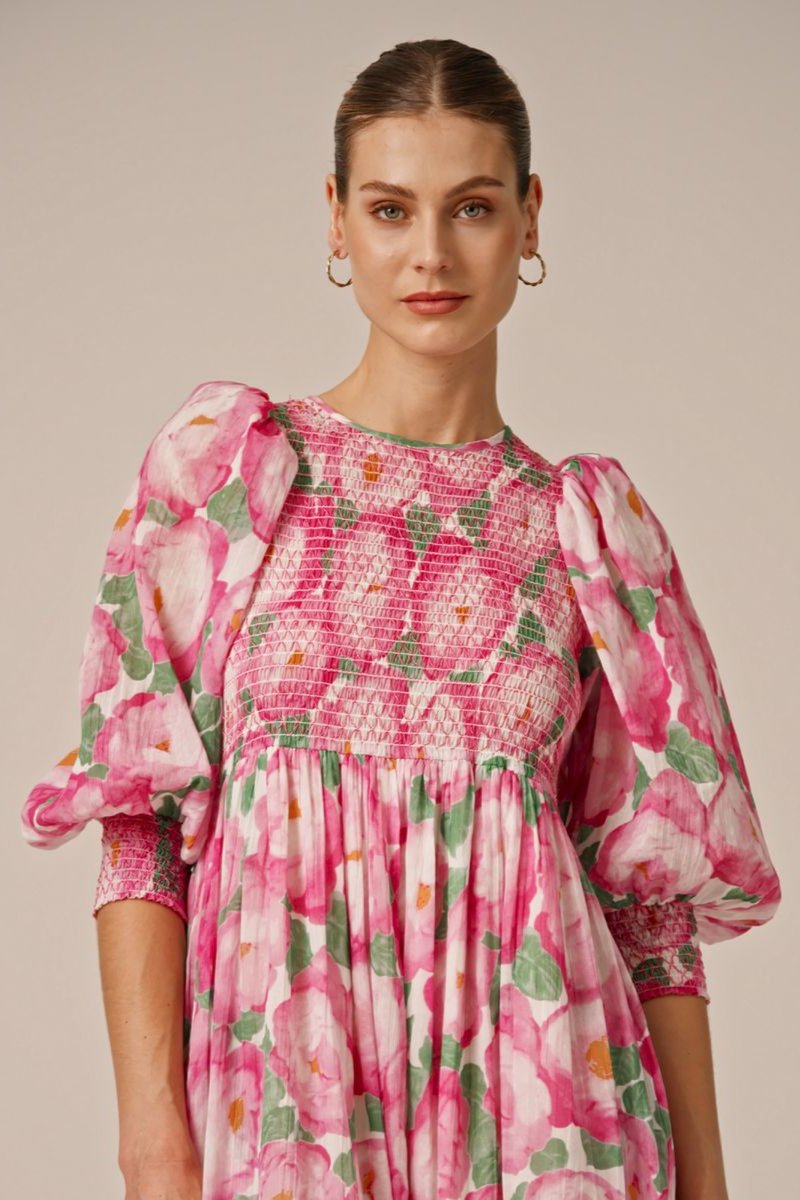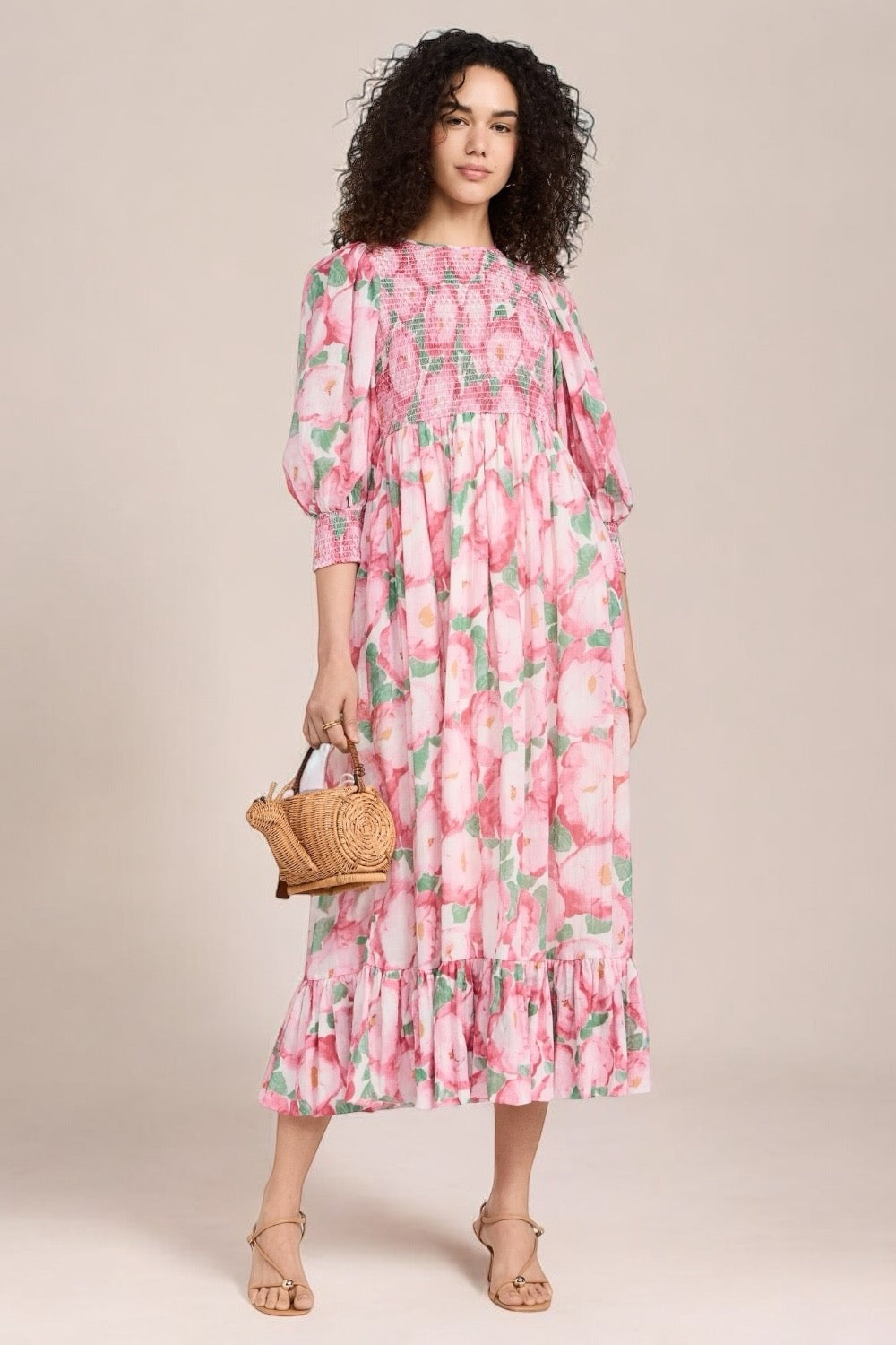 The Bohemian Smocking Dress is cut on our very soft and light GOTS certified cotton quality. It has a Midi length, round neckline, and elbow length, puffed sleeves. The top is made of smocking and the skirt in midi length.