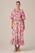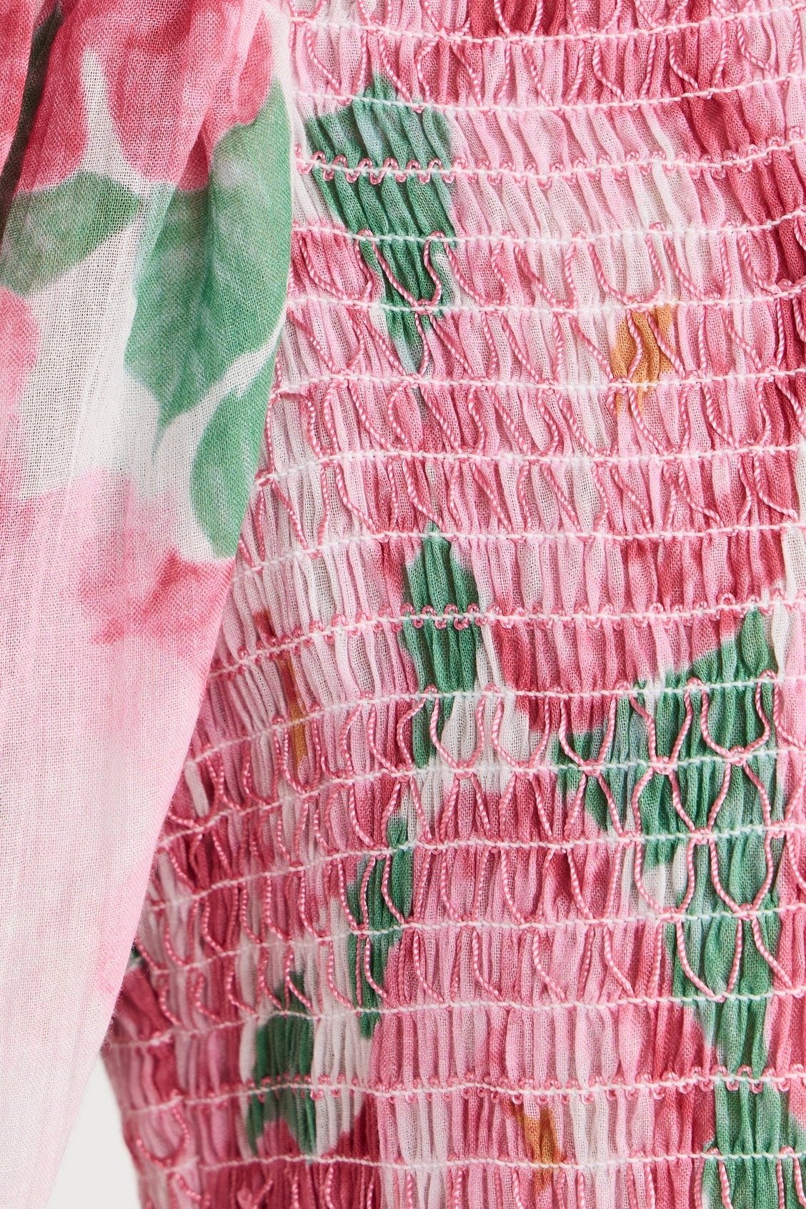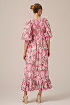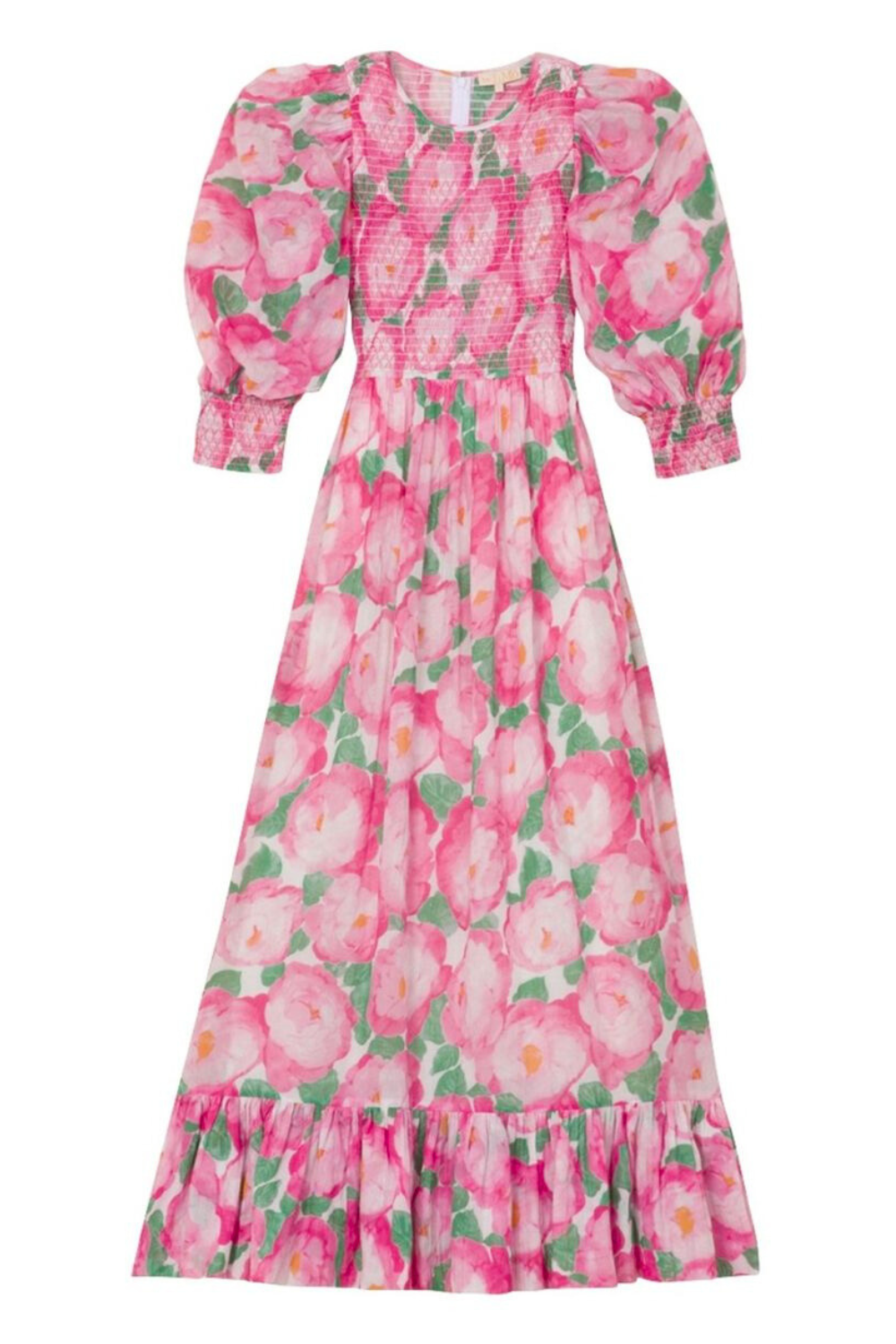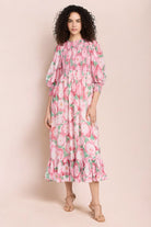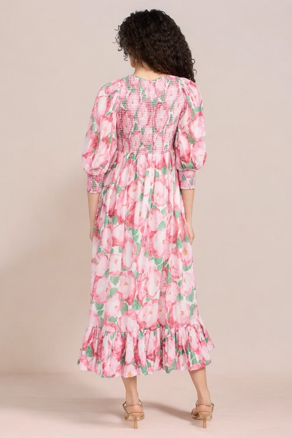 The Bohemian Smocking Dress is cut on our very soft and light GOTS certified cotton quality. It has a Midi length, round neckline, and elbow length, puffed sleeves. The top is made of smocking and the skirt in midi length.