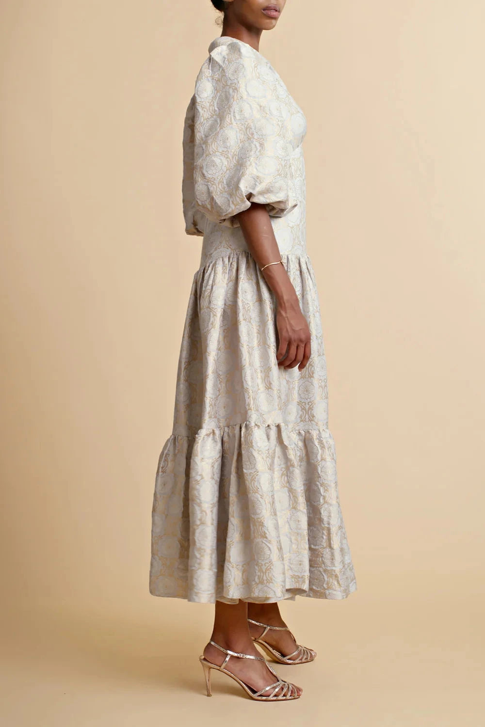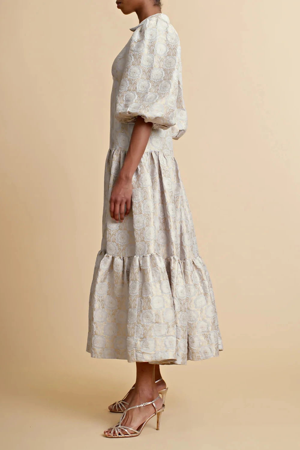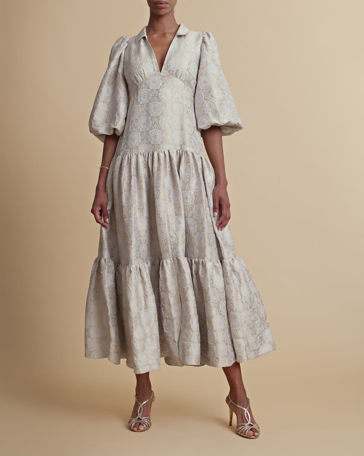 The Brocade Midi Dress is cut in our shiny FSC certified viscose blend with a decorative, gold brocade pattern of blossoms. It has a maxi length, fitted body with a voluminous skirt and three quarter long, voluminous sleeves with elastic cuffs. The dress has a v-neck and shirt collar detail.
