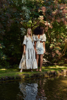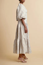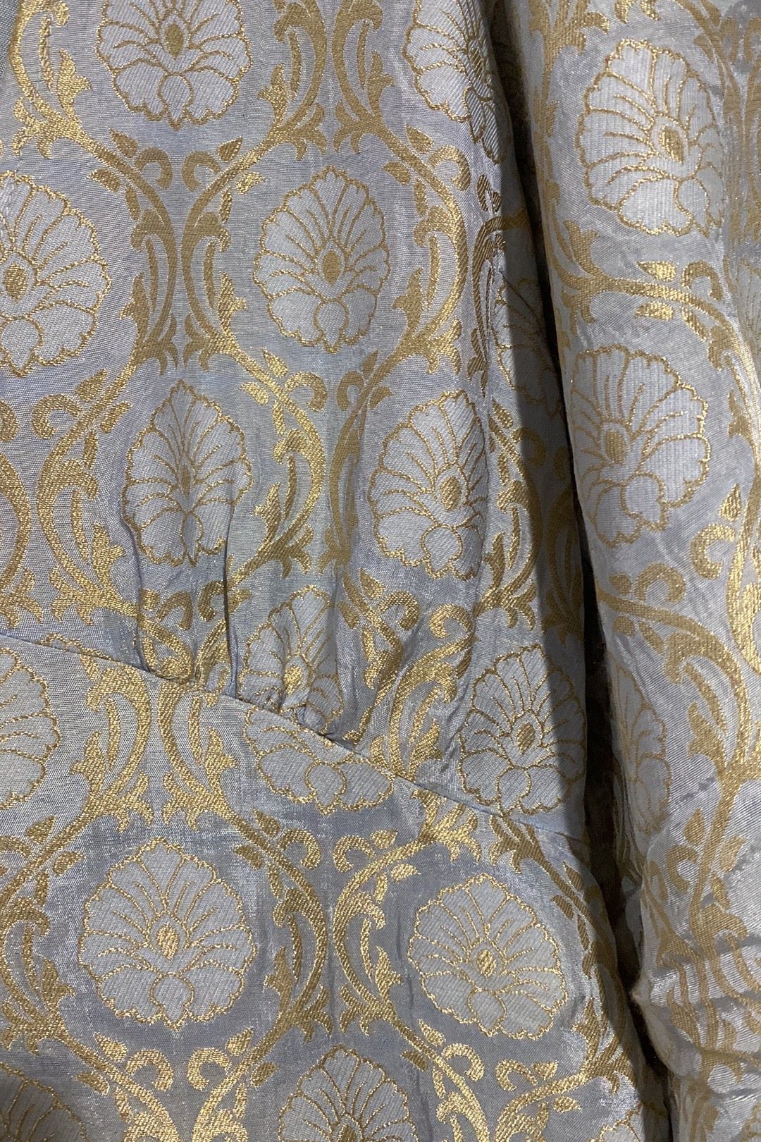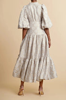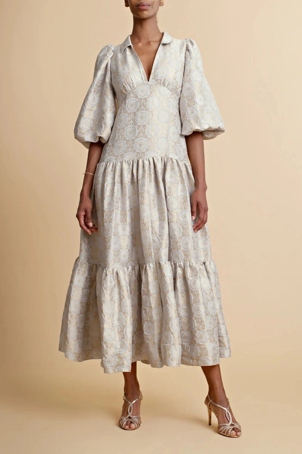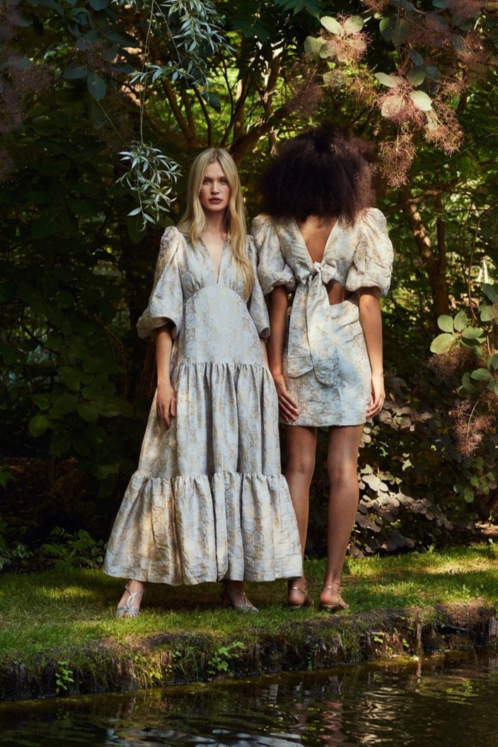 The Brocade Midi Dress is cut in our shiny FSC certified viscose blend with a decorative, gold brocade pattern of blossoms. It has a maxi length, fitted body with a voluminous skirt and three quarter long, voluminous sleeves with elastic cuffs. The dress has a v-neck and shirt collar detail.