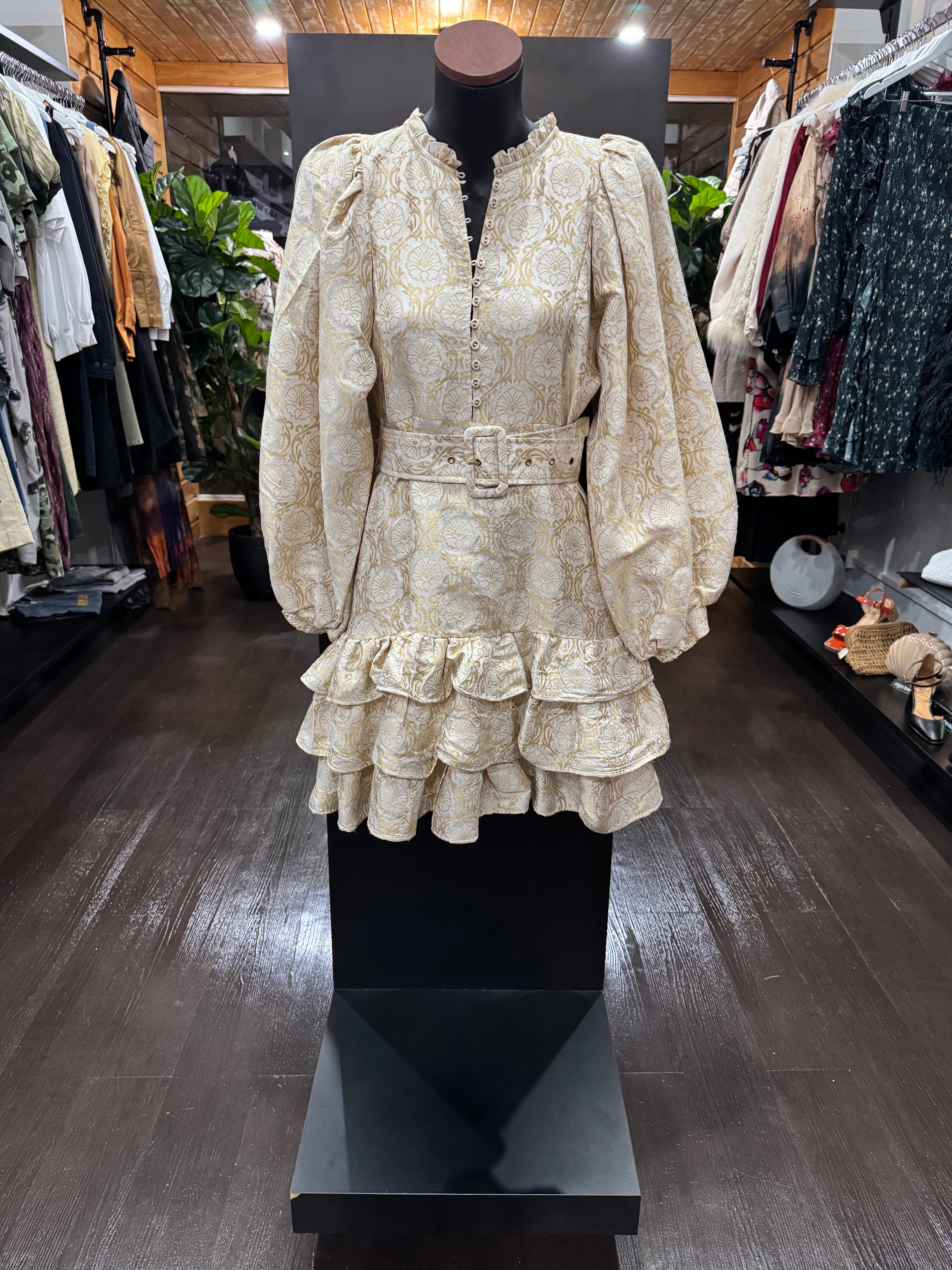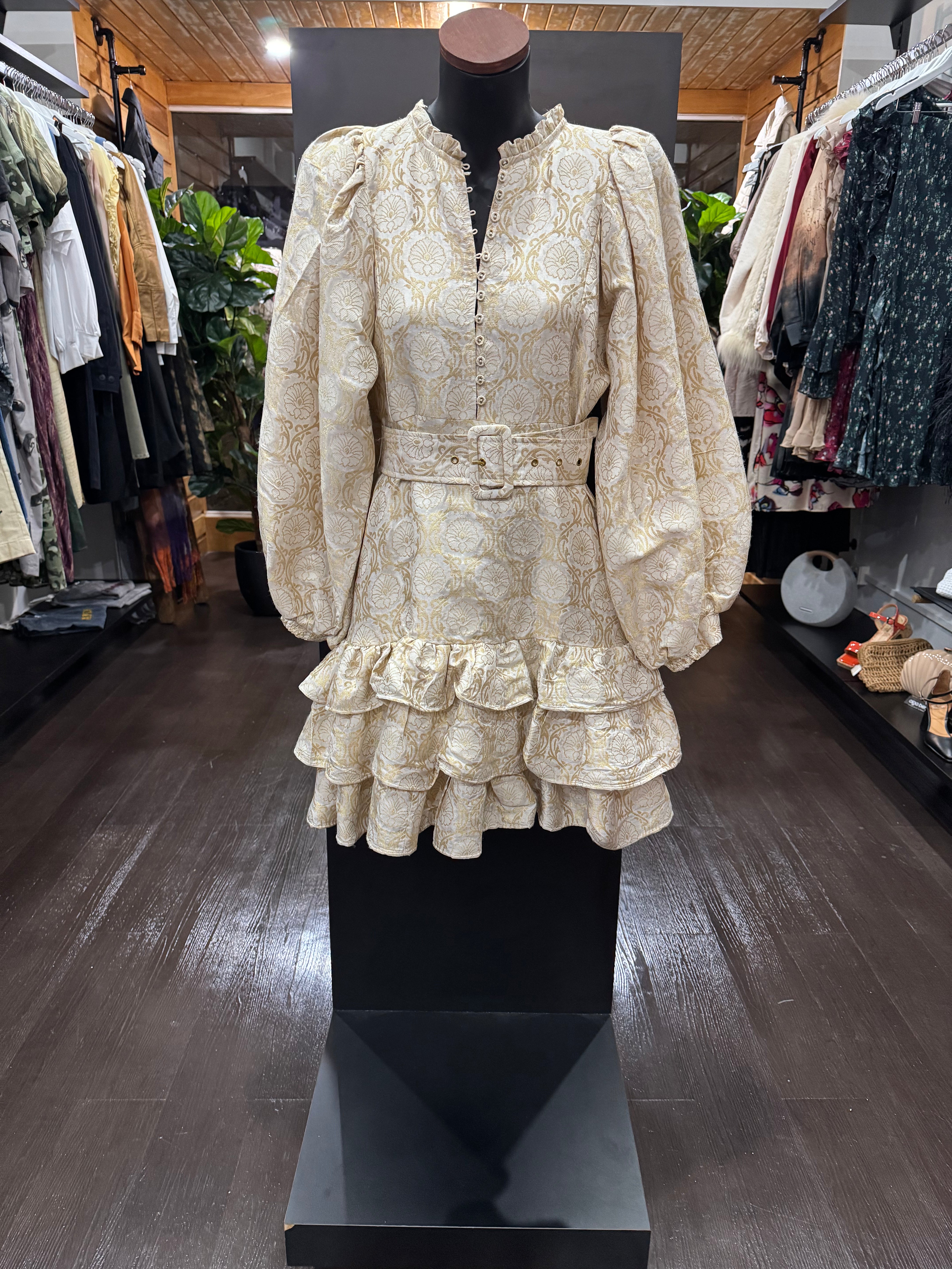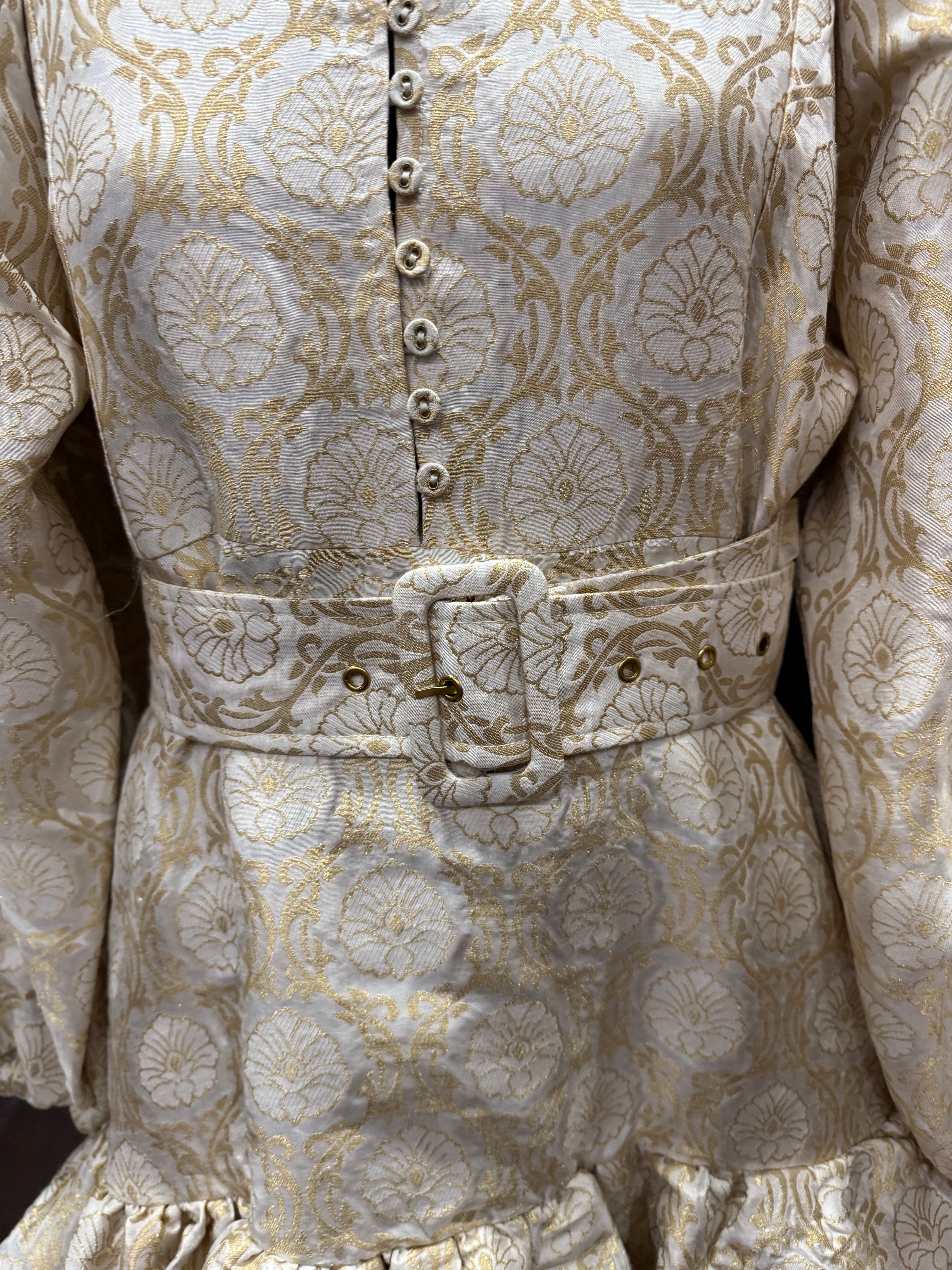 The Brocade MidniDress is cut in our shiny FSC certified viscose blend with a decorative, gold brocade pattern of blossoms. It has a mini length, fitted body with a tiered skirt and full length, voluminous sleeves with elastic cuffs.