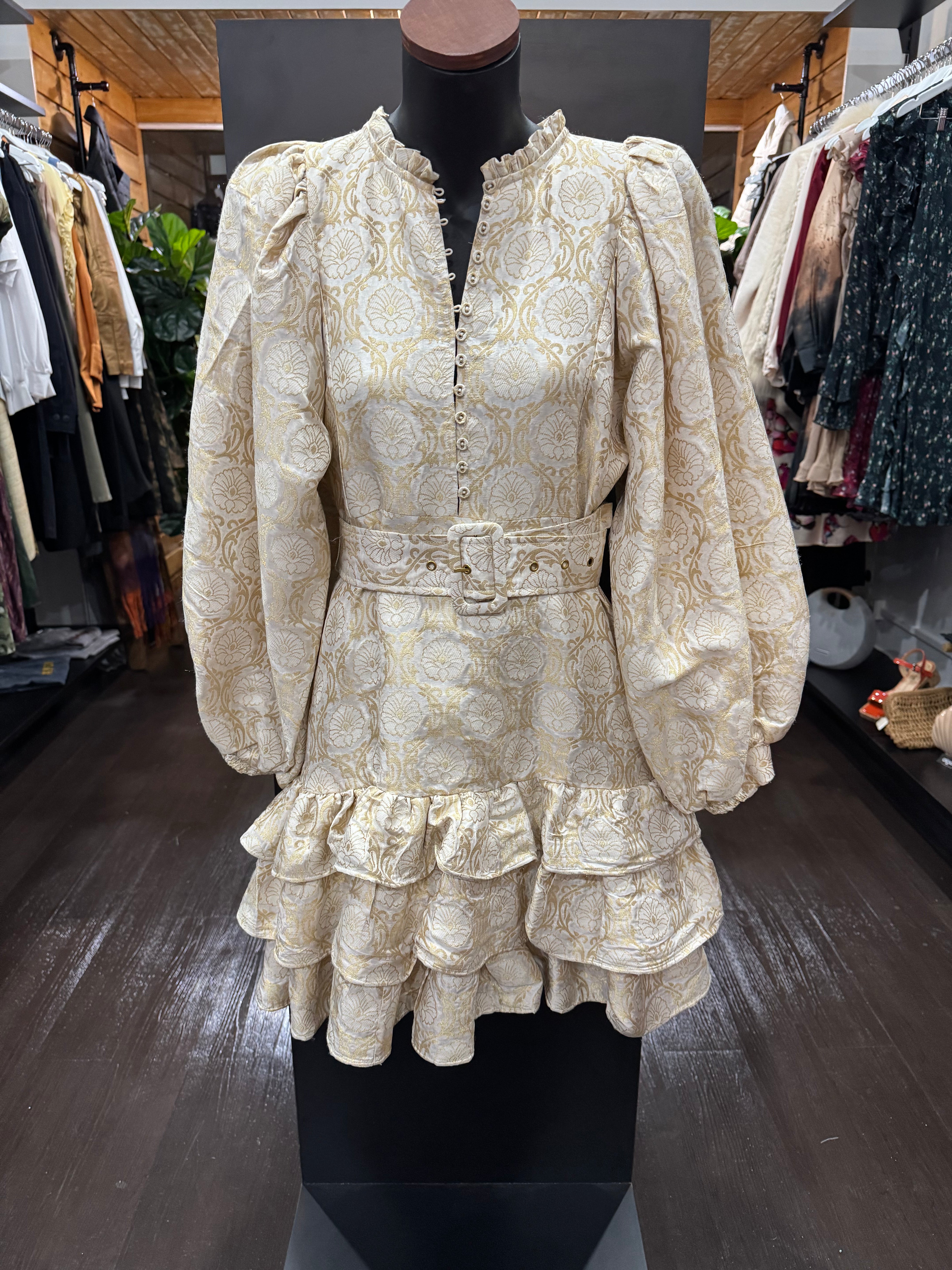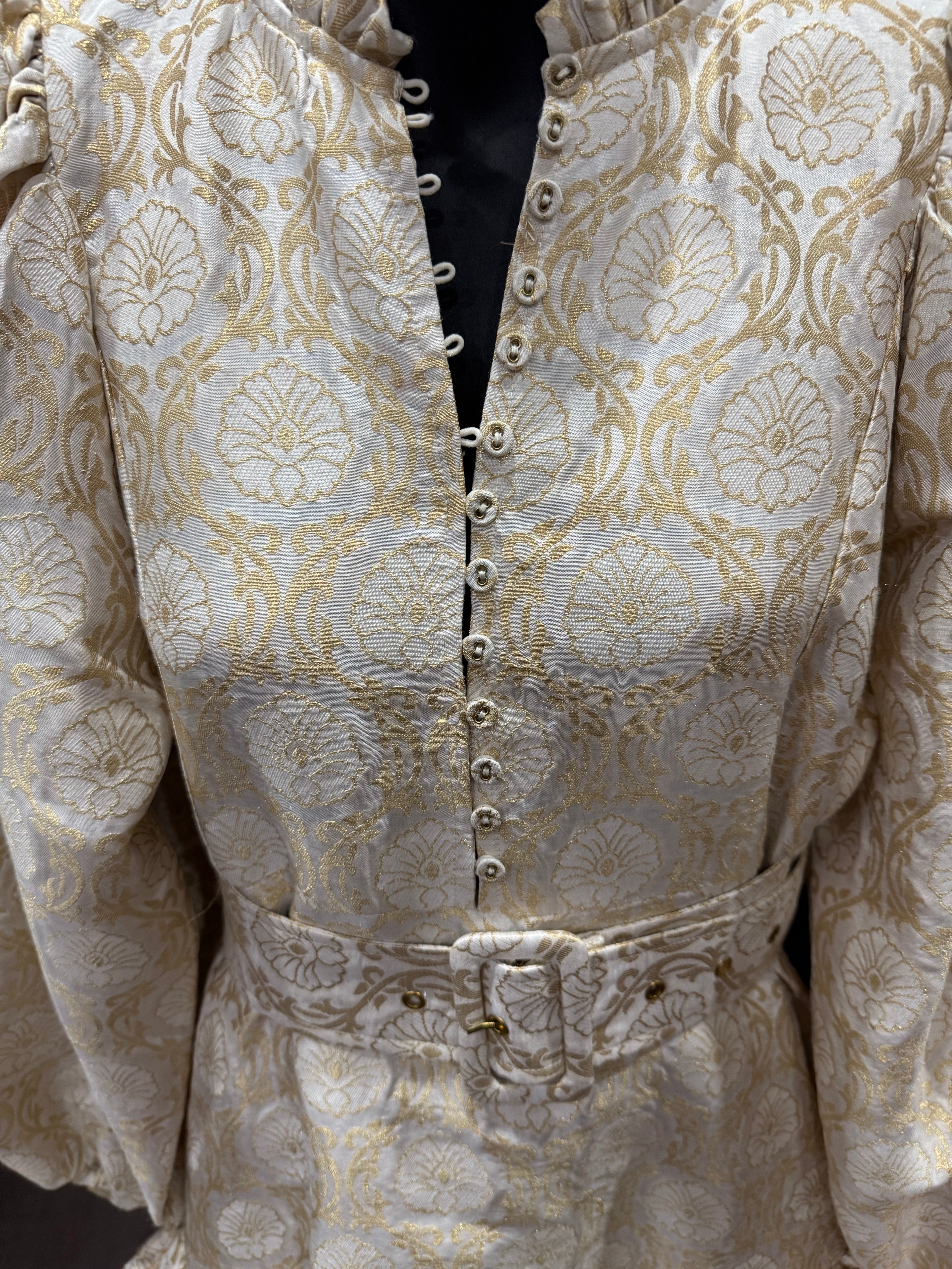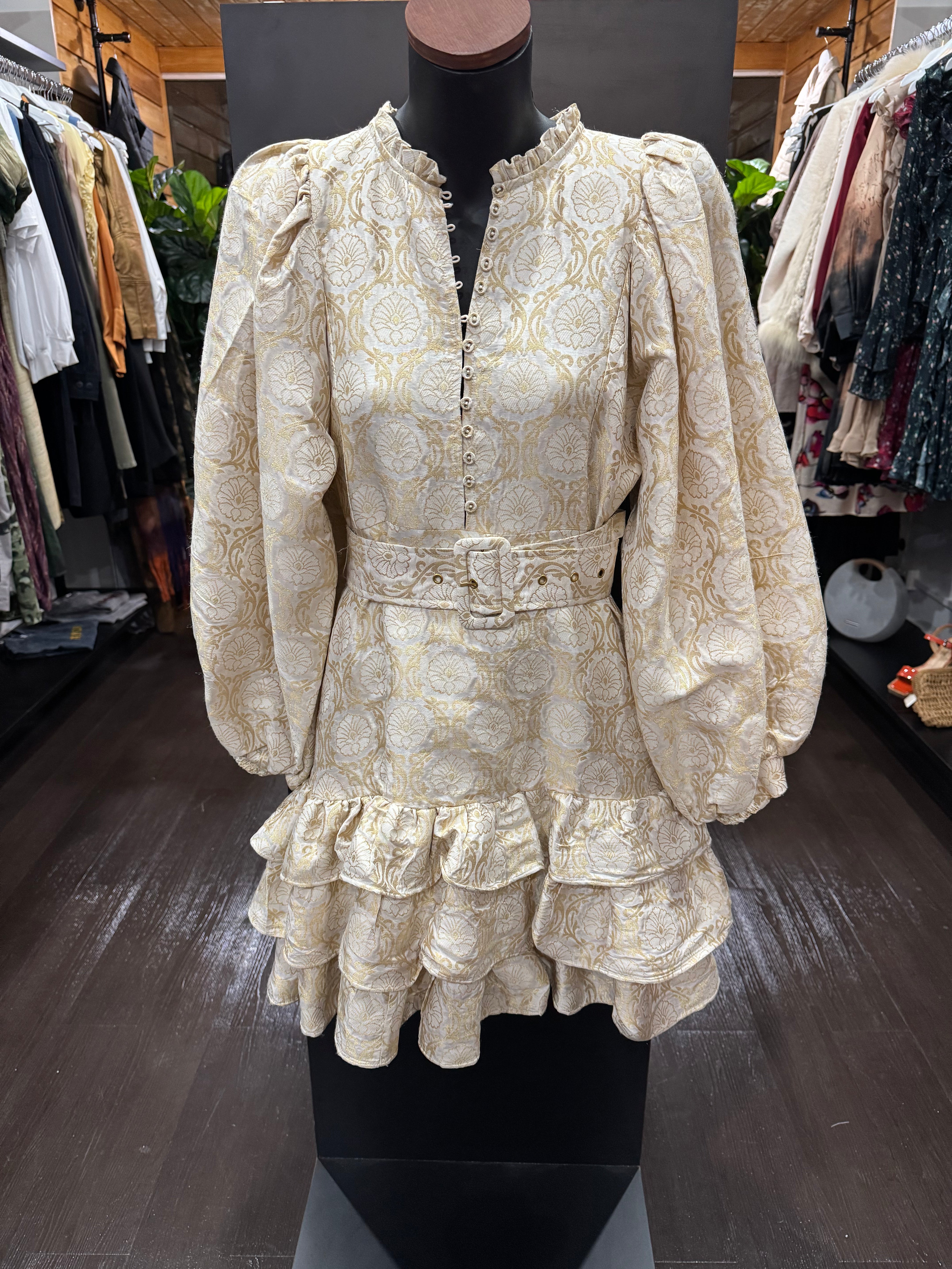 The Brocade MidniDress is cut in our shiny FSC certified viscose blend with a decorative, gold brocade pattern of blossoms. It has a mini length, fitted body with a tiered skirt and full length, voluminous sleeves with elastic cuffs.