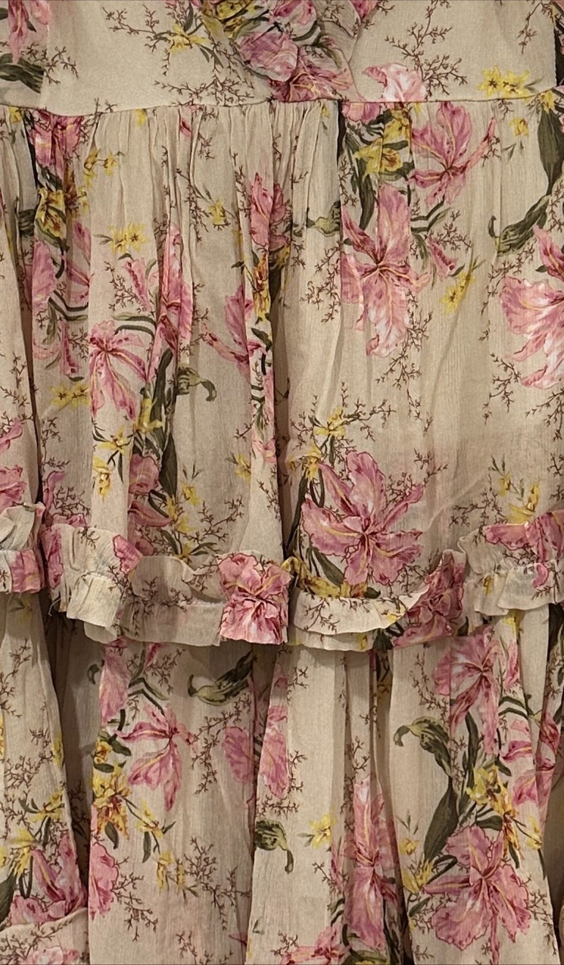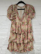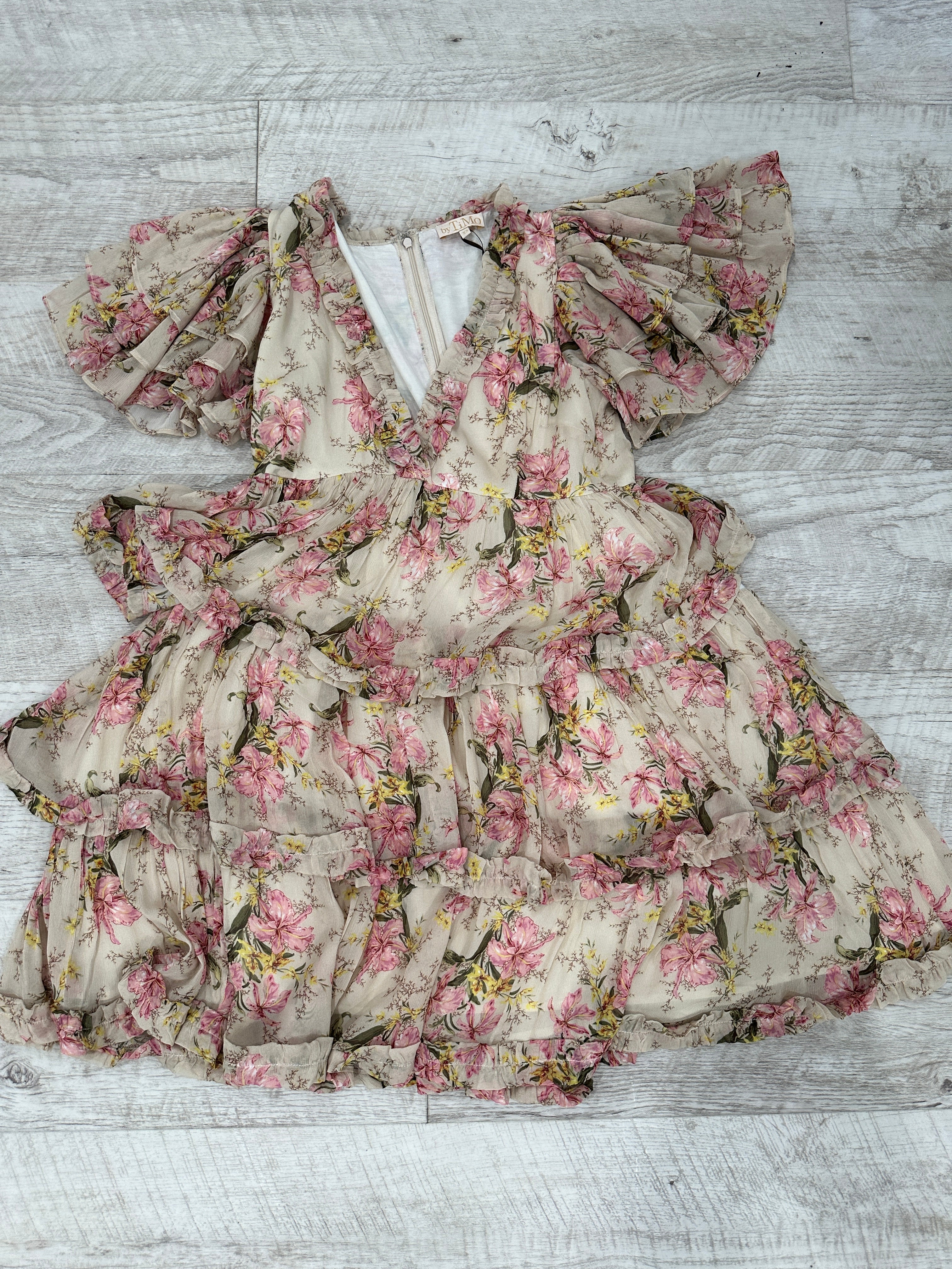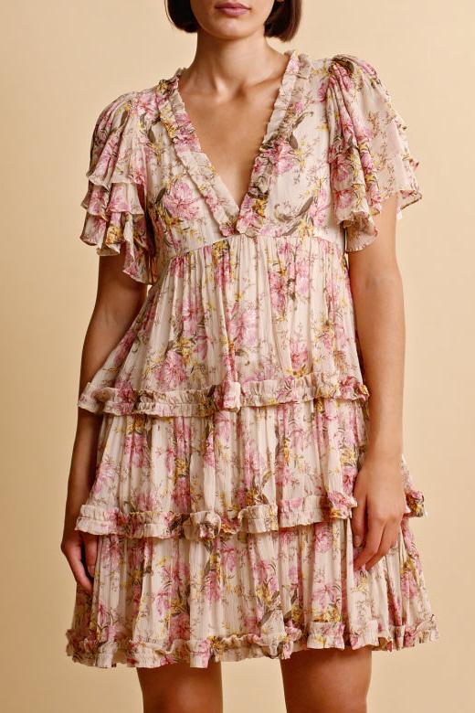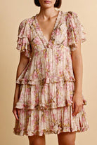 True to byTiMo's feminine aesthetic, this floral mini dress pairs its ruffled v-neck with an easy to wear waistband to highlight natural curves. The flowy chiffon silhouette features butterfly ruffled sleeves and a tiered hem for voluminous appeal.