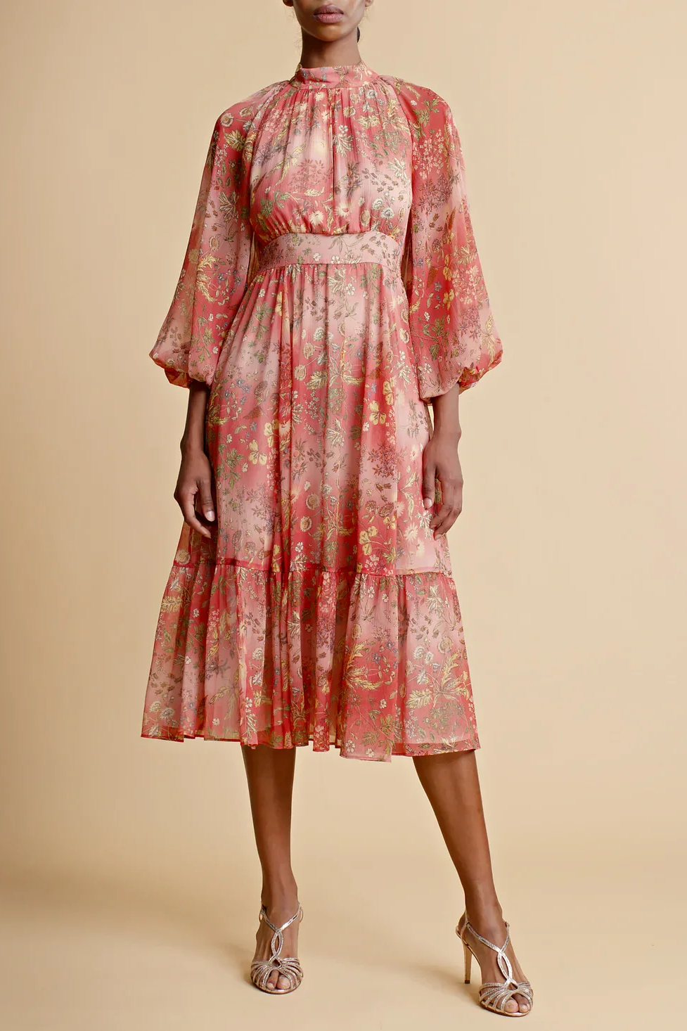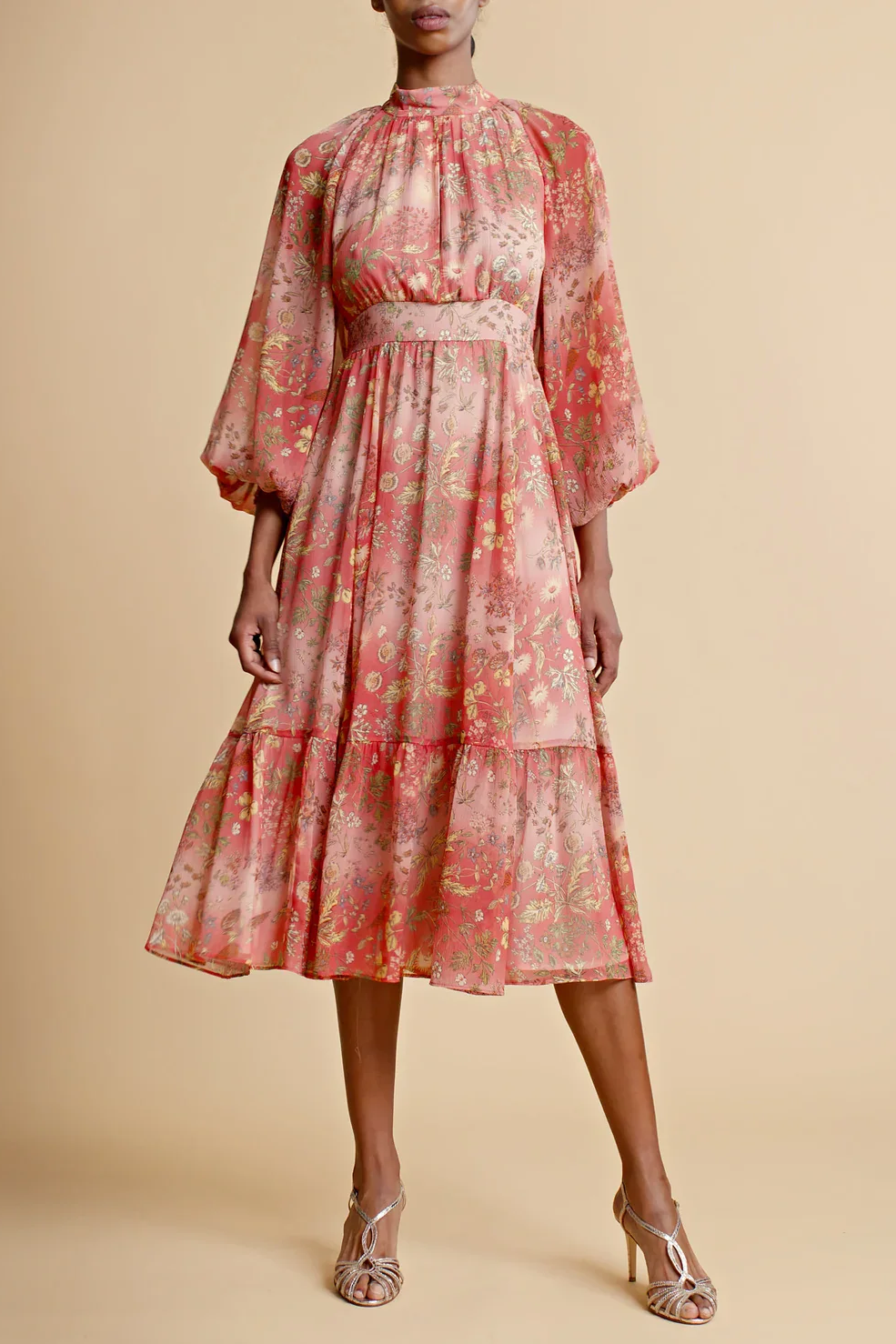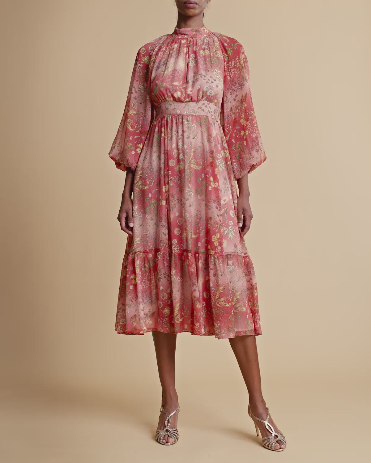 The Chiffon Open Back Dress is cut in our slightly sheer and airy, recycled polyester quality. It has a midi length, fitted waistline and long sleeves with elastic cuffs. the dress has a high neck, an open back and a tieband in the back of the neck.