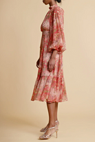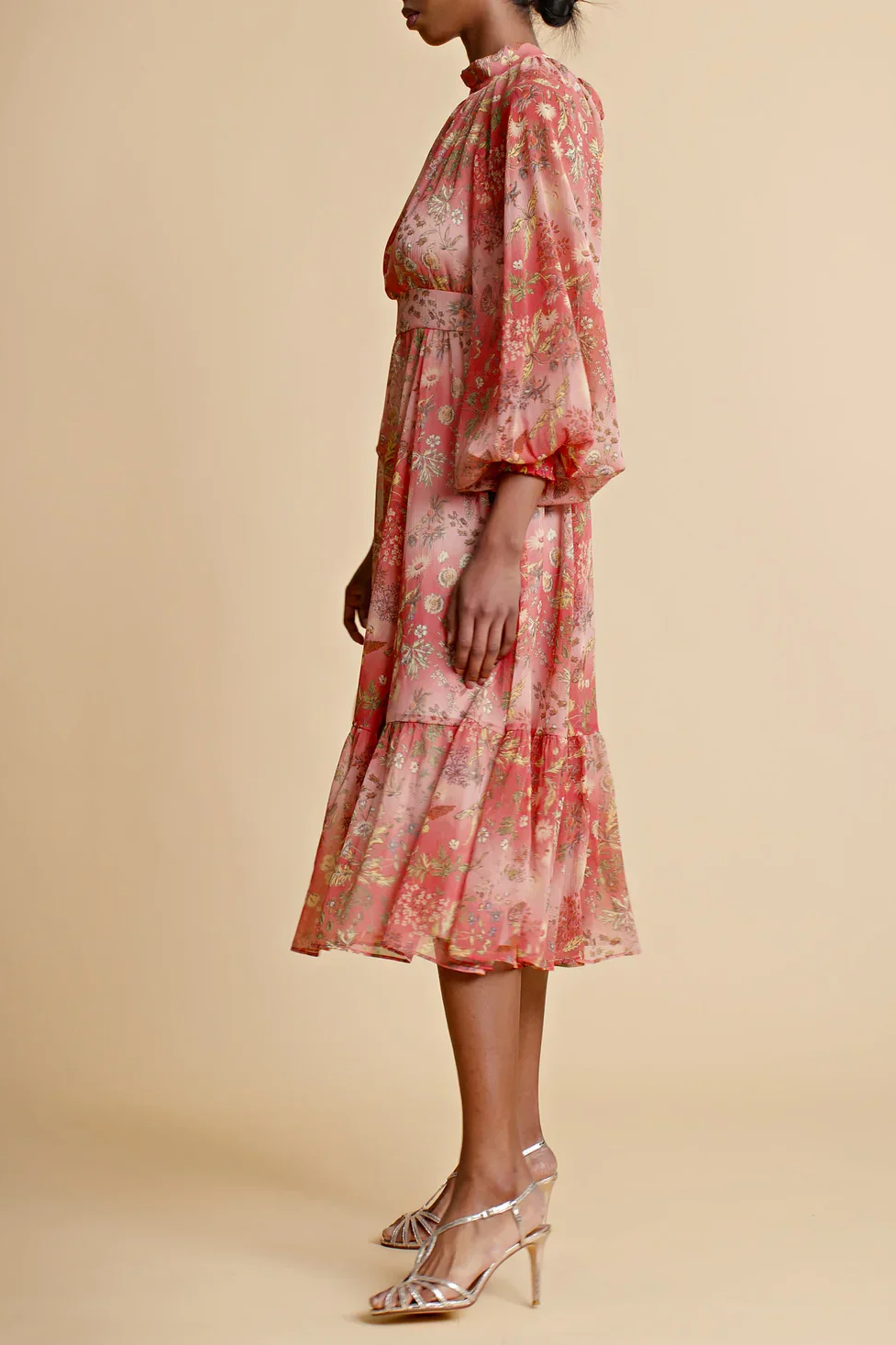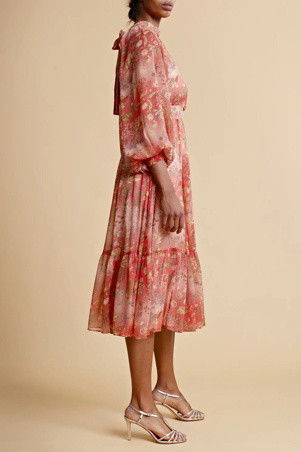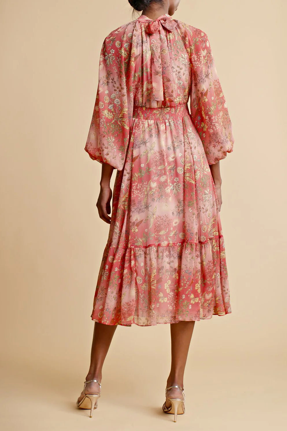 The Chiffon Open Back Dress is cut in our slightly sheer and airy, recycled polyester quality. It has a midi length, fitted waistline and long sleeves with elastic cuffs. the dress has a high neck, an open back and a tieband in the back of the neck.