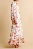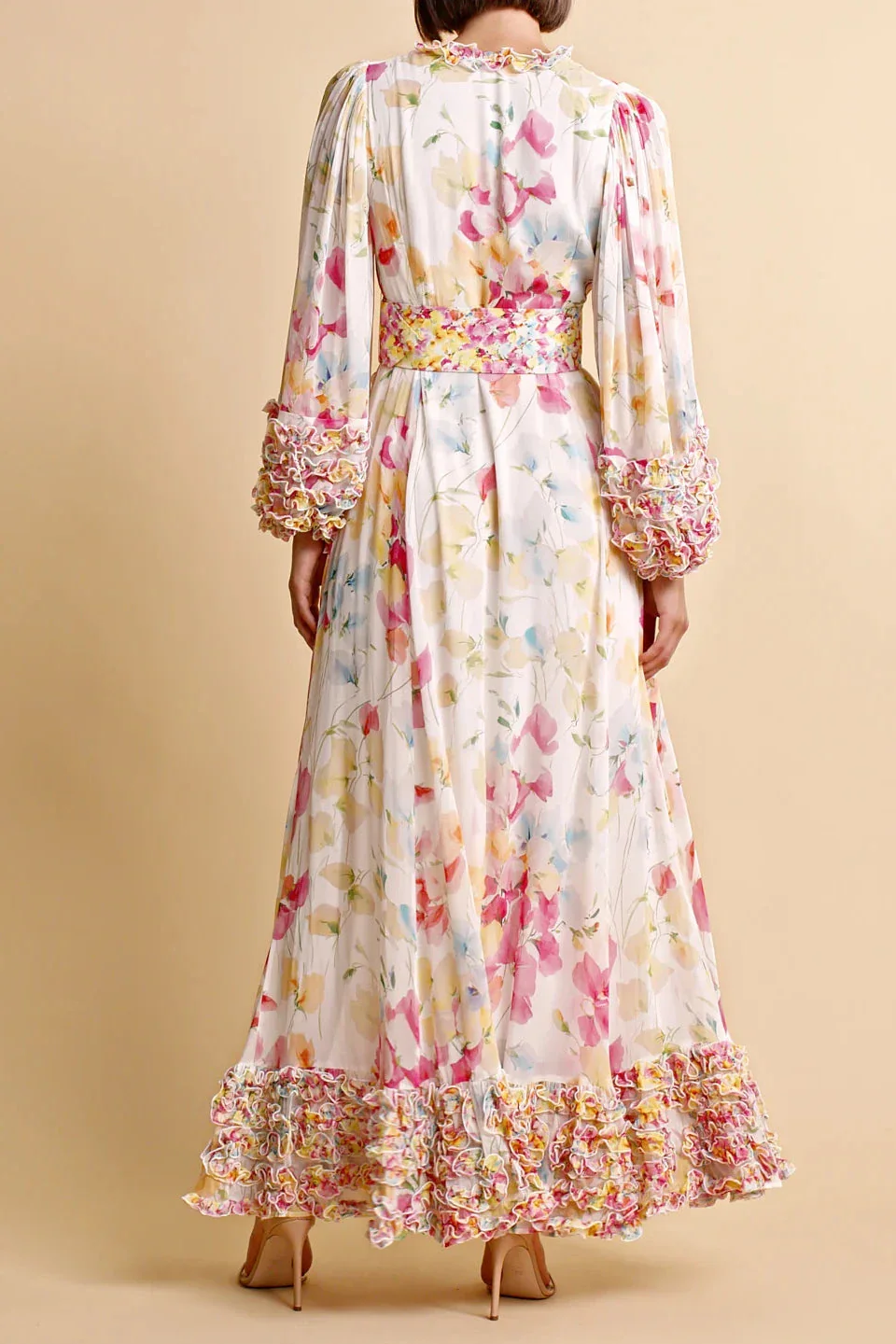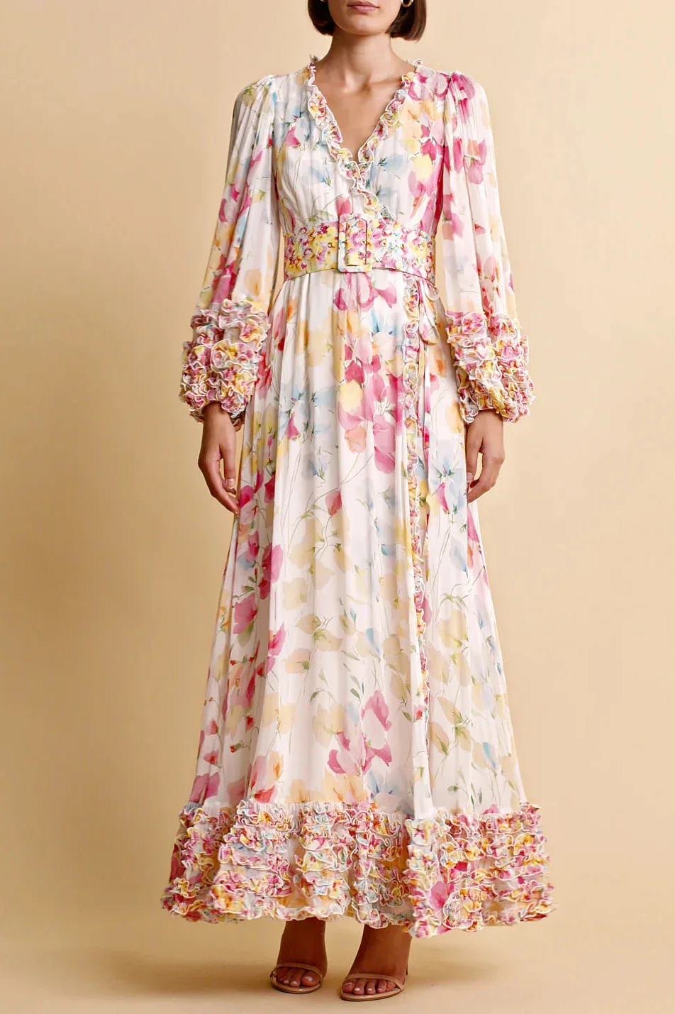 The Chiffon Wrap Dress is cut in our slightly sheer and airy, FSC certified and 100% sustainable viscose quality. It has a maxi length, a voluminous skirt, and long, bell sleeves with elastic cuffs. The dress has a V-neck and wraps in the waistline. The neckline, hem and cuffs have pretty ruffle details. The dress comes with a loose, matching belt.