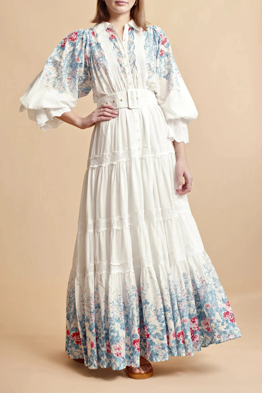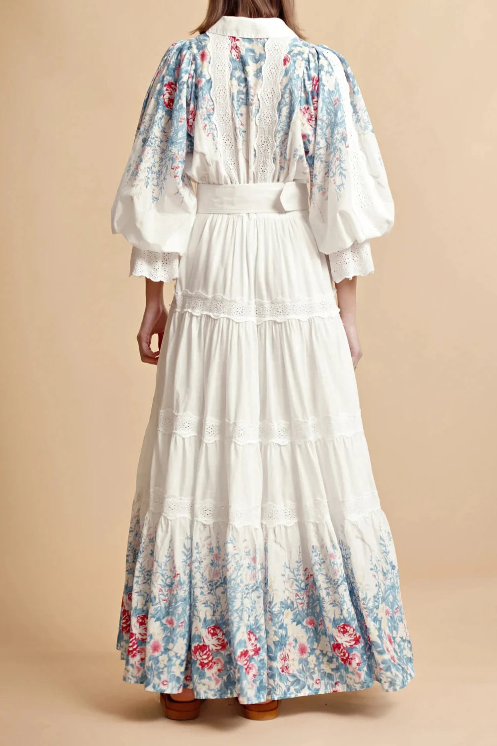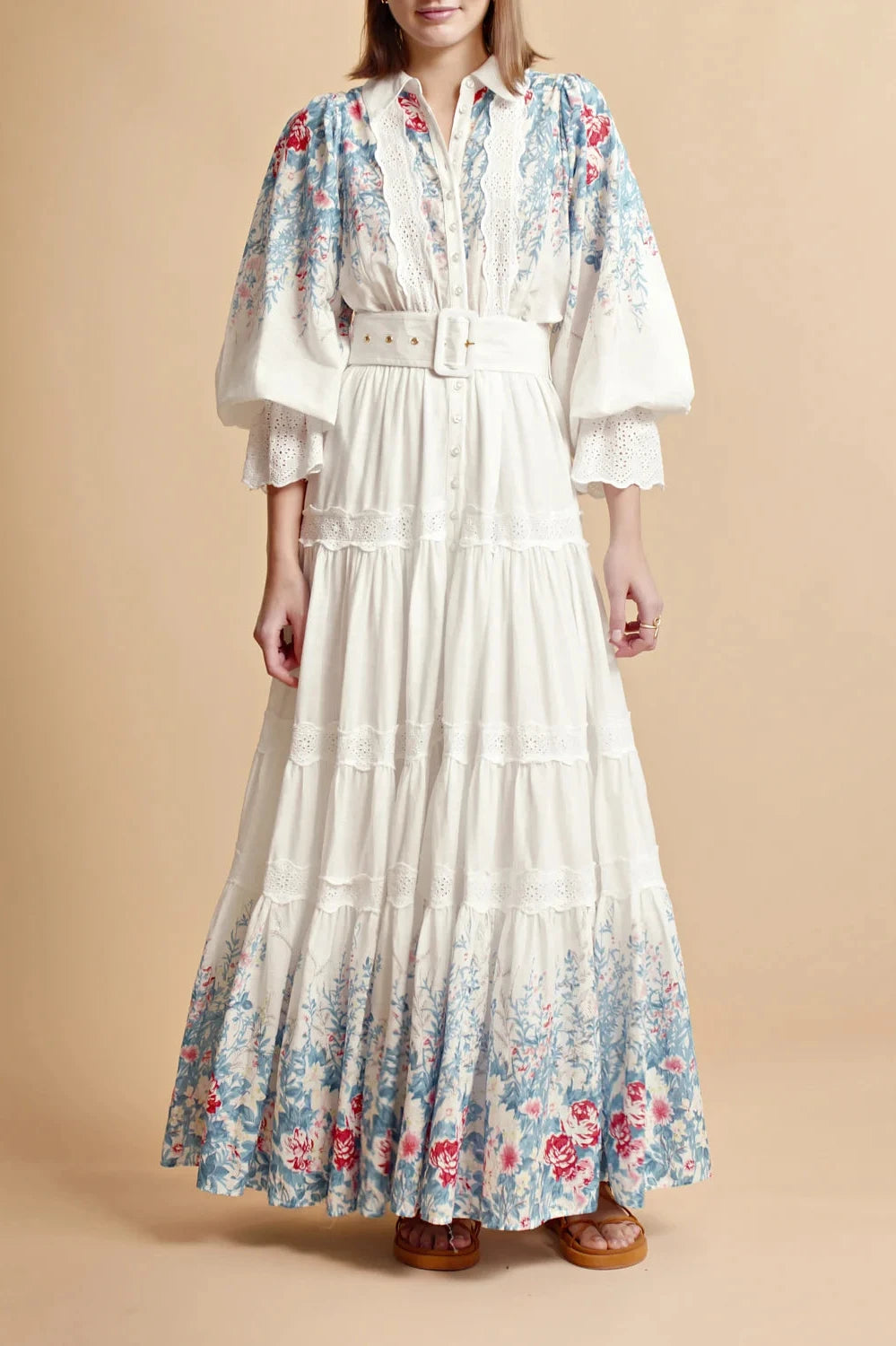 The Cotton Slub Maxi Dress is cut in our light and soft GOTS certified cotton quality, with slub detailing in the fabric. It has a maxi length, voluminous skirt, and long sleeves with elastic cuffs. The dress has a collar and buttons down the front. The dress comes with a loose, matching belt. The body and skirt of the dress has pretty broderie anglaise inserts.