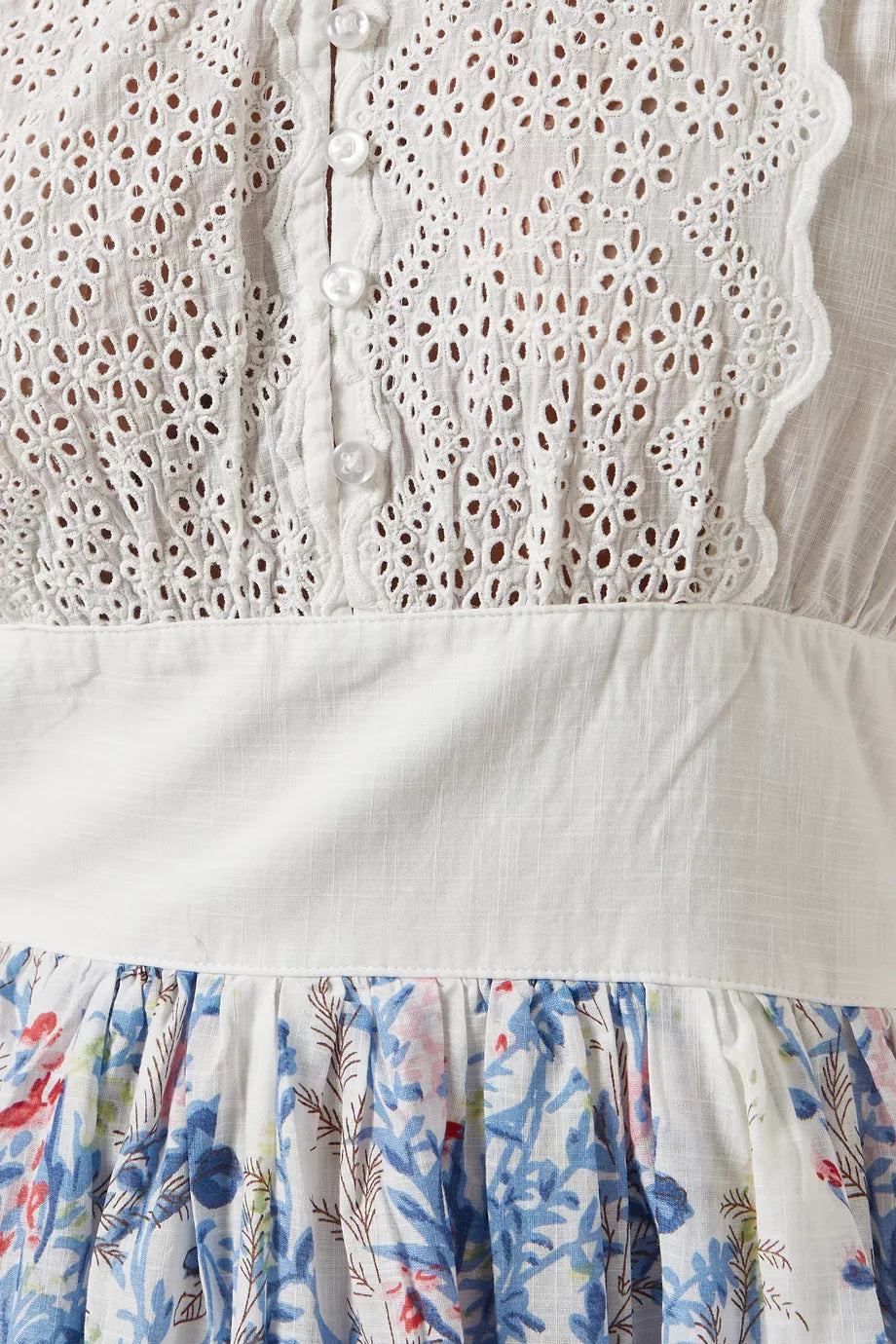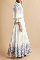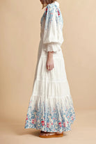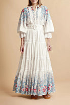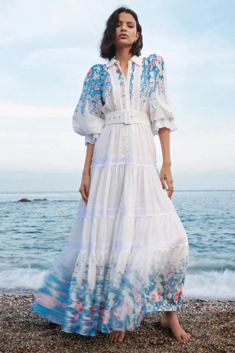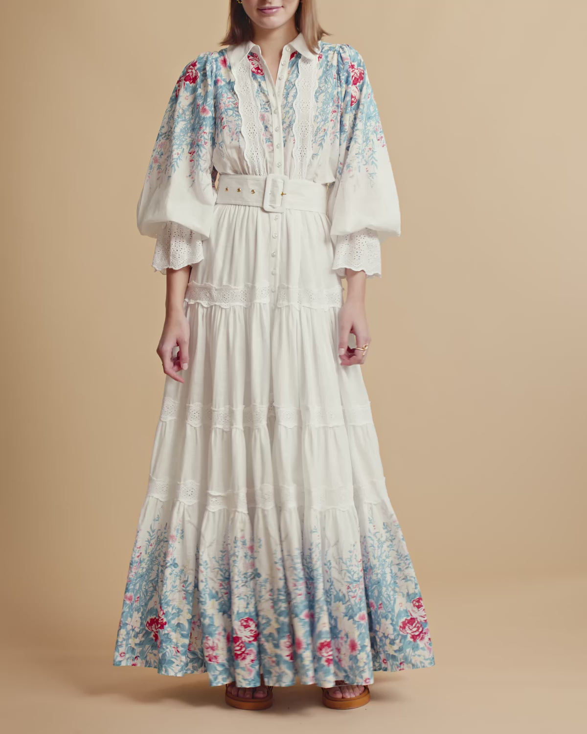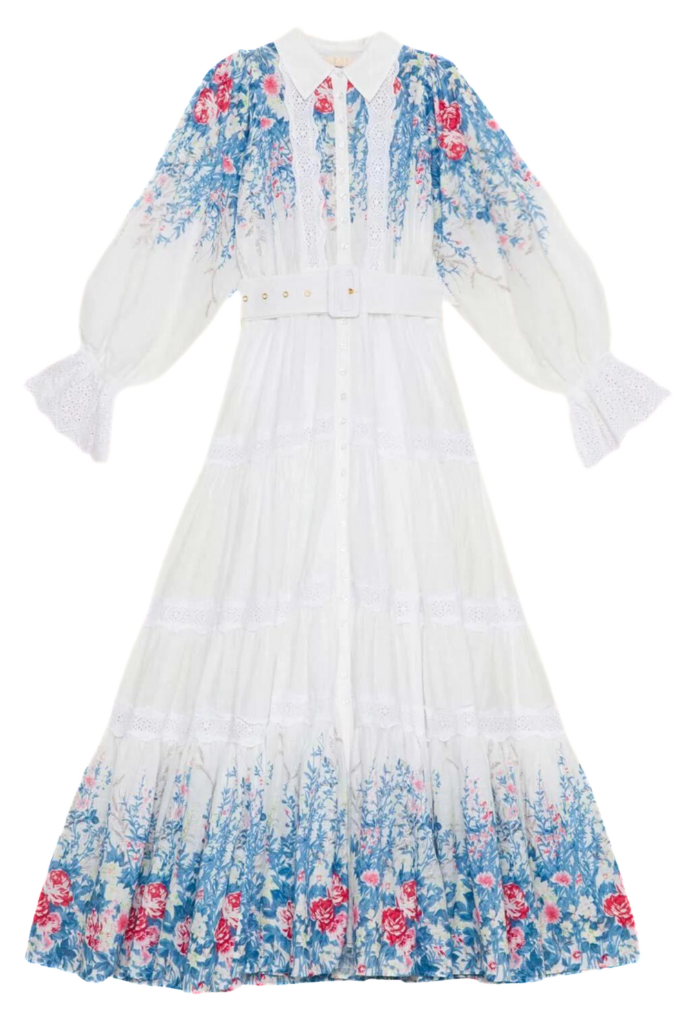 The Cotton Slub Maxi Dress is cut in our light and soft GOTS certified cotton quality, with slub detailing in the fabric. It has a maxi length, voluminous skirt, and long sleeves with elastic cuffs. The dress has a collar and buttons down the front. The dress comes with a loose, matching belt. The body and skirt of the dress has pretty broderie anglaise inserts.