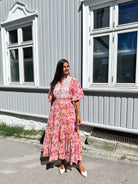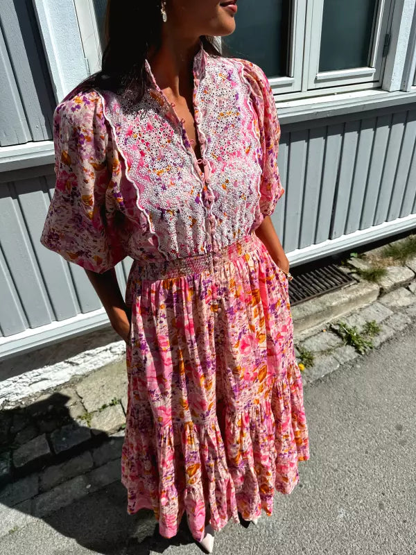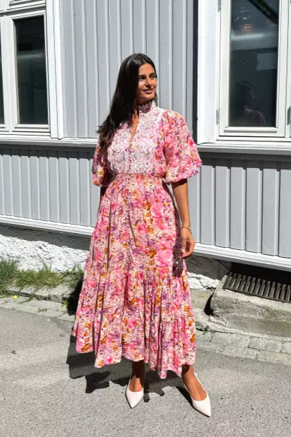 The Cotton Slub Midi Dress is cut in our light and soft FSC certified cotton & viscose quality, with slub detailing in the fabric. It has a midi length, voluminous skirt and three quarter long voluminous sleeves with elastic cuffs. The dress has a high neckline with buttons down the front. It has a fitted waistline made of smocking with an attached tie band with tassels. The sleeves, front and back of the dress has pretty broderie anglaise inserts.