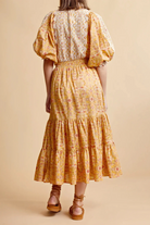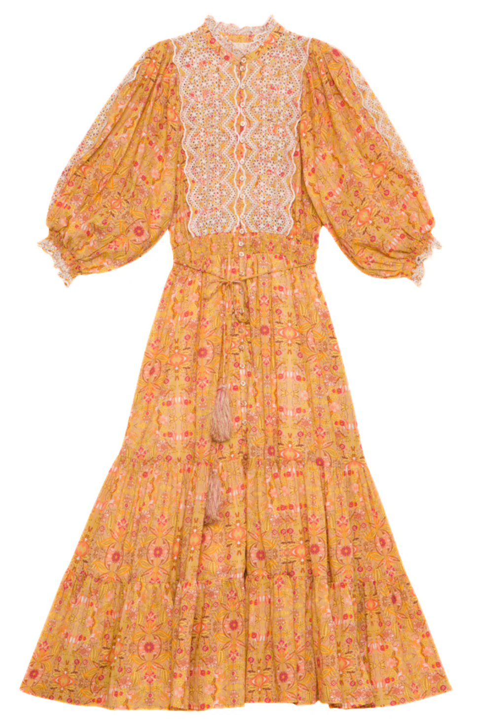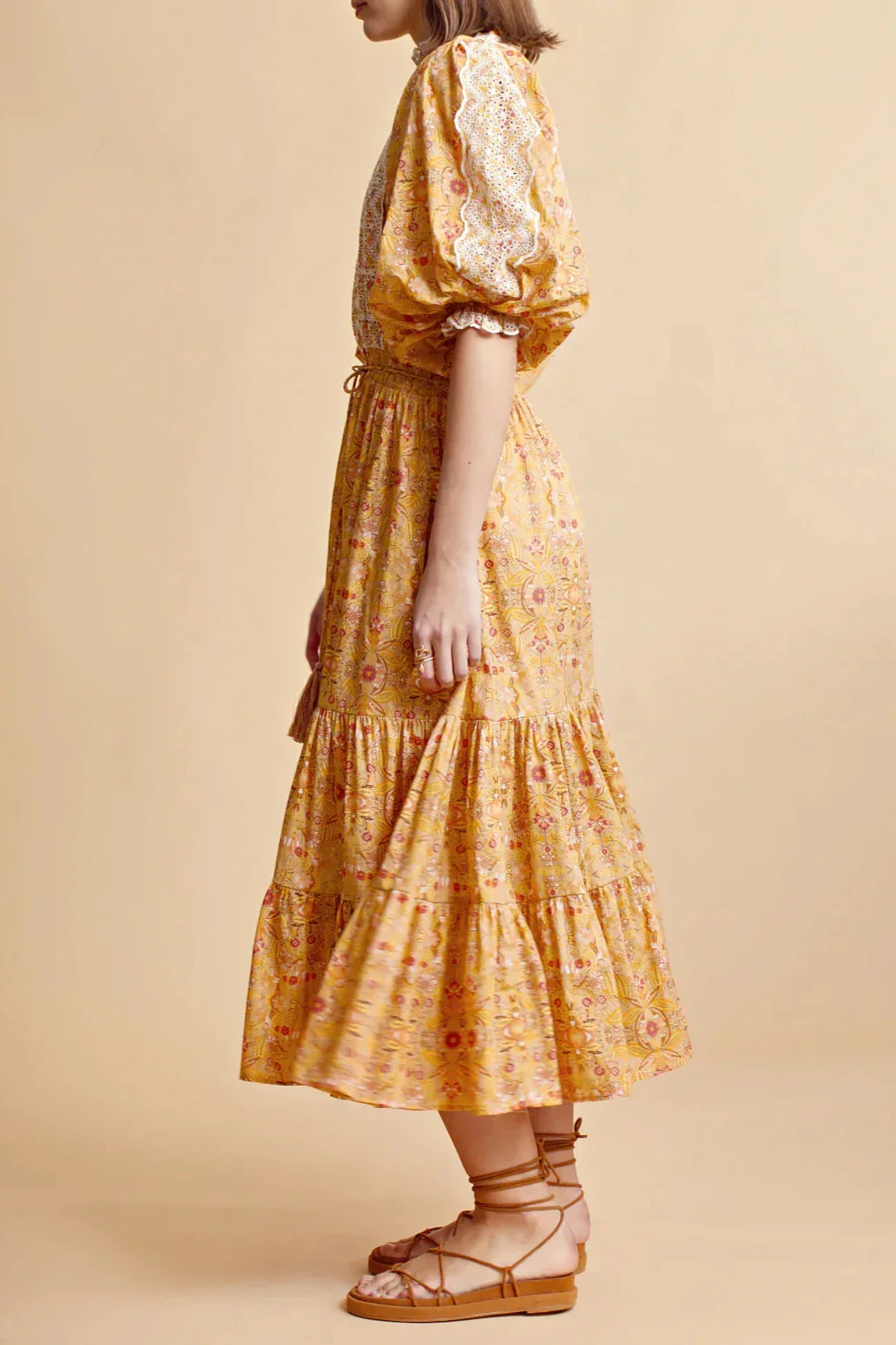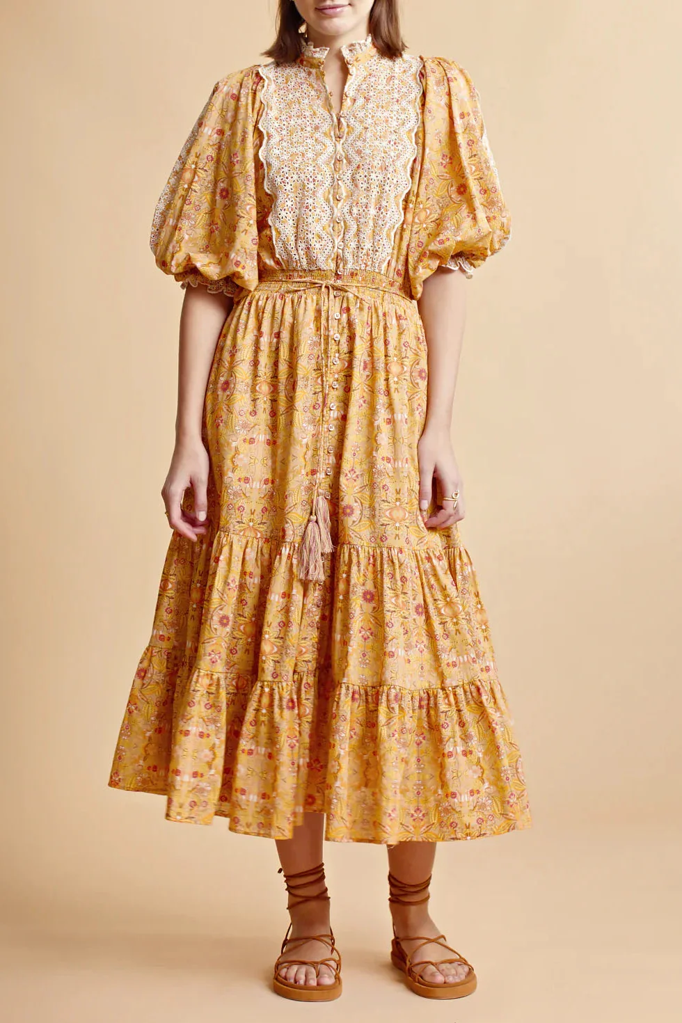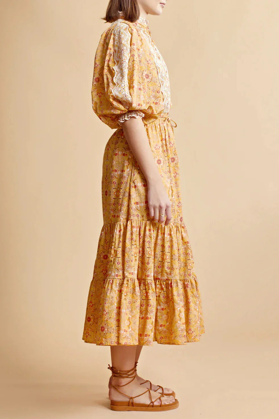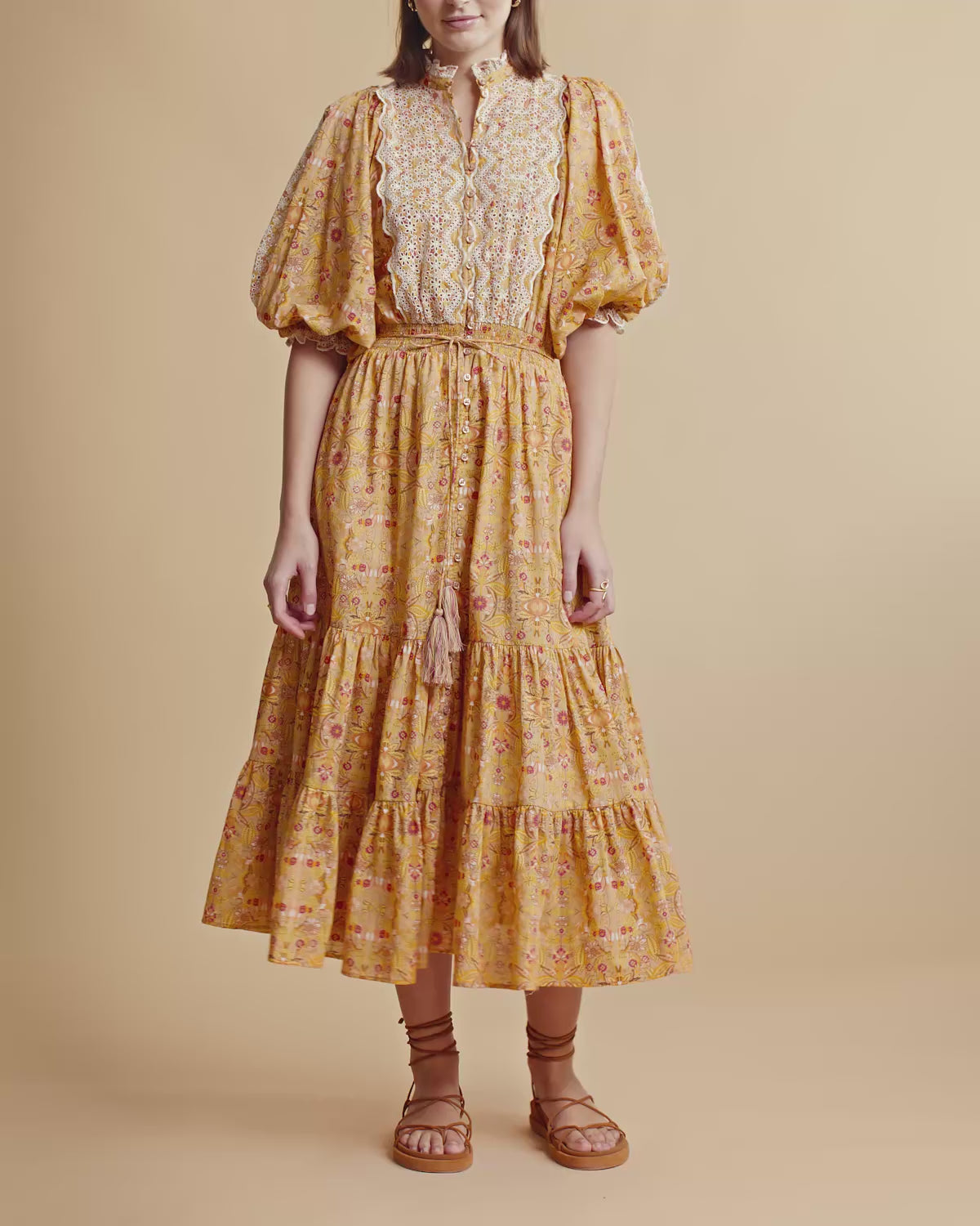 The Cotton Slub Midi Dress is cut in our light and soft GOTS certified cotton quality, with slub detailing in the fabric. It has a midi length, voluminous skirt and three quarter long voluminous sleeves with elastic cuffs. The dress has a high neckline with buttons down the front. It has a fitted waistline made of smocking with an attached tie band with tassels. The sleeves, front and back of the dress has pretty broderie anglaise inserts.