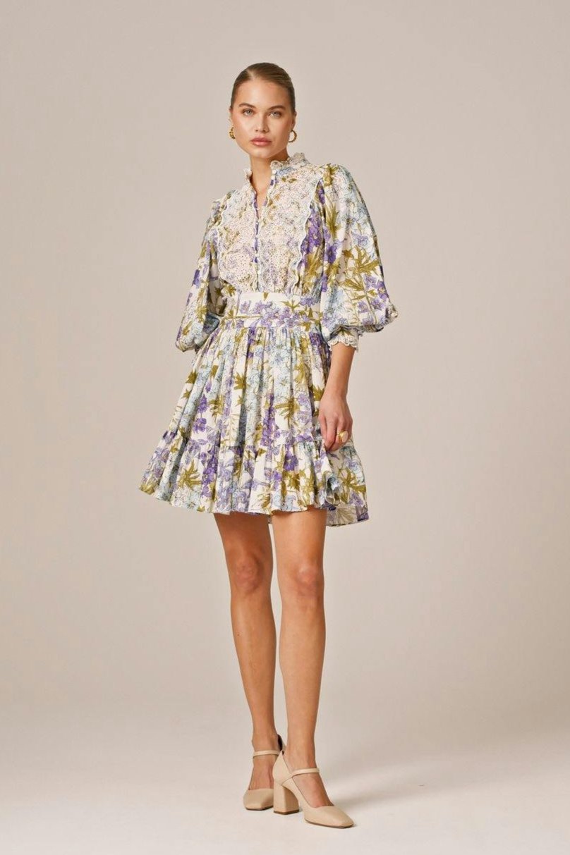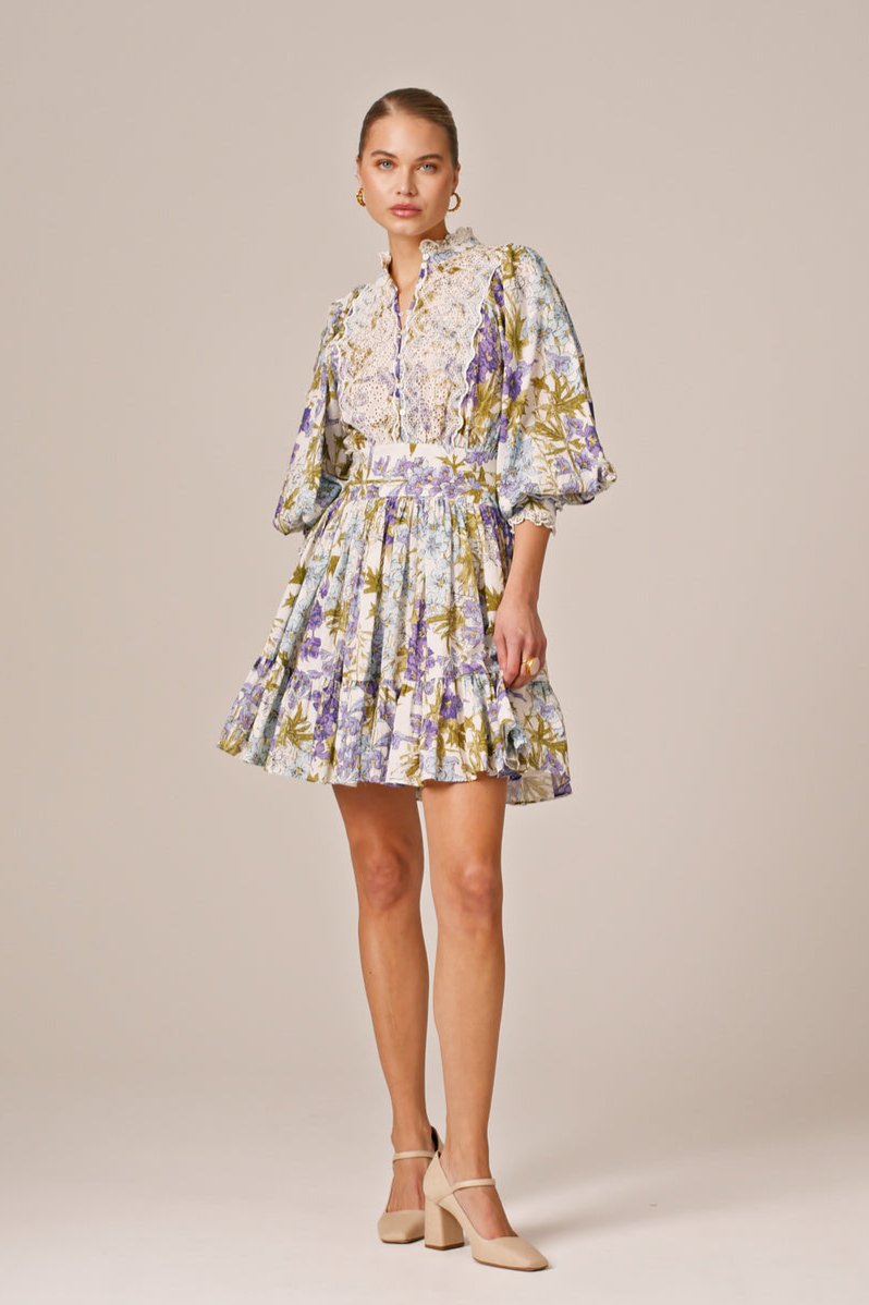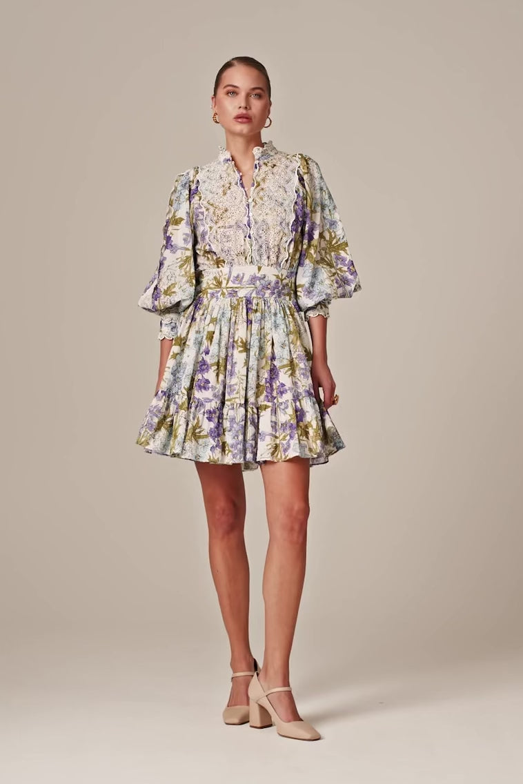 The Cotton Slub Mini Dress is cut in our light and soft FSC certified cotton & viscose quality, with slub detailing in the fabric. It has a mini length and goes in at the waistline with a belt. The dress has oversized, vintage inspired sleeves and is inserted with broderie anglaise details on the chest, sleeves, cuffs, and neckline.