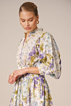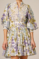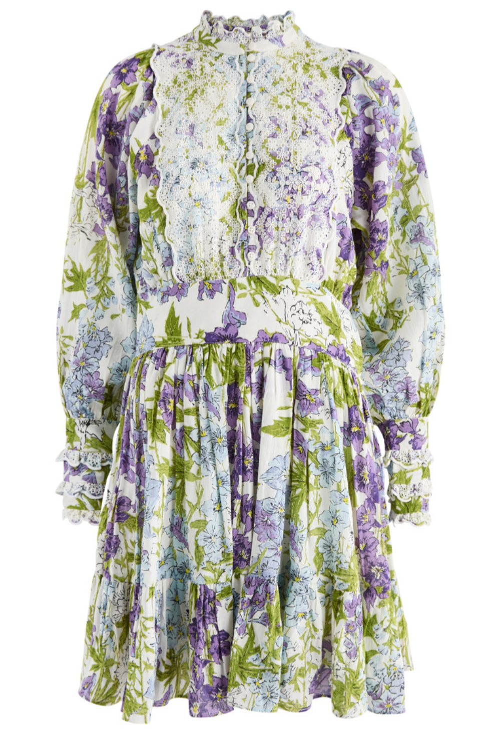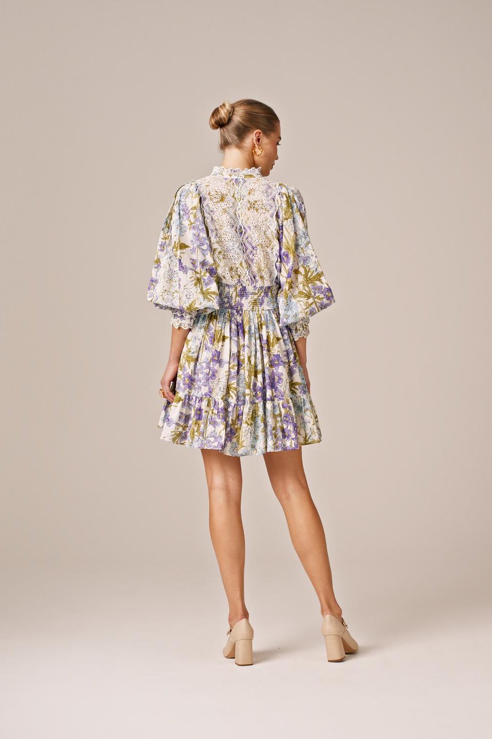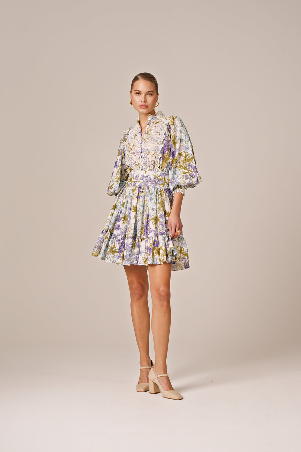 The Cotton Slub Mini Dress is cut in our light and soft FSC certified cotton & viscose quality, with slub detailing in the fabric. It has a mini length and goes in at the waistline with a belt. The dress has oversized, vintage inspired sleeves and is inserted with broderie anglaise details on the chest, sleeves, cuffs, and neckline.