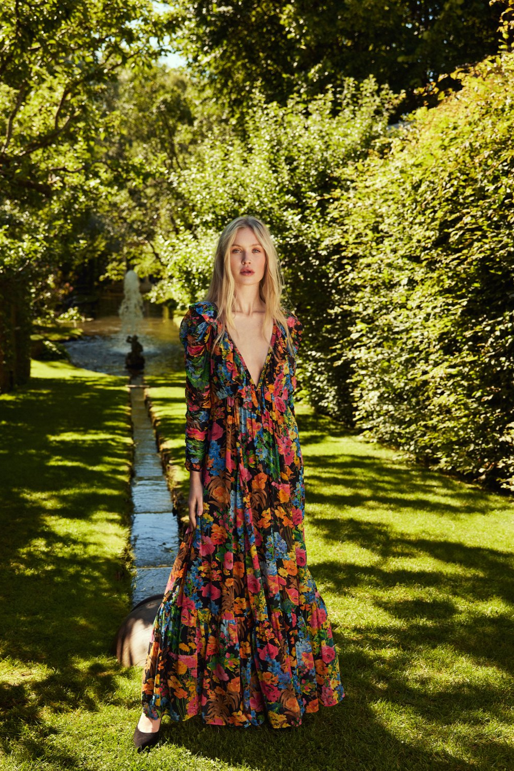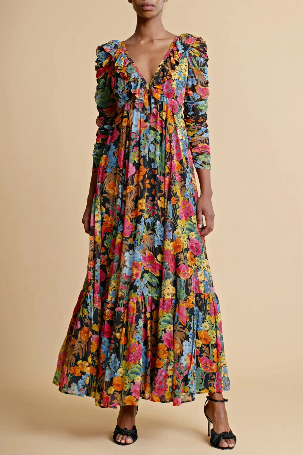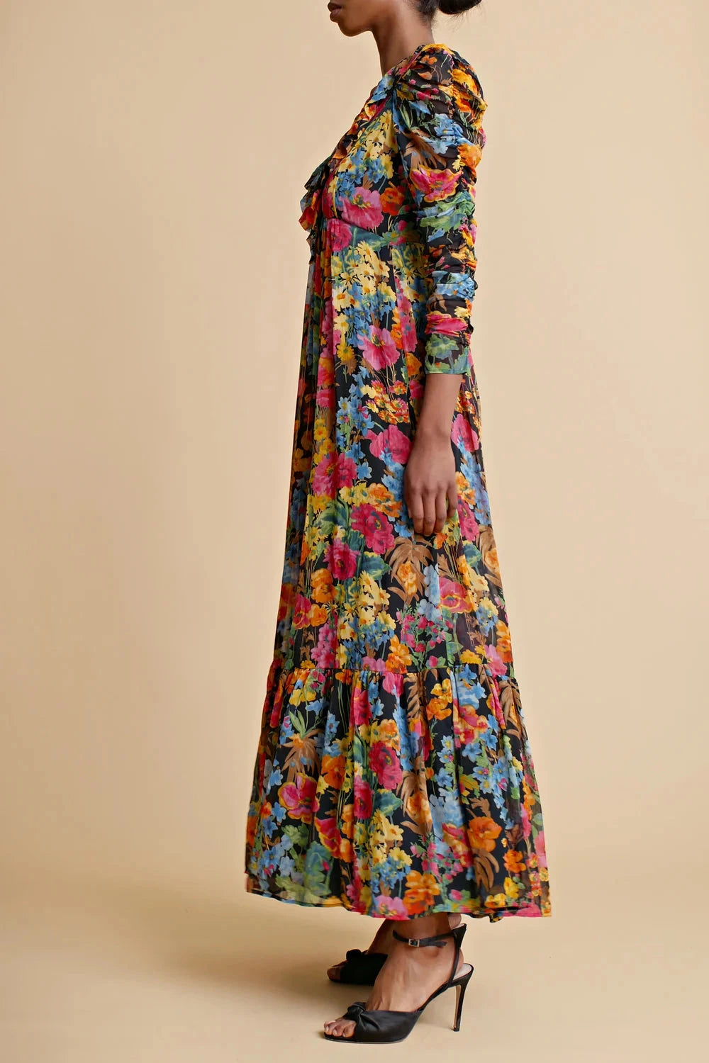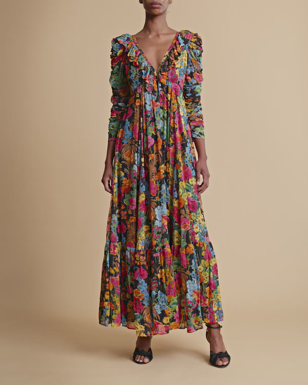 The Georgette Ruffle Dress is cut in our very delicate FSC certified viscose georgette quality. It has a maxi length, fitted waistline and voluminous skirt, and long sleeves made of rouching. The dress has a deep v-neck with ruffle details.