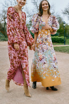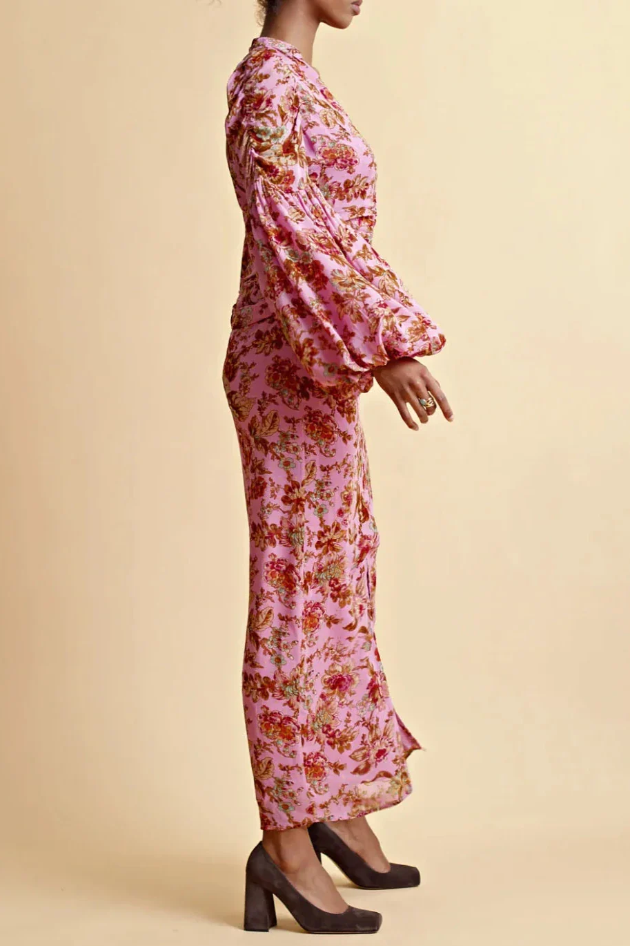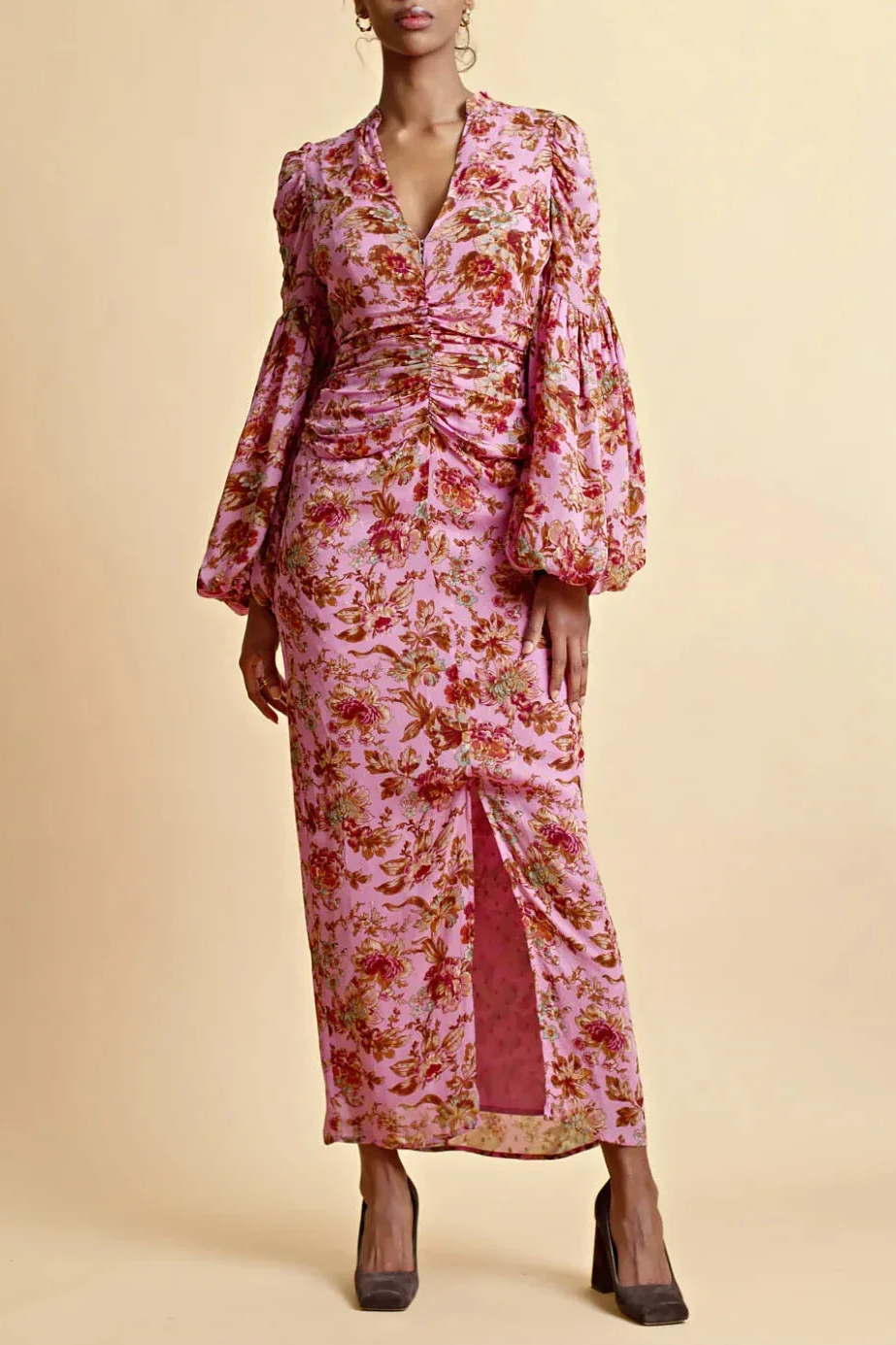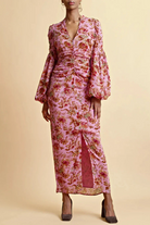 The Golden Georgette Rouching Dress is cut in our delicate and shiny FSC certified viscose georgette quality with painted gold dots, made of a jacquared weave in the fabric. It has a maxi length, fitted silhouette and long sleeves with smocking details down the shoulders and lots of volume from the elbows down. The sleeves are lined with organza. The dress has a mandarin collar, a V-neck and rouching in the waistline. The dress has a straight skirt with a split in the front.