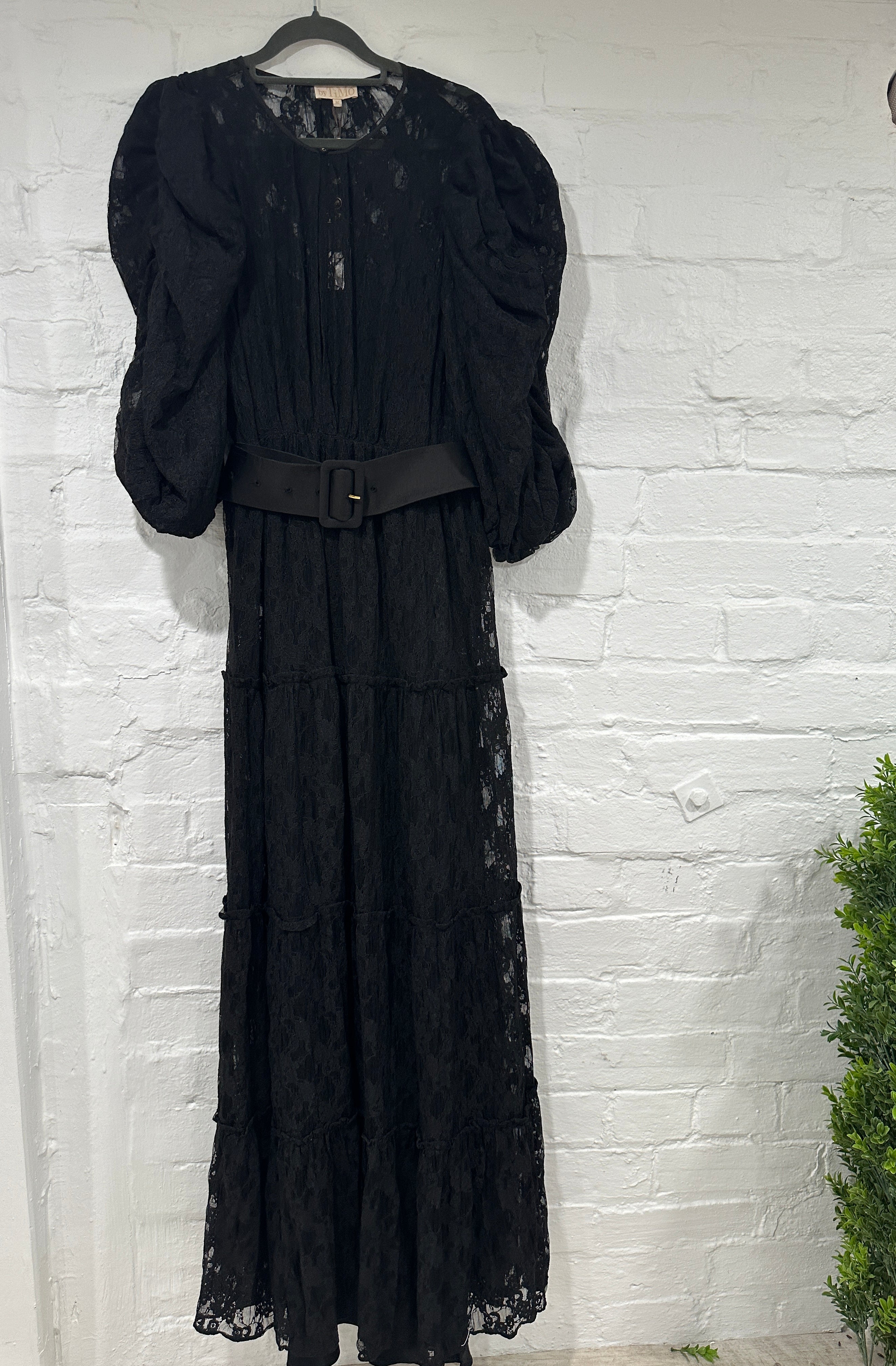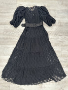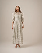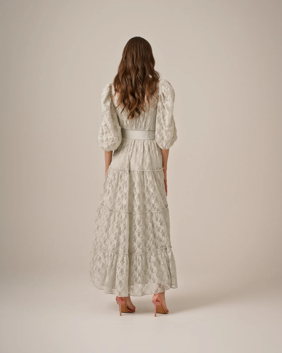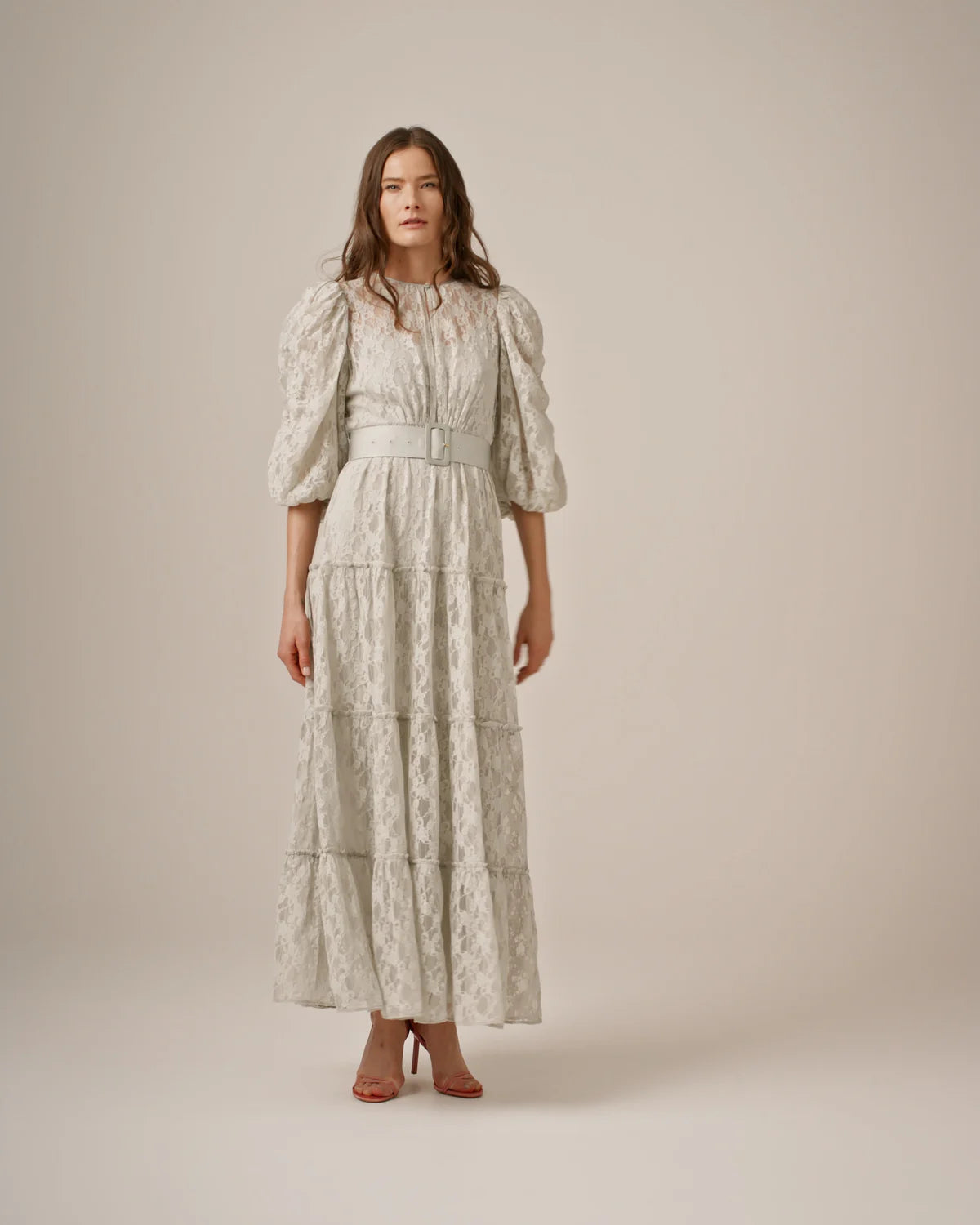The Lace Gown is cut in our fine, delicate nylon fabric, decorated with an elegant floral pattern. It has a maxi length, a round neckline and voluminous, elbow-length sleeves with elastic cuffs. The sleeves have puffed shoulders and are made of rouching. The skirt is tiered with ruffle trims. The top has a slit detail in the front with a button that can be attached in the neckline. The dress comes with an underneath matching slip dress.