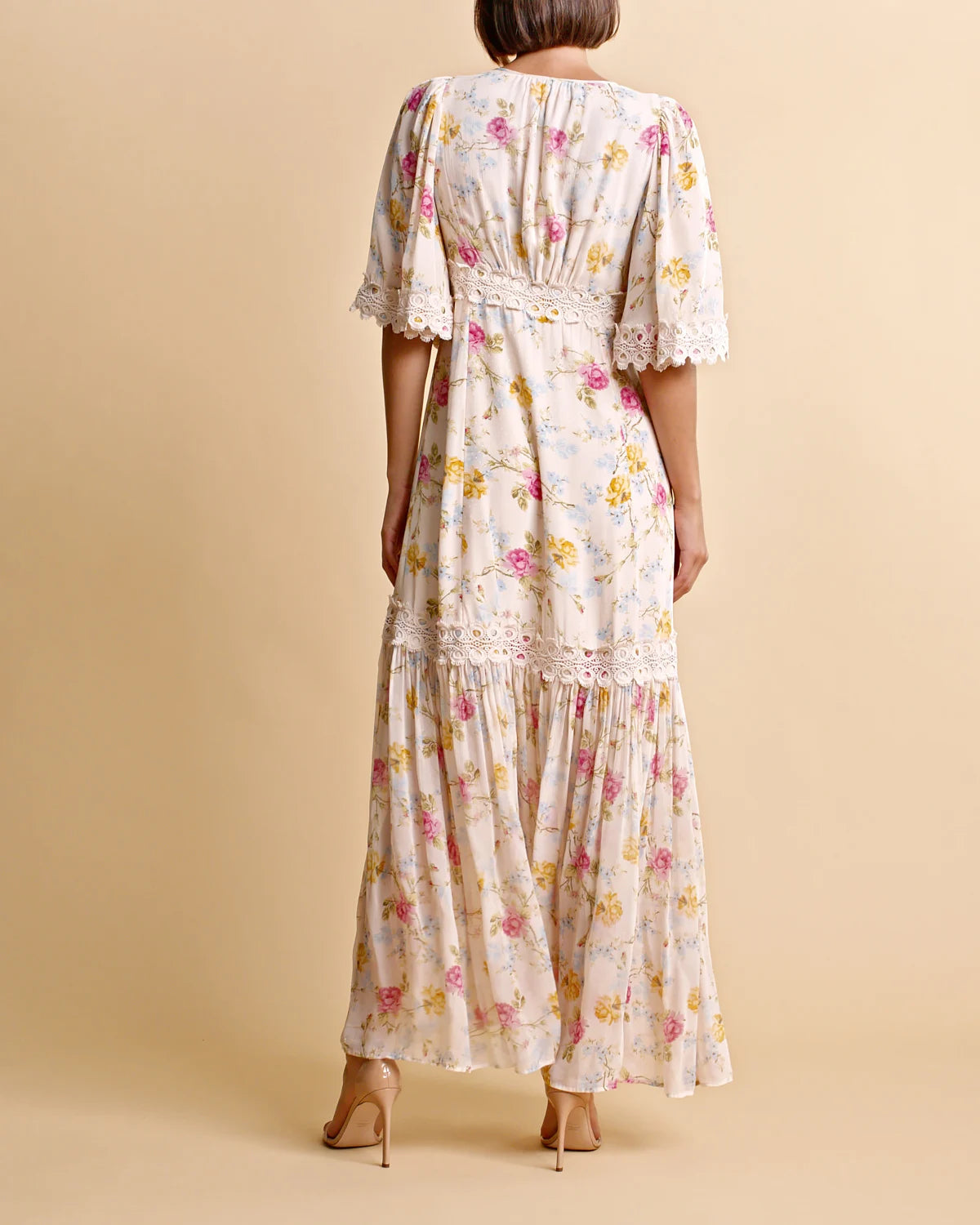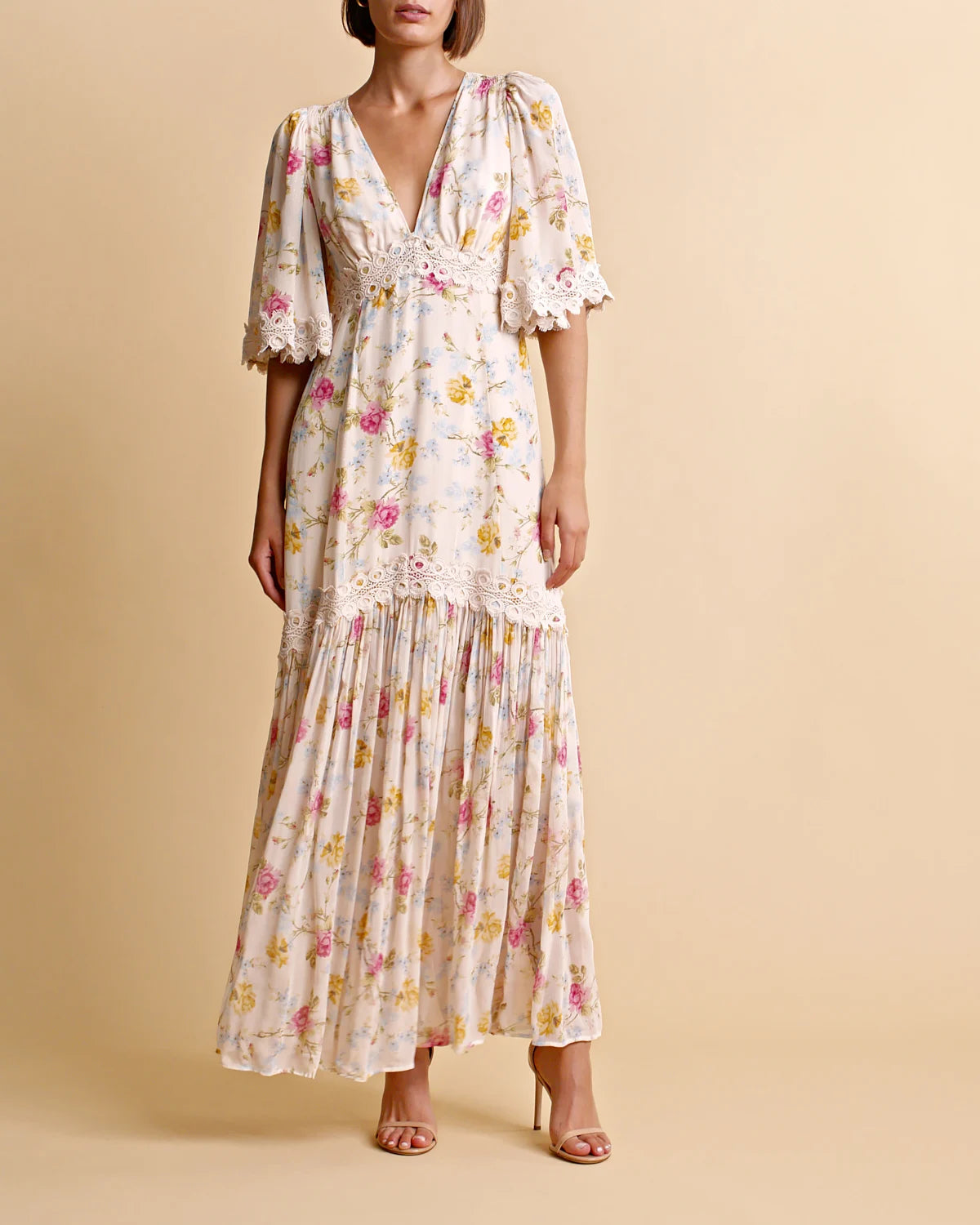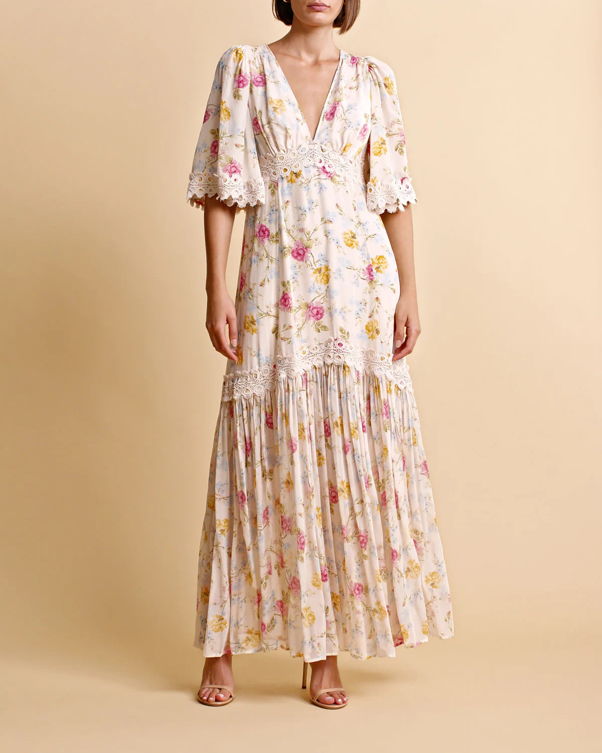 The Satin Embroidery Dress is cut in our soft and shiny FSC certified viscose quality. It has a maxi length, fitted waistline, voluminous skirt, and elbow-length, bell sleeves. The dress has a deep V-neck, and gathers down the middle of the skirt. It has beautiful lace details in the waistline, the cuffs and the skirt. The dress closes in the side with a zipper.