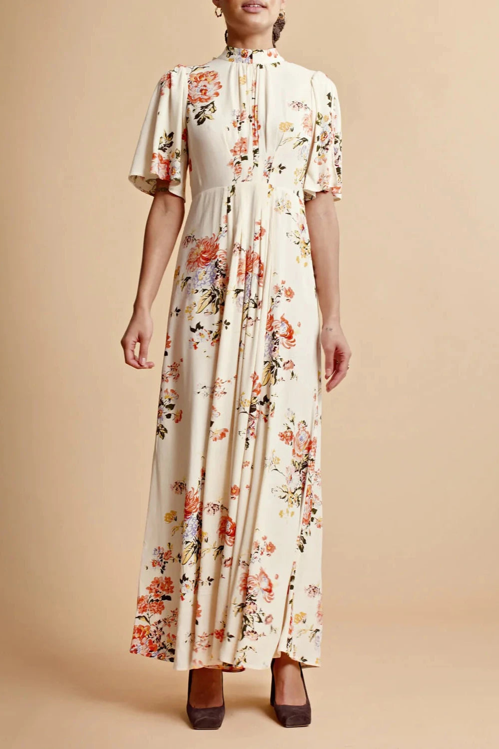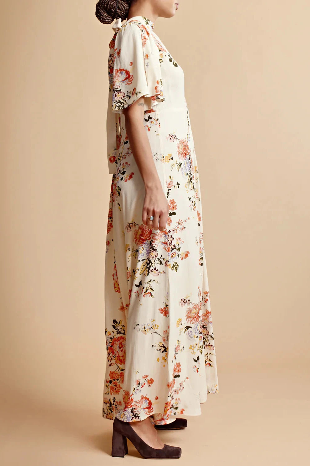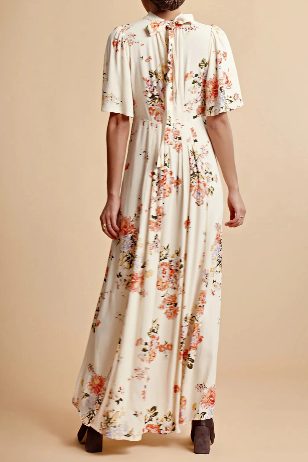 The Summer Tieback Gown is cut in our FSC Certified viscose crepe quality. It has a maxi length, a fitted waistline and elbow-length puffed sleeves made of rouching. The top has a slit detail in the back and a high collar with a tieband attached that can be tied in the back. The top and on the voluminous skirt have a lot of gather details giving a lot of movement to the dress. It closes in the side with a zipper.