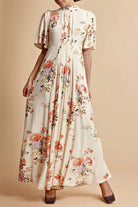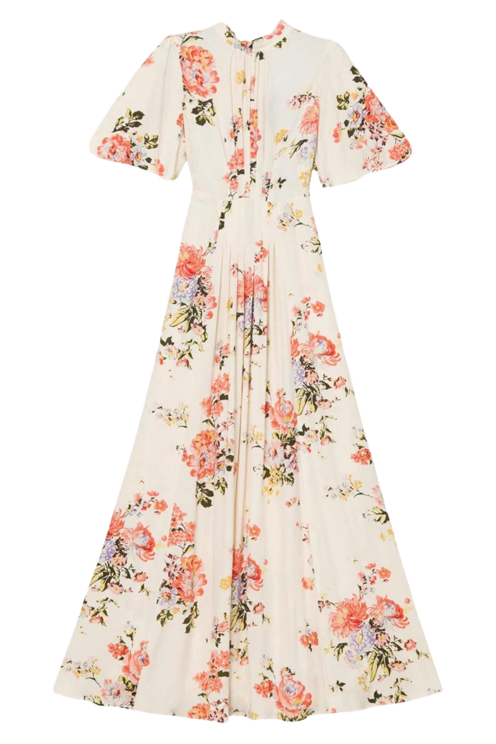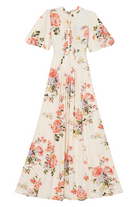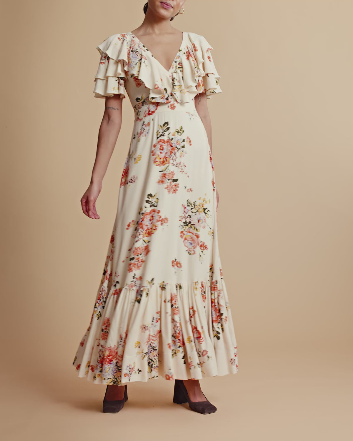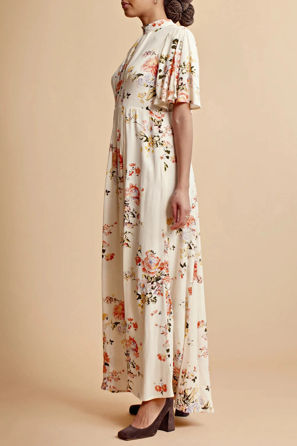 The Summer Tieback Gown is cut in our FSC Certified viscose crepe quality. It has a maxi length, a fitted waistline and elbow-length puffed sleeves made of rouching. The top has a slit detail in the back and a high collar with a tieband attached that can be tied in the back. The top and on the voluminous skirt have a lot of gather details giving a lot of movement to the dress. It closes in the side with a zipper.