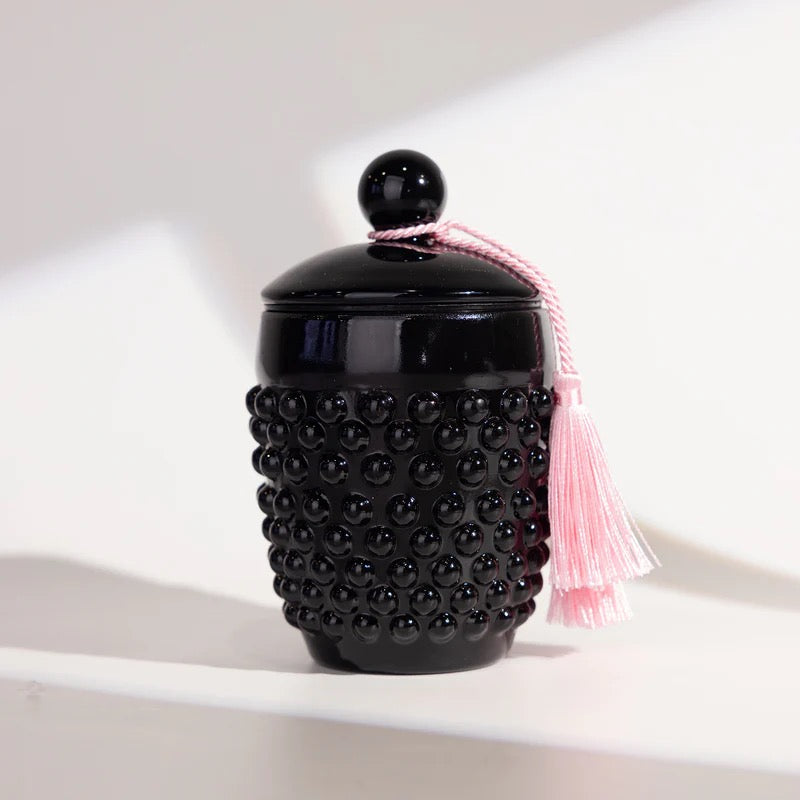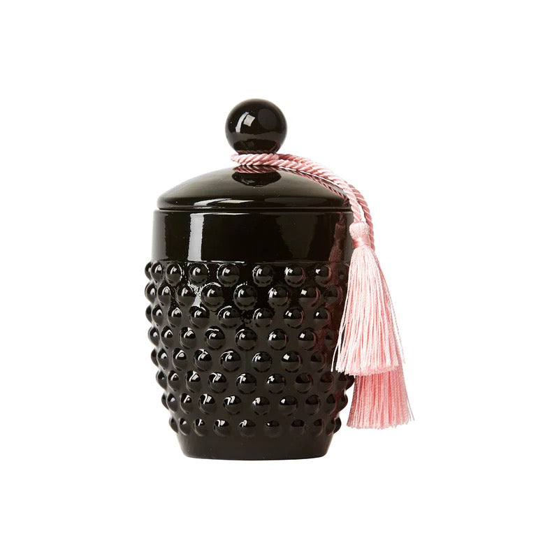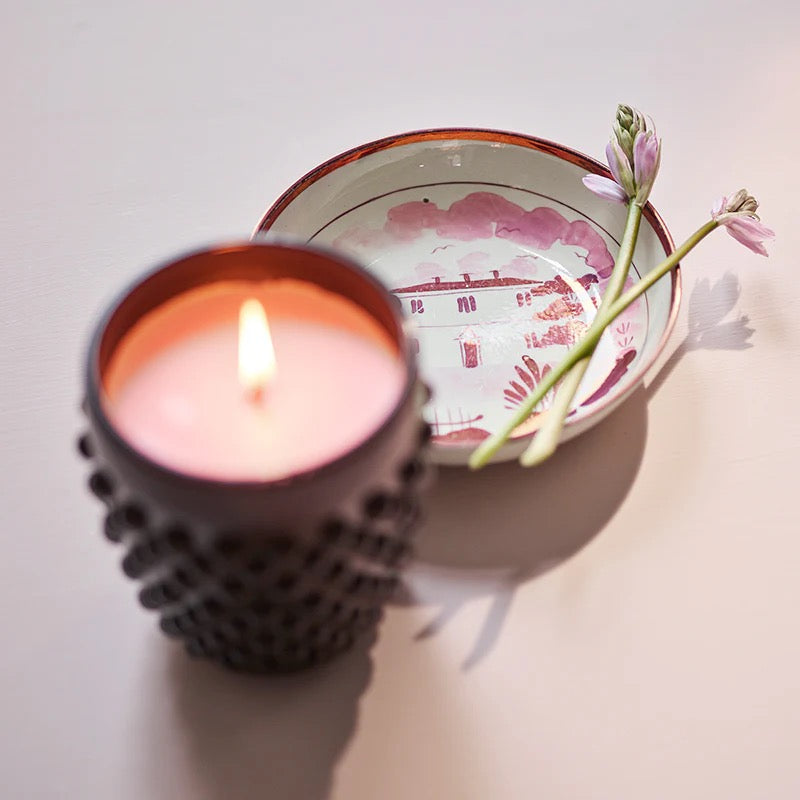 The Marshmallow textured linen box is decorated with a floral pattern, inspired by a classical beautiful English Rose Garden with a touch of Victoriana, and gold foiled for a luxurious feel. The luxurious Hobnail Vessel itself is a sleek, high gloss vessel featuring a lid that can be used as a snuffer too. Finally, this unique vessel has been completed with pink tassel which can also be kept as a keepsake.
