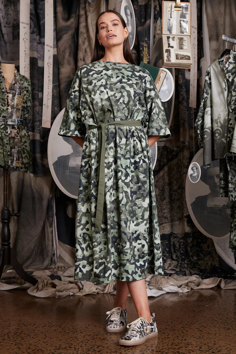 Introducing the Circular by Maud Alice Dainty Jersey Dress! This unique piece features photos of Maud's cars in a playful camouflage print. With an optional belt and a relaxed loose fit, this midi dress is both comfortable and stylish. Stand out from the crowd with this unique tee dress.
